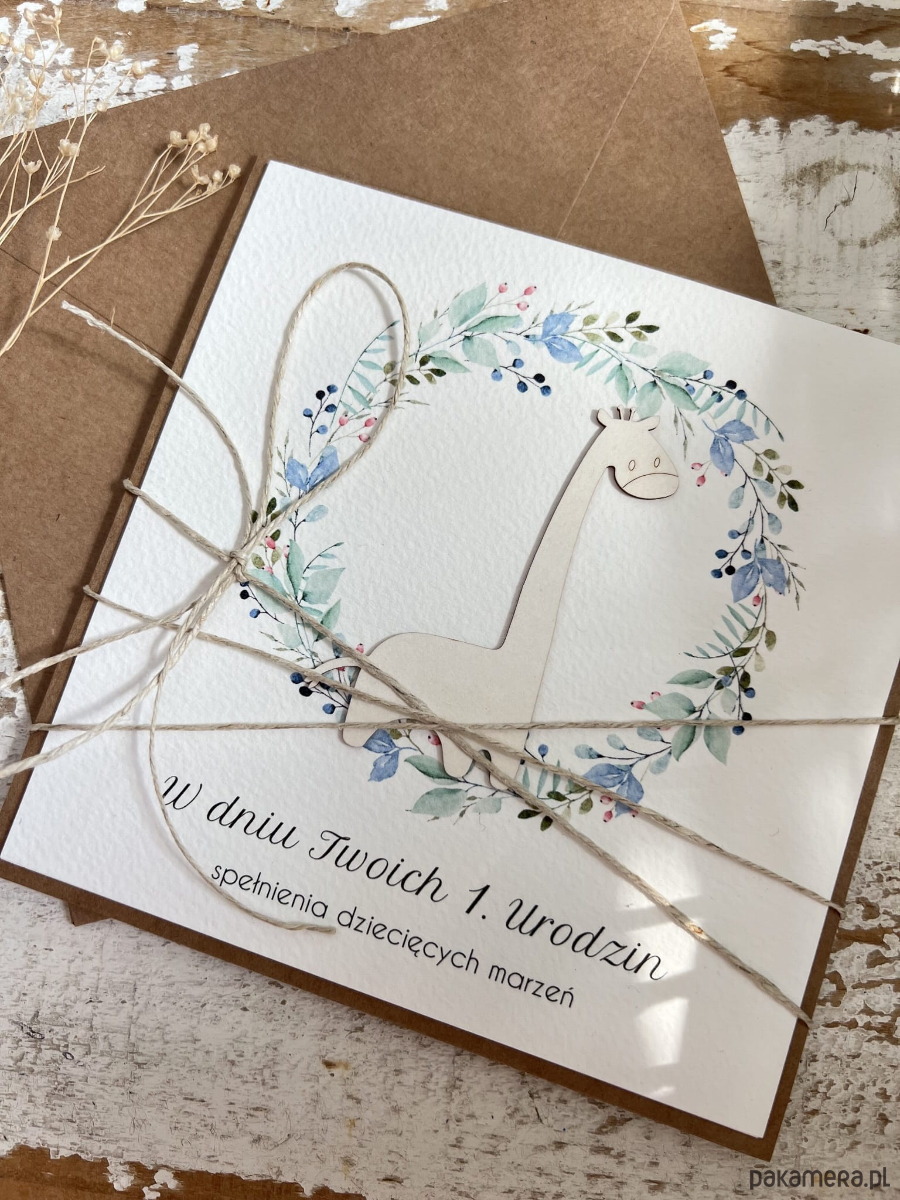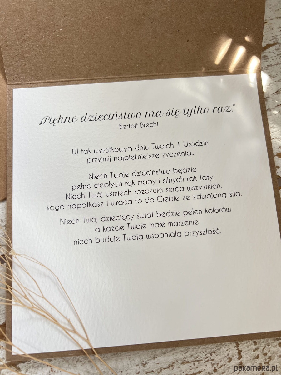 W środku wklejona jest jedna kartka z papieru bawełnianego z życzeniami widocznymi na zdjęciu. Zestaw zawiera kartkę oraz kopertę.