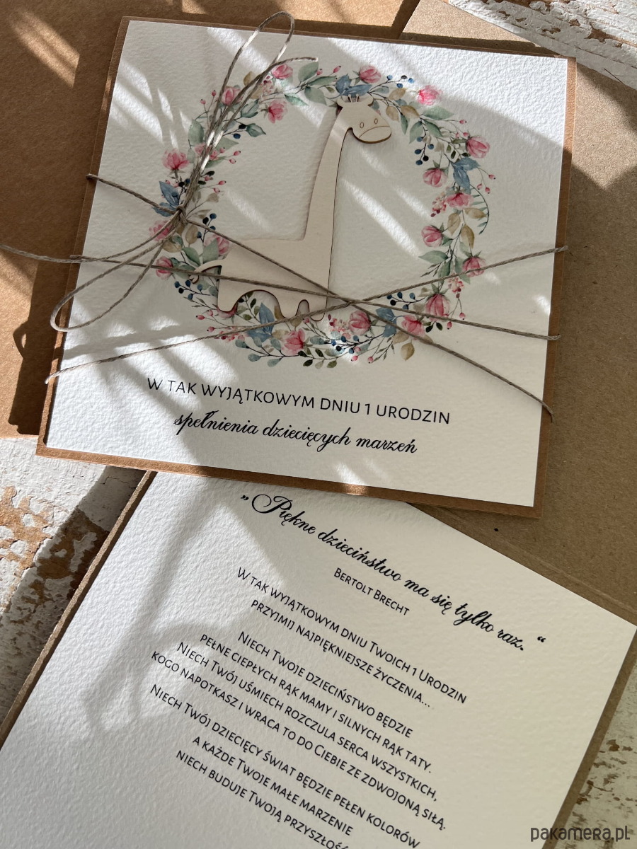 Ręcznie robiona kartka na roczek dla dziewczynki z żyrafą