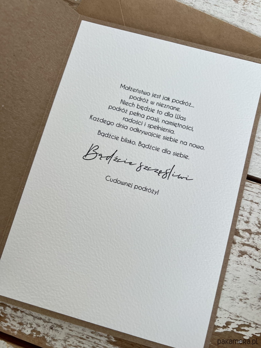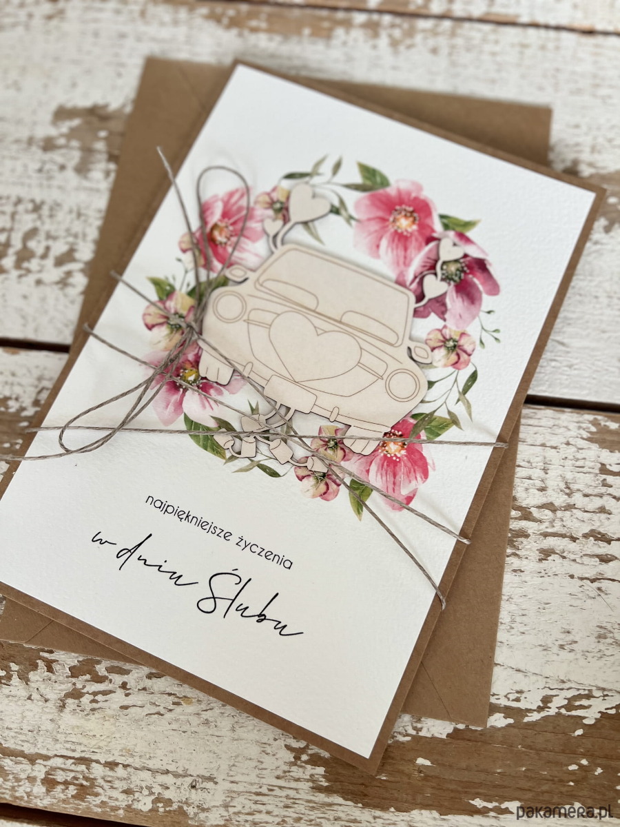 Kartka ślubna wykonana jest na bazie papieru kraftowego z użyciem starannie wyselekcjonowanego papieru bawełnianego w kolorze ecri oraz ozdoby tekturkowej. Kartka przewiązana jest lnianym sznureczkiem.