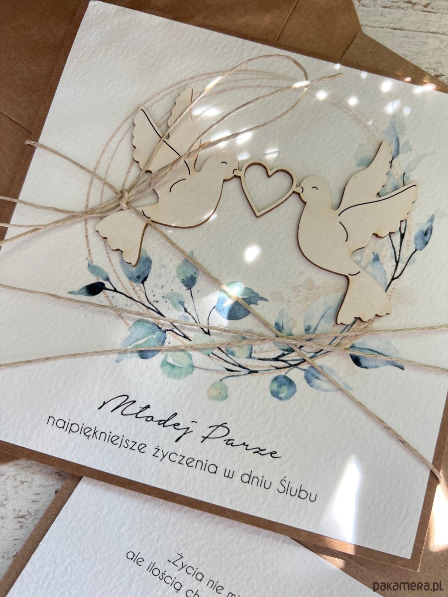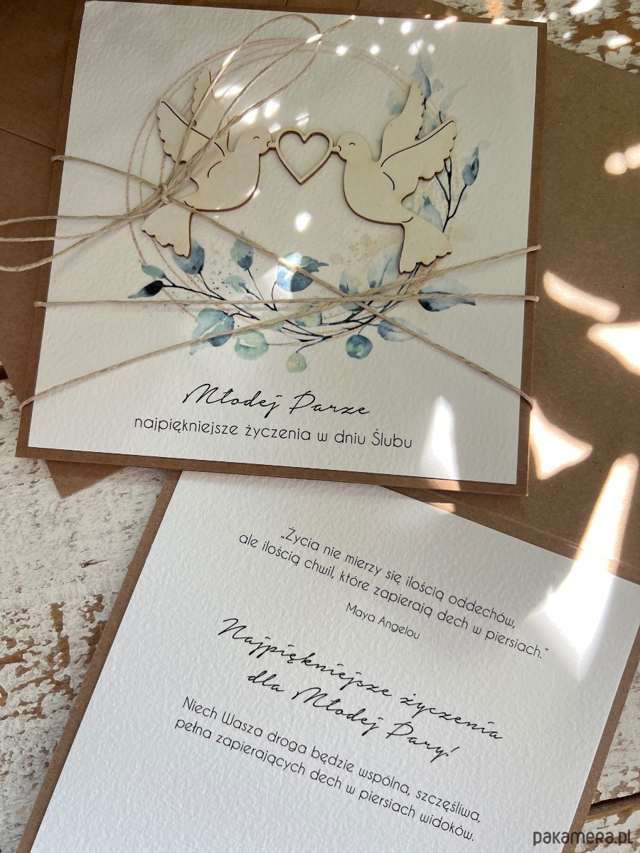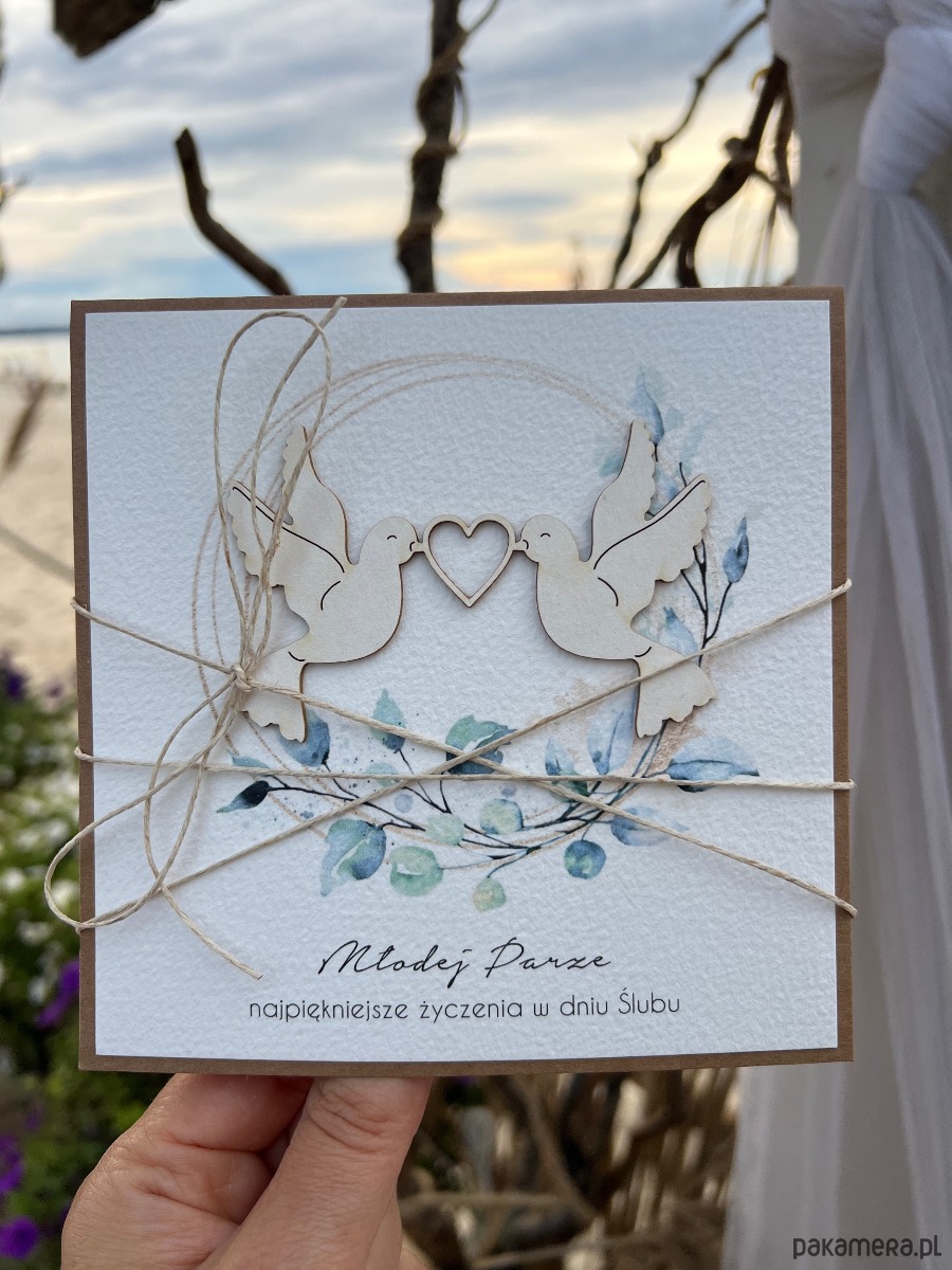 Wyjątkowa kartka ślubna wykonana z produktów eko w tym z papieru kraftowego, bawełnianego 100% w odcieniu śmietanki, tekturkowej ozdoby, przewiązana lnianym sznureczkiem.