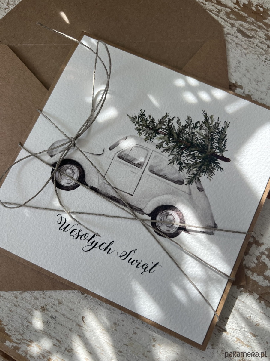 Kartka o wymiarach 14x14 cm wykonana jest z papieru kraftowego oraz papieru bawełnianego z nadrukiem.Kartka otwierana do góry.