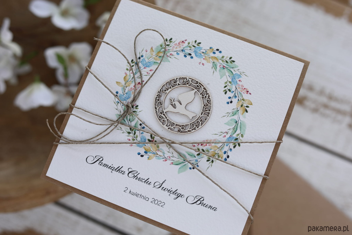 Rustykalna kartka na chrzest handmade wykonana na bazie papieru kraftowego z użyciem starannie wyselekcjonowanego papieru bawełnianego w kolorze ecri oraz tekturkowej ozdoby. Kartka otwierana jest do góry. Kartka przewiązana jest lnianym sznureczkiem.