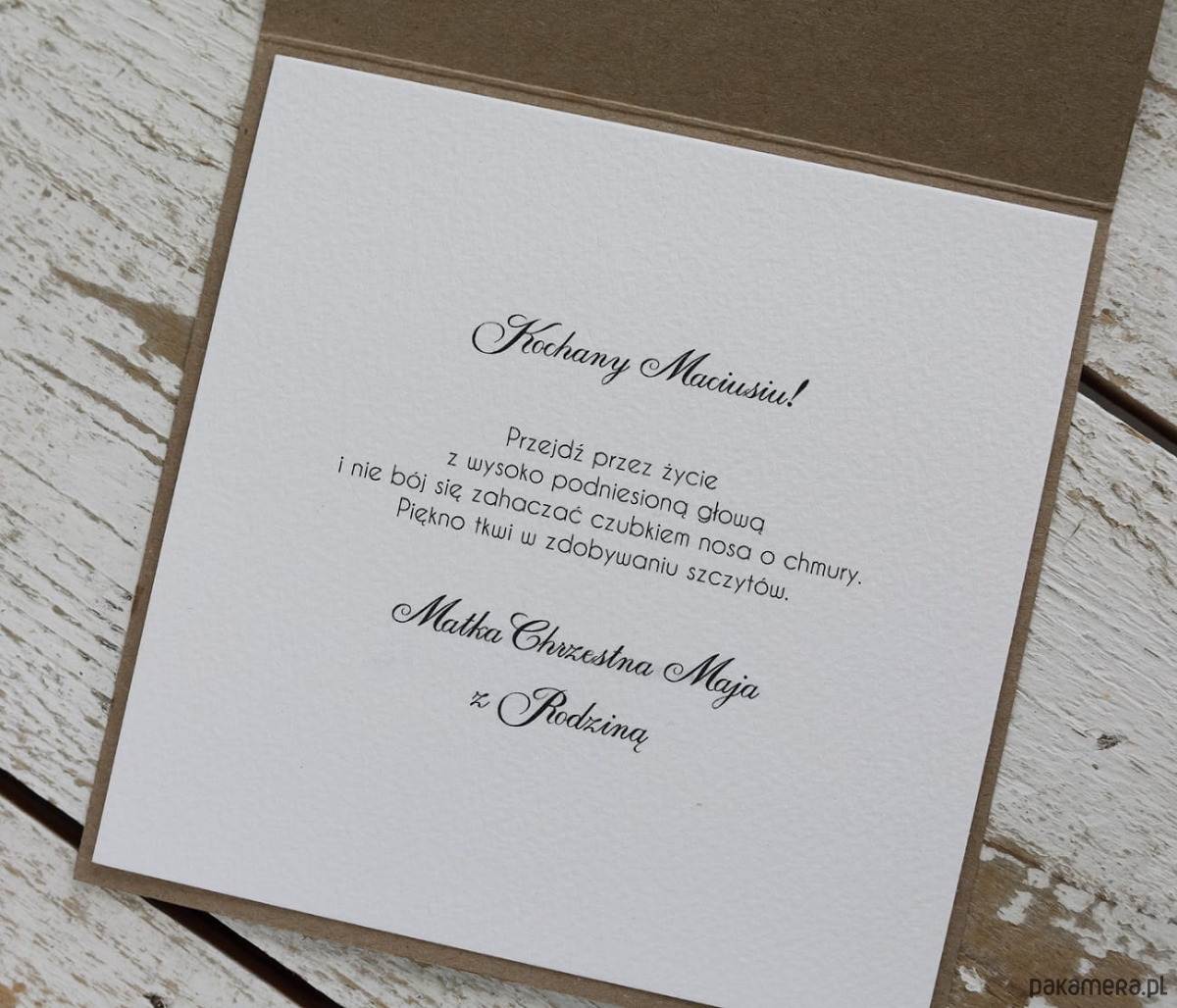 W środku wklejona jest jedna kartka z papieru bawełnianego z życzeniami bądź kartka pusta, gotowa do wpisania życzeń własnoręcznie.
