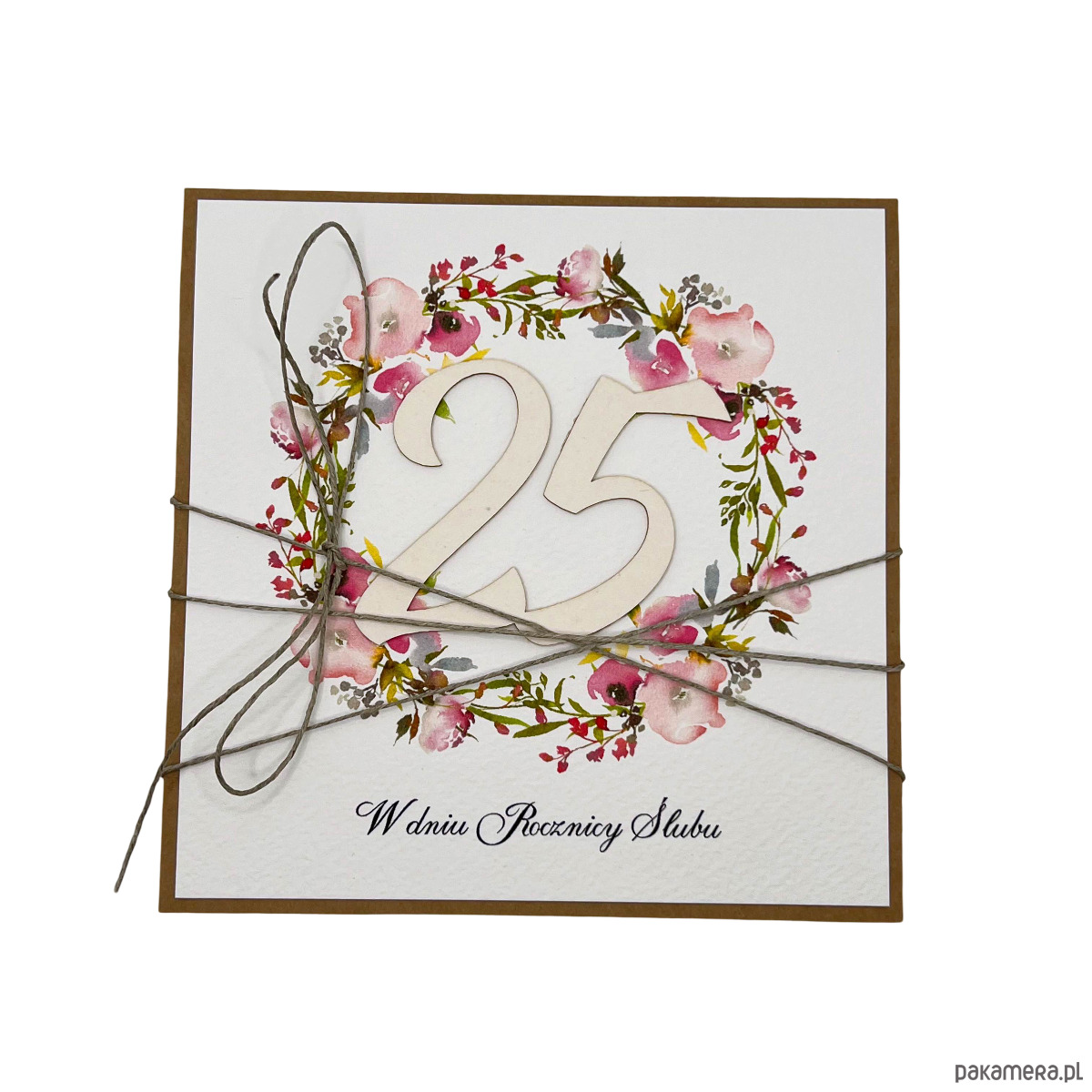 Kartka rocznicowa ręcznie robiona wykonana jest na bazie papieru kraftowego z użyciem starannie wyselekcjonowanego papieru bawełnianego w kolorze śmietanki z nadrukiem oraz tekturkową ozdobą. Kartka przewiązana jest lnianym sznureczkiem.
