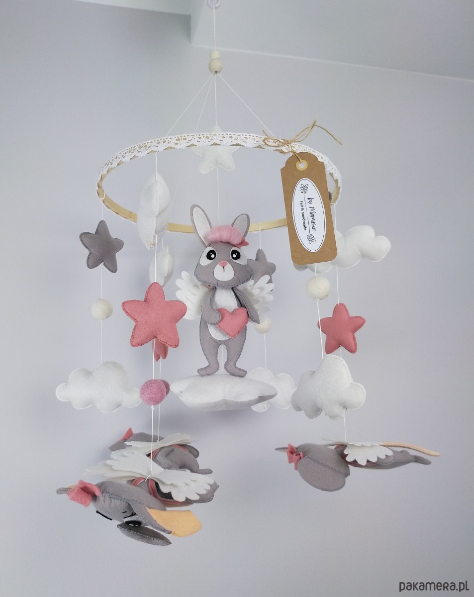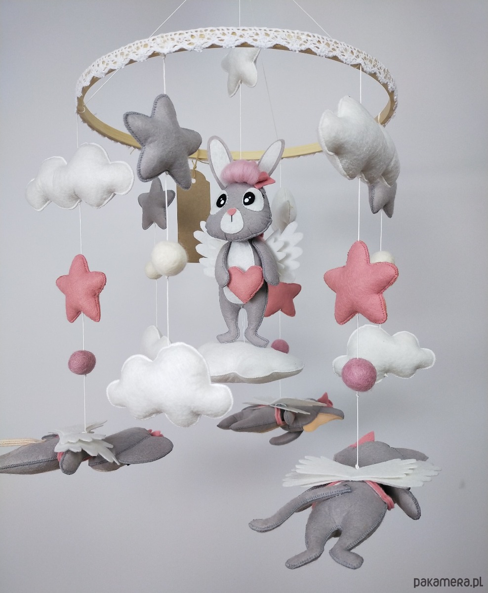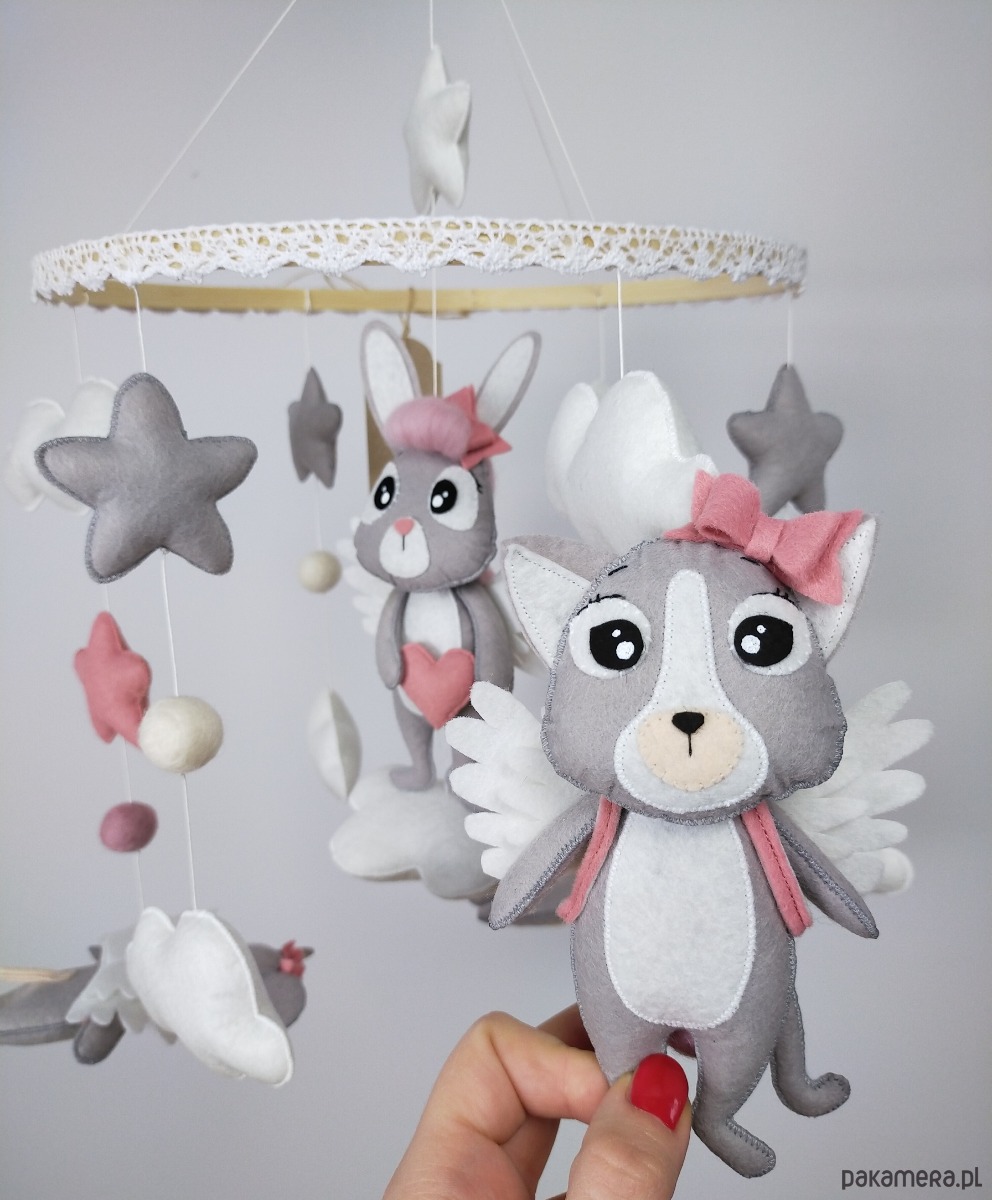 Bajkowa karuzela handmade w subtelnych, neutralnych kolorach, idealna dla małej odkrywczyni i miłośniczki zwierzątek. W centrum na miękkiej chmurce siedzi szary króliczek z różowymi włoskami z wełny czesankowej, trzymający w łapkach filcowe różowe serduszko, a na plecach ma delikatne białe skrzydełka. Na bambusowej obręczy, ustawione poziomo w stronę dziecka, wiszą trzy urocze zwierzaki: kotek, słonik i myszka – wszystkie w odcieniach szarości z białymi skrzydełkami, tak by maluch mógł je podziwiać z bliska. Karuzelę uzupełniają różowe i szare gwiazdki oraz białe chmurki, które nadają całości lekkości i przytulnego charakteru. Obręcz została ozdobiona białą koronką, która subtelnie podkreśla wyjątkowość ręcznie wykonanej dekoracji.