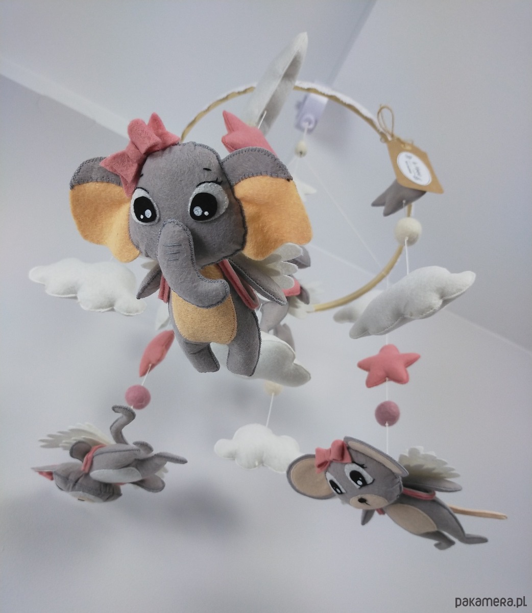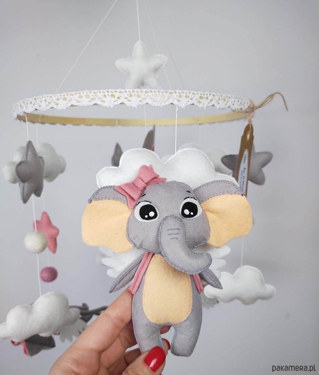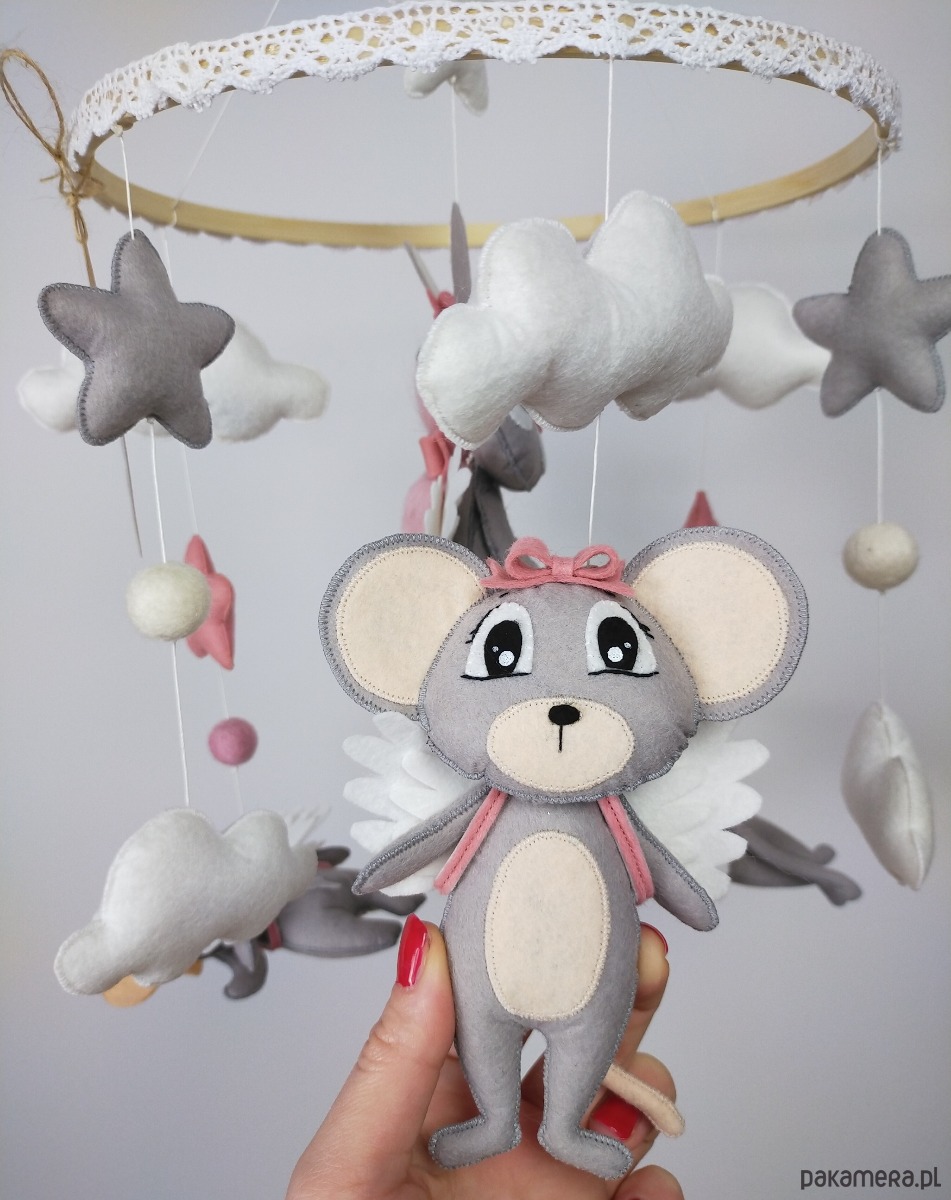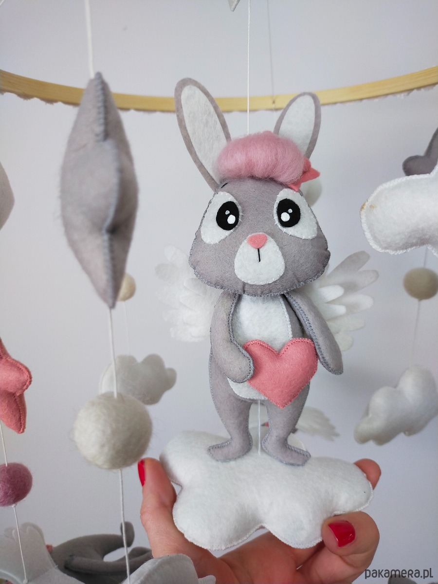 Bajkowa karuzela handmade w subtelnych, neutralnych kolorach, idealna dla małej odkrywczyni i miłośniczki zwierzątek. W centrum na miękkiej chmurce siedzi szary króliczek z różowymi włoskami z wełny czesankowej, trzymający w łapkach filcowe różowe serduszko, a na plecach ma delikatne białe skrzydełka. Na bambusowej obręczy, ustawione poziomo w stronę dziecka, wiszą trzy urocze zwierzaki: kotek, słonik i myszka – wszystkie w odcieniach szarości z białymi skrzydełkami, tak by maluch mógł je podziwiać z bliska. Karuzelę uzupełniają różowe i szare gwiazdki oraz białe chmurki, które nadają całości lekkości i przytulnego charakteru. Obręcz została ozdobiona białą koronką, która subtelnie podkreśla wyjątkowość ręcznie wykonanej dekoracji.