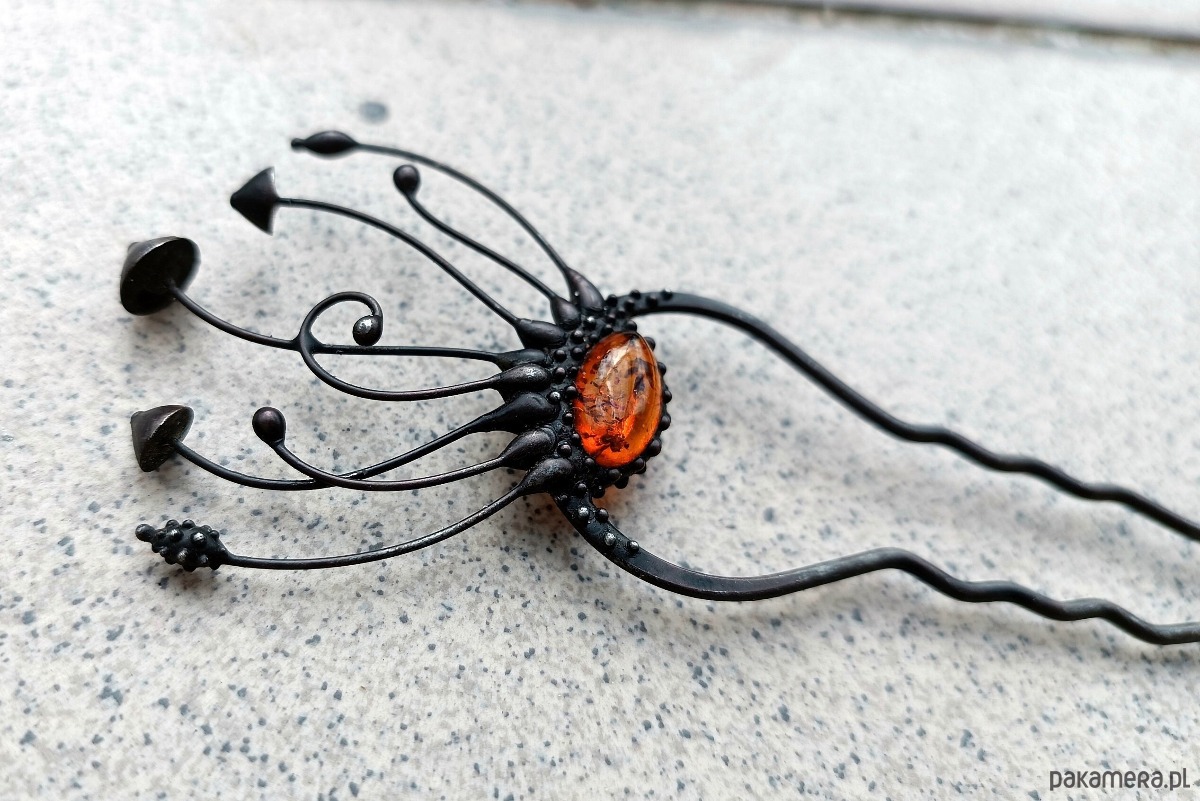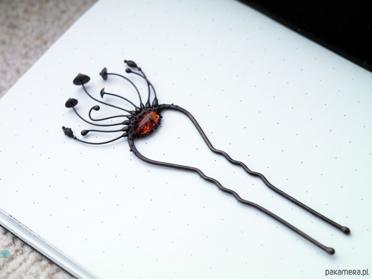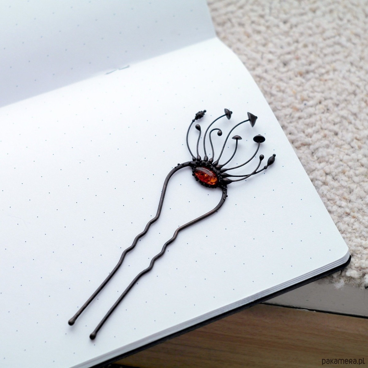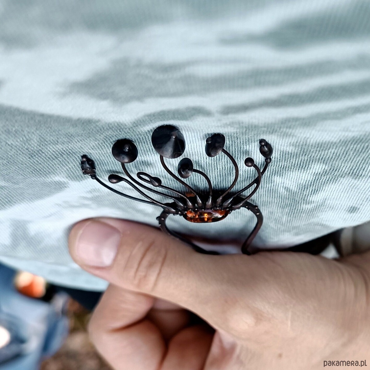 Ręcznie robiona metalowa spinka do włosów z motywem magicznych grzybów, w stylu boho hippie, wykonana z miedzi, cyny, stali i bursztynu. Pokryta środkiem przeciwutleniającym, szlifowana, polerowana. Niezwykła i jasna spinka do włosów z motywem psychodelicznych grzybów leśnych. Wszystkie elementy są wykonane ręcznie, co zapewnia indywidualność każdego produktu wytworzonego w warsztacie Yadovito. Stop cyny i miedzi jest polerowany roztworem wykończeniowym, aby nadać biżuterii szlachetny wygląd, a jednocześnie zapobiec utlenianiu się metalu. Rozmiar około 14,5/5 cm. Kolor czarny/brązowy.