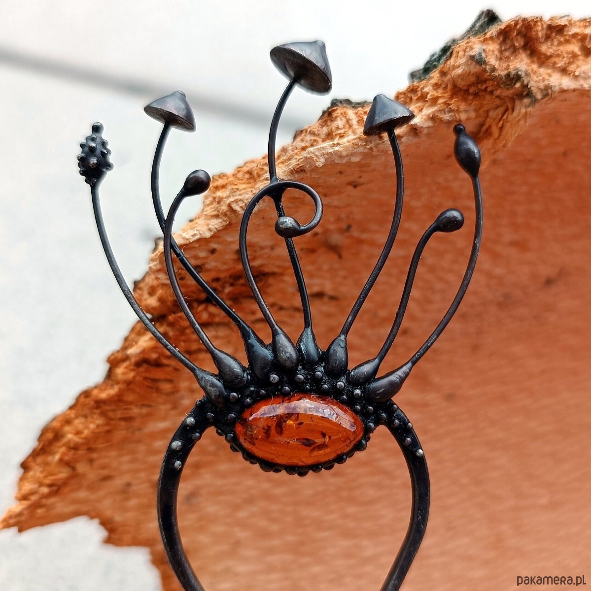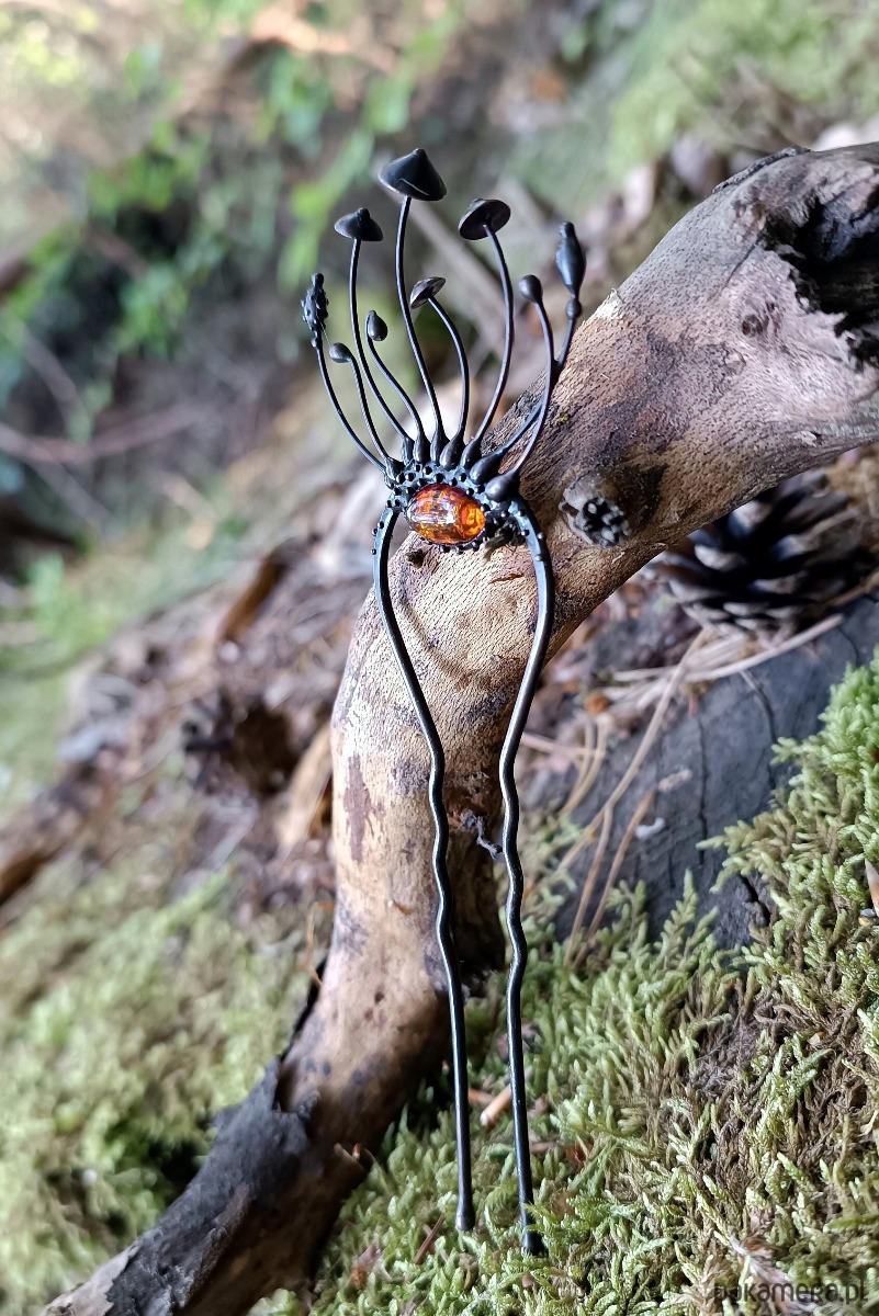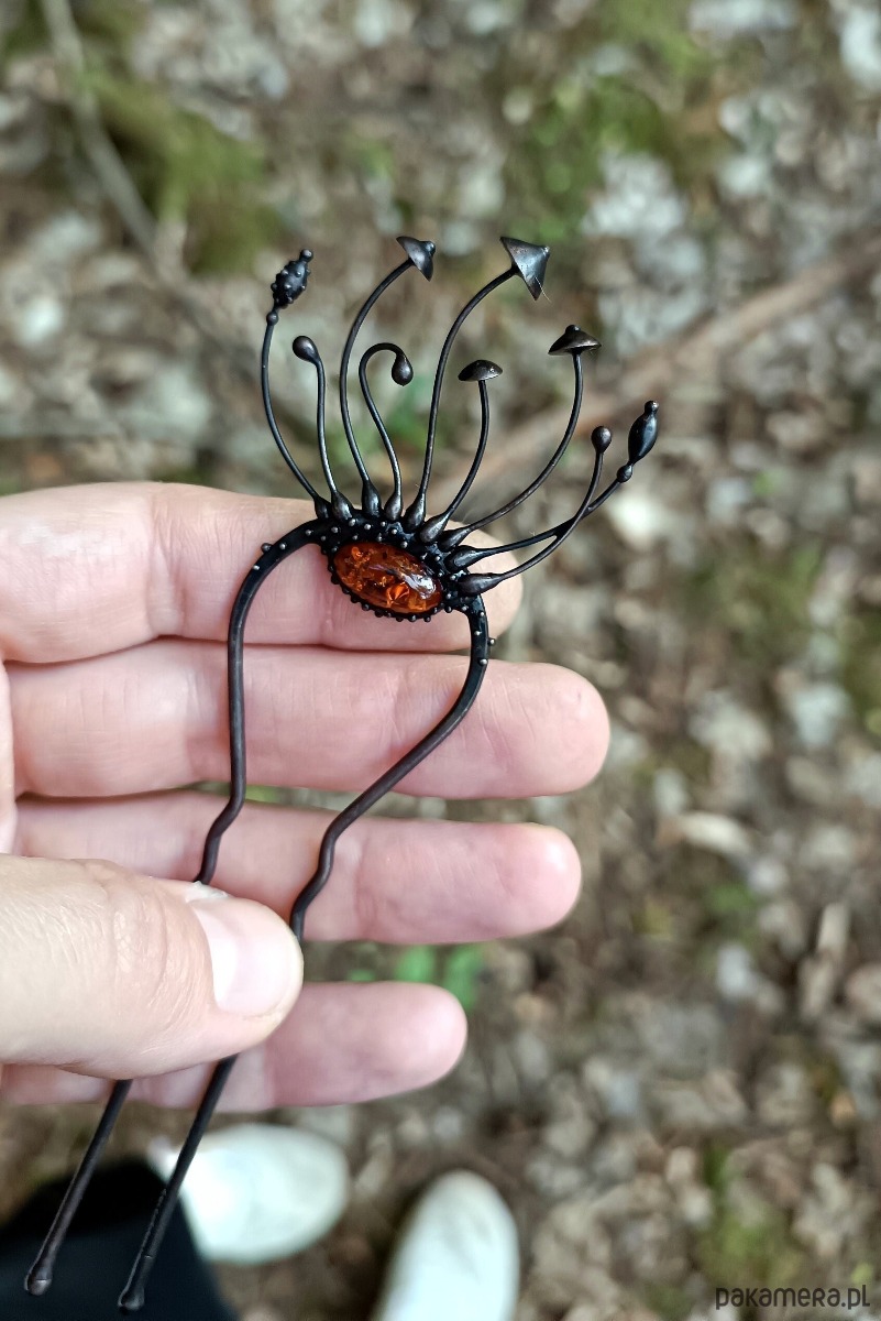 Ręcznie robiona metalowa spinka do włosów z leśnymi grzybami i bursztynem