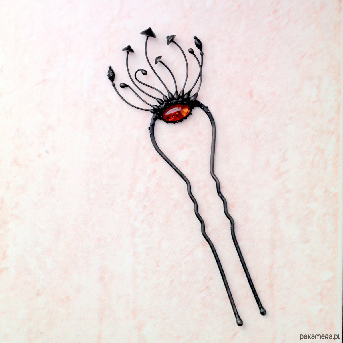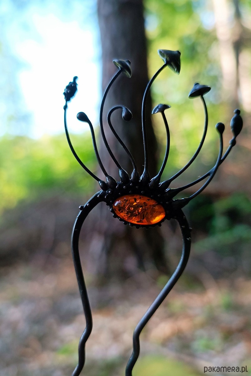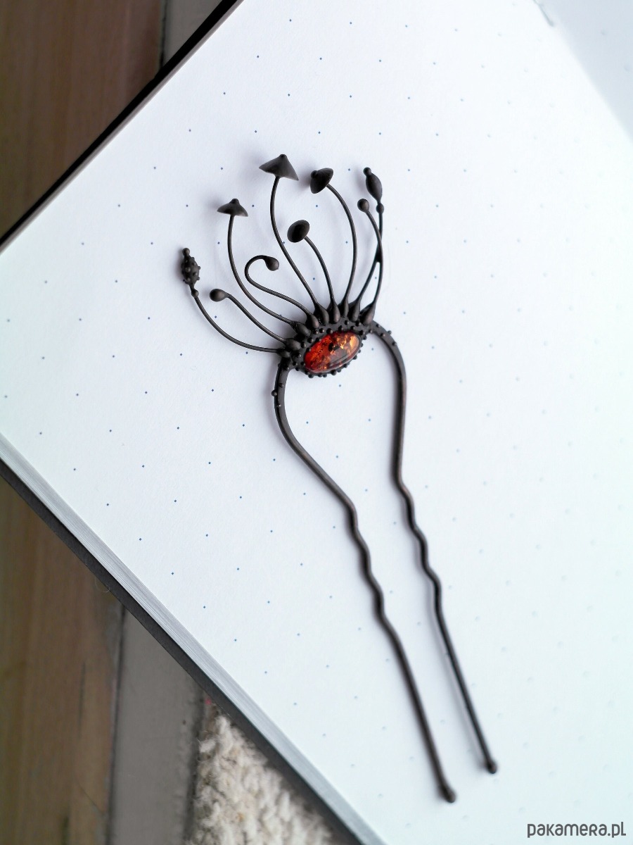 Ręcznie robiona metalowa spinka do włosów z leśnymi grzybami i bursztynem