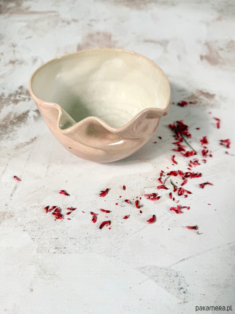 Powstała z jasnej gliny i została pokryta delikatnym, pudroworóżowym szkliwem na zewnątrz, z kontrastującym, subtelnie mlecznobiałym wnętrzem. Jej miękka, falująca linia nadaje jej rzeźbiarski charakter – każda sztuka jest jedyna w swoim rodzaju.