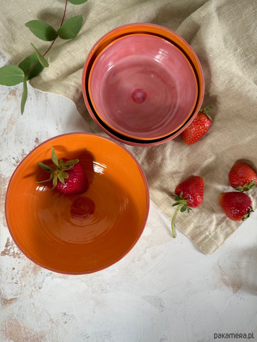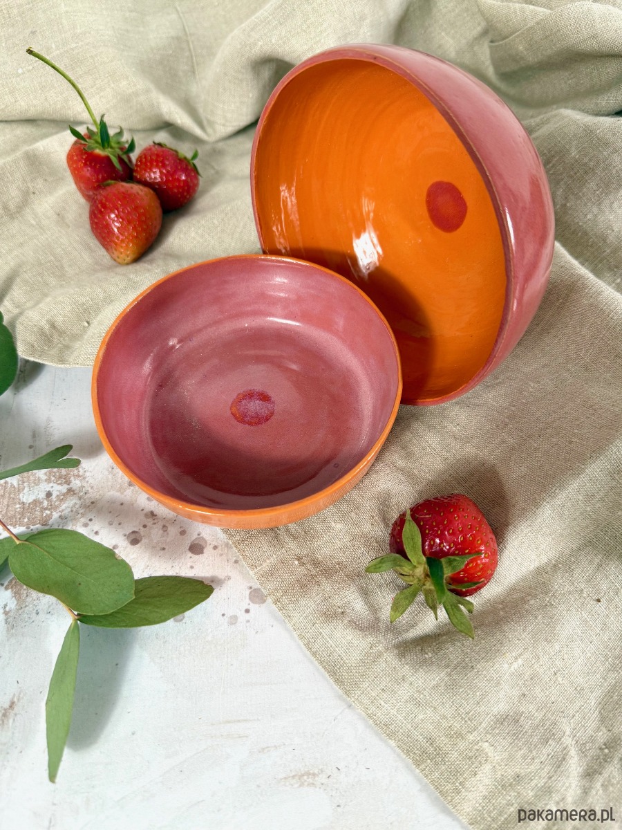 Minimalistyczna, a jednocześnie przyciągająca uwagę miska wykonana ręcznie z jasnej gliny. Z zewnątrz pokryta intensywnym, ciepłym odcieniem pomarańczy, wewnątrz zaskakuje subtelnym, truskawkowym różem z delikatnym, organicznym wykończeniem.