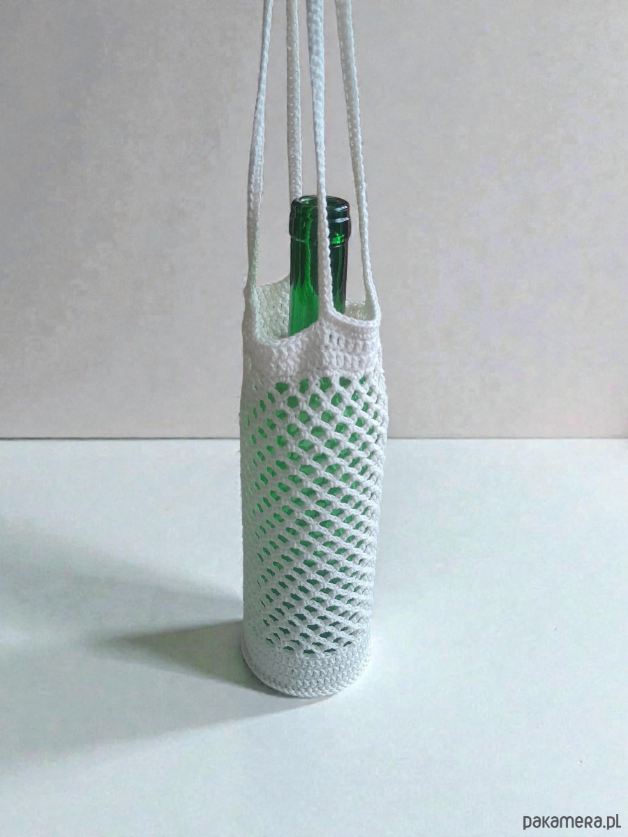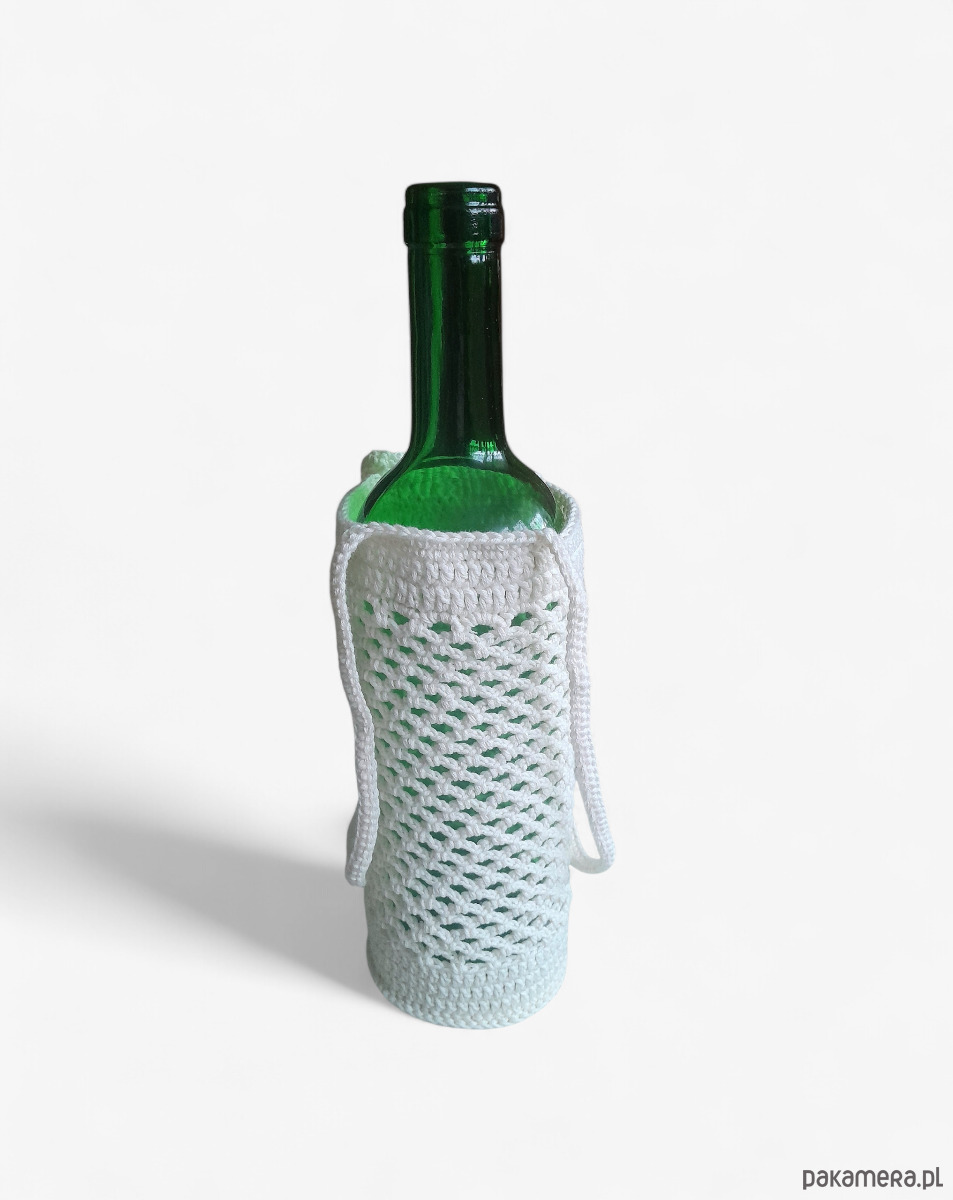 Delikatna, a jednocześnie solidna osłonka na butelkę wykonana ręcznie na szydełku z naturalnej, 100% bawełny. Idealna na wino, nalewki lub domowe przetwory — sprawdzi się jako wyjątkowy dodatek na stół, prezent świąteczny, ślubny, urodzinowy lub host gift na odwiedziny.