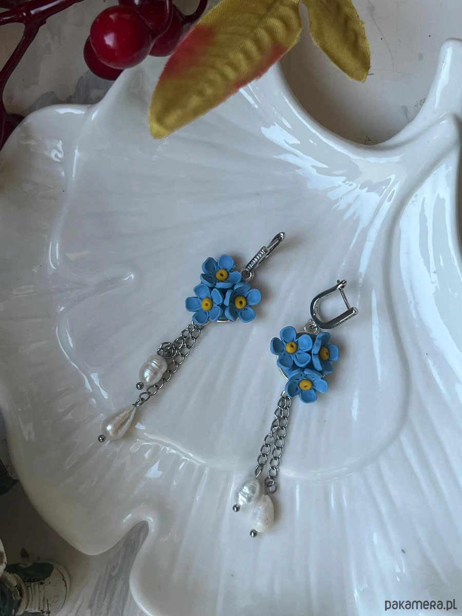 Niebieskie kwiatki z gliny polimerowej i naturalna perła tworzą połączenie elegancji i subtelności.