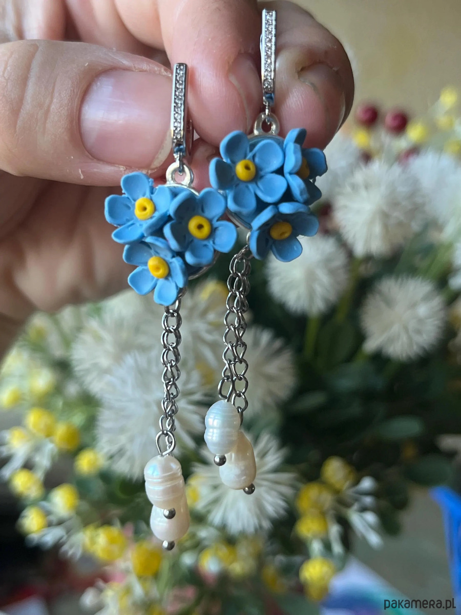 Ręcznie robione kolczyki z niebieskimi kwiatkami i perłami