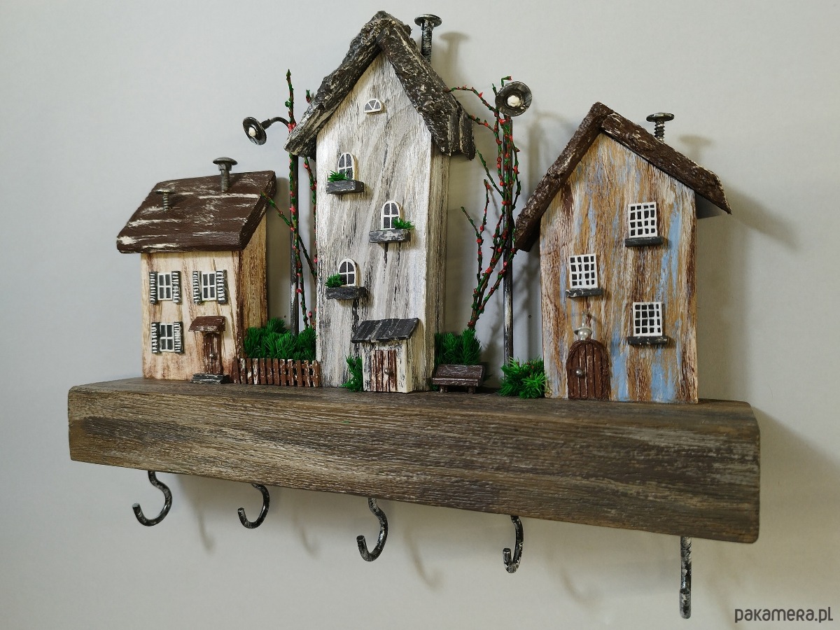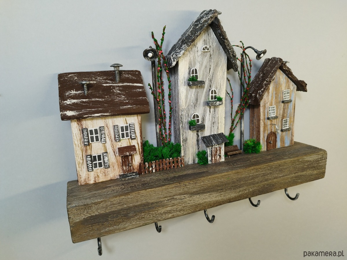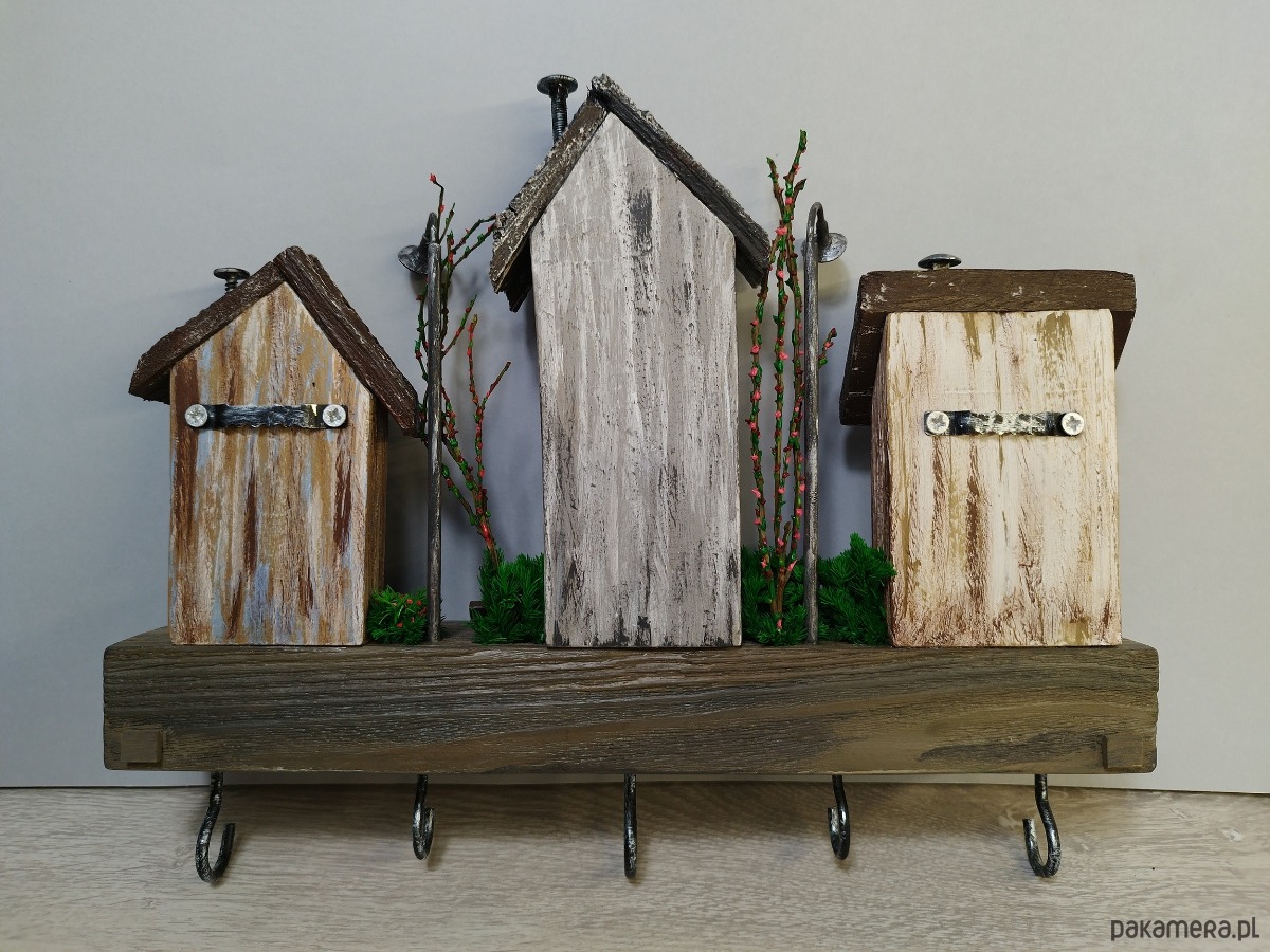 Ten drewniany wieszak na klucze wykonany jest z drewna. Te małe drewniane domki są wykonane z odzyskanego drewna oraz śrub, gwoździ, śrub, podkładek i innych elementów. Domki są ręcznie malowane ekologicznymi farbami na bazie wody. Wszystkie używane przeze mnie materiały są ekologiczne i pochodzą z napraw i recyklingu. Daję drugie życie starym, zapomnianym materiałom.