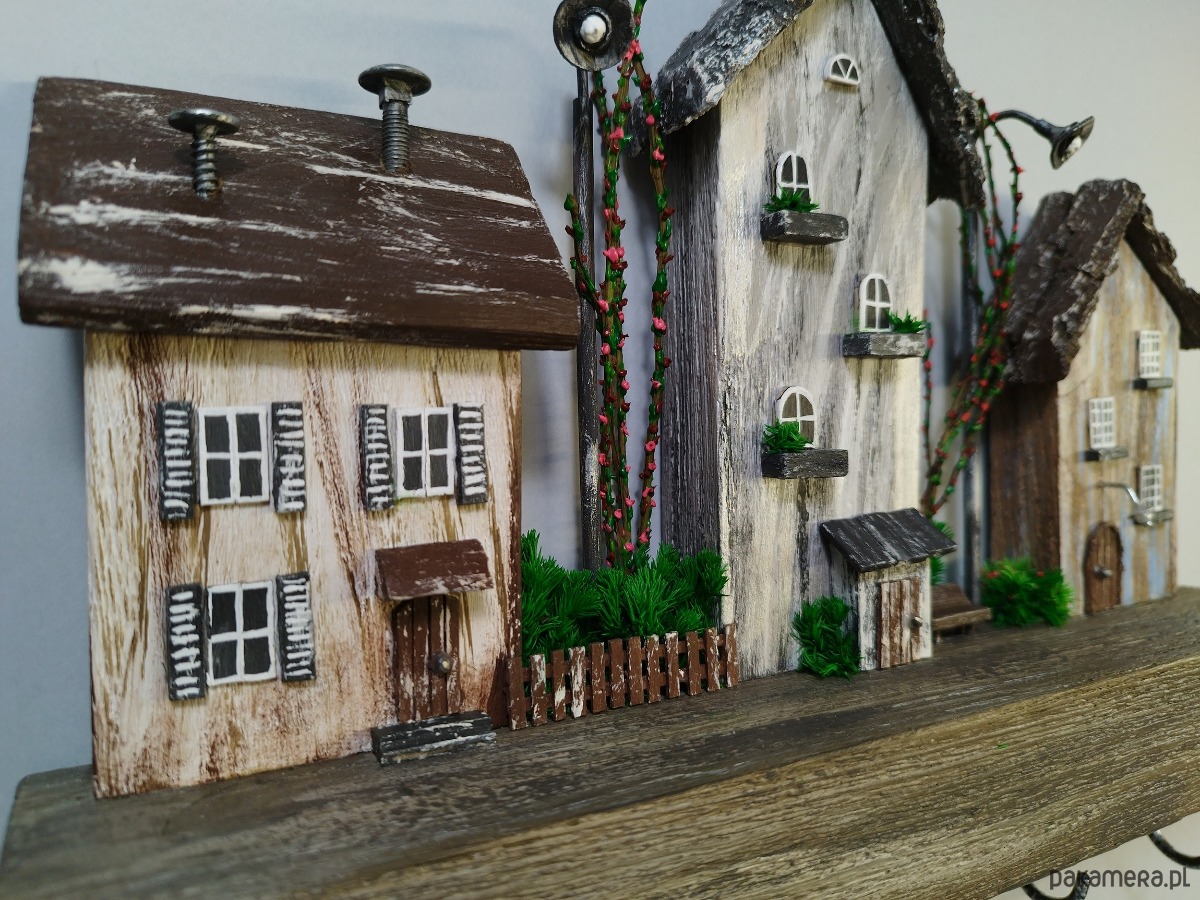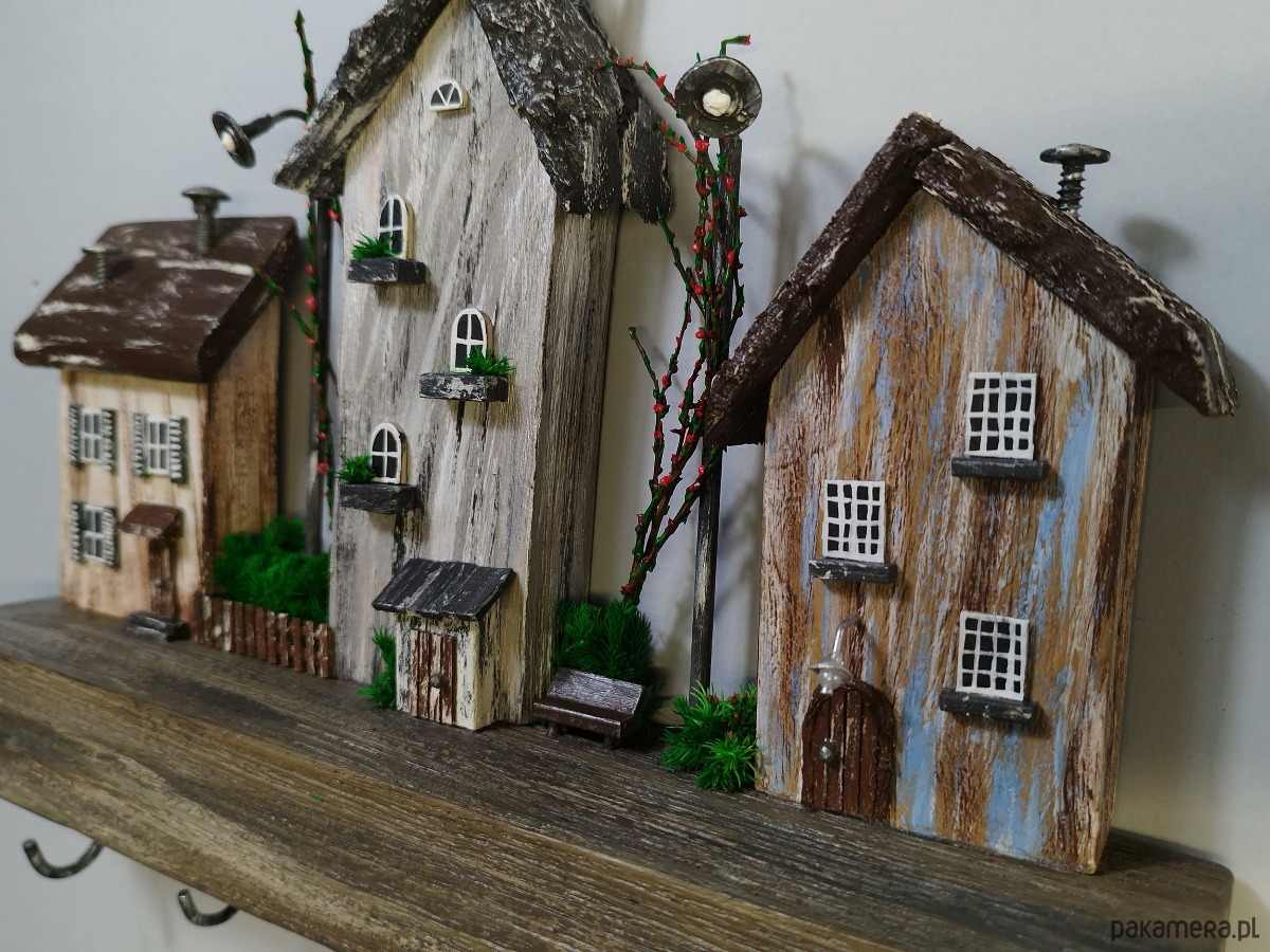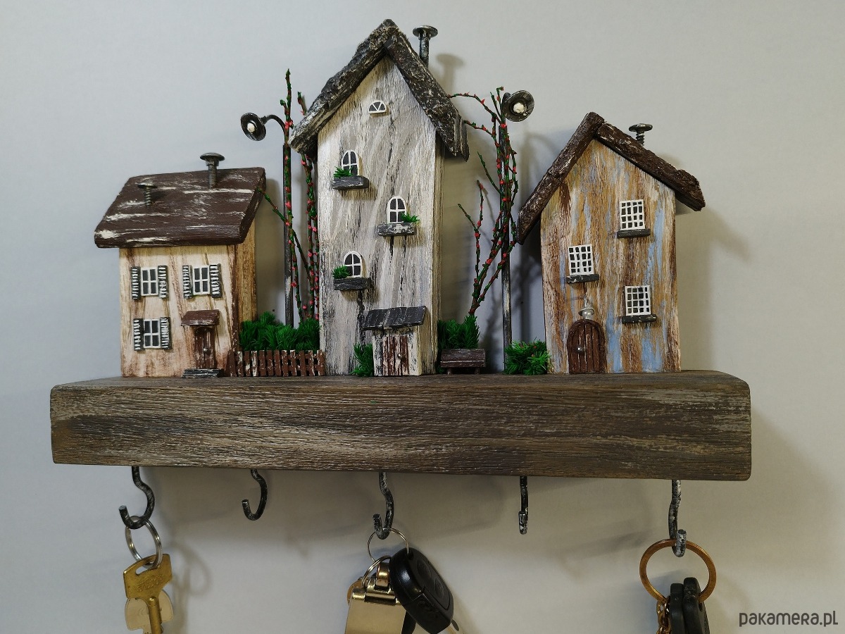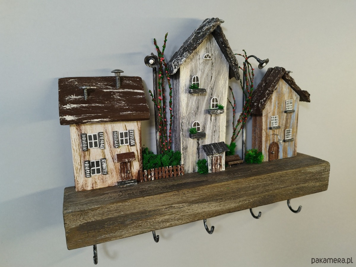 Ten drewniany wieszak na klucze wykonany jest z drewna. Te małe drewniane domki są wykonane z odzyskanego drewna oraz śrub, gwoździ, śrub, podkładek i innych elementów. Domki są ręcznie malowane ekologicznymi farbami na bazie wody. Wszystkie używane przeze mnie materiały są ekologiczne i pochodzą z napraw i recyklingu. Daję drugie życie starym, zapomnianym materiałom.