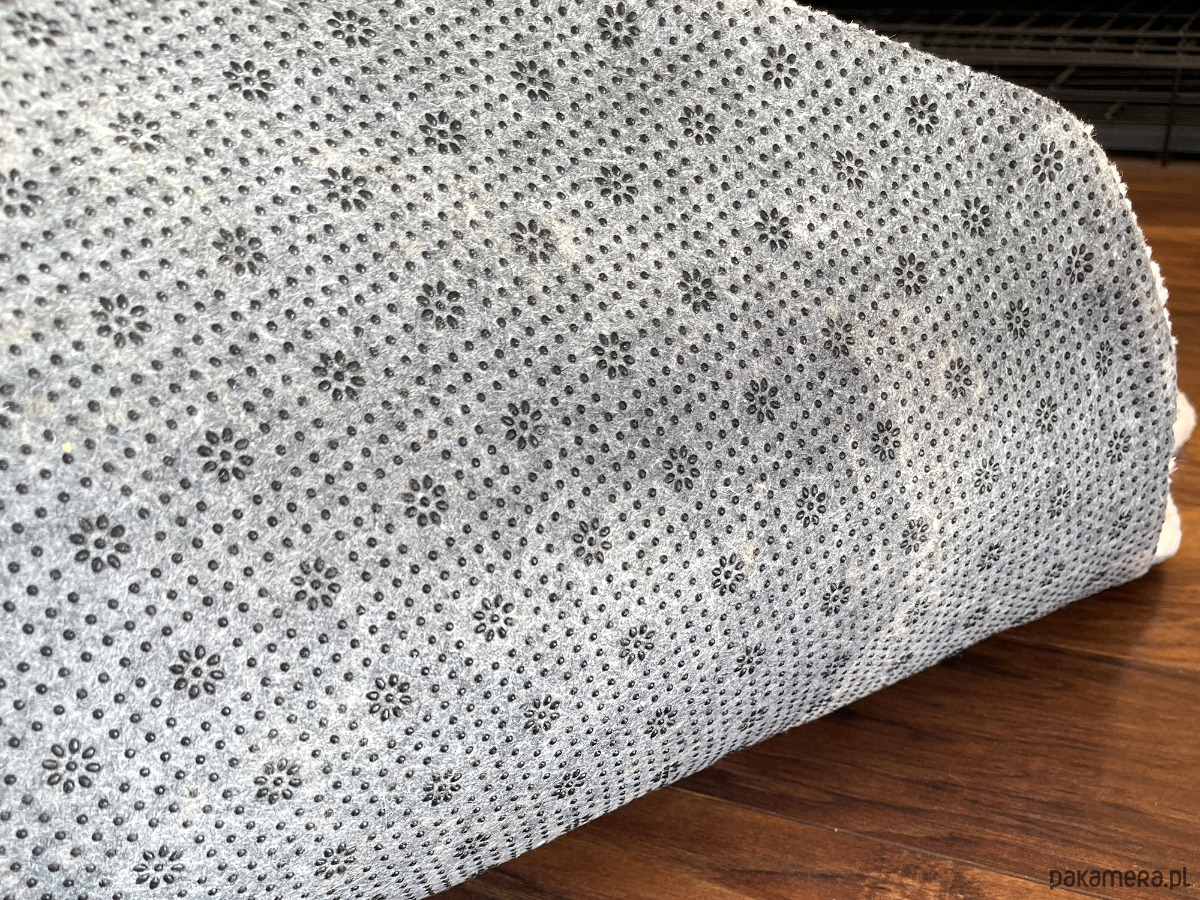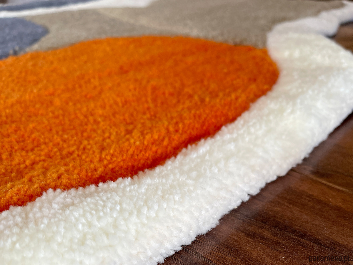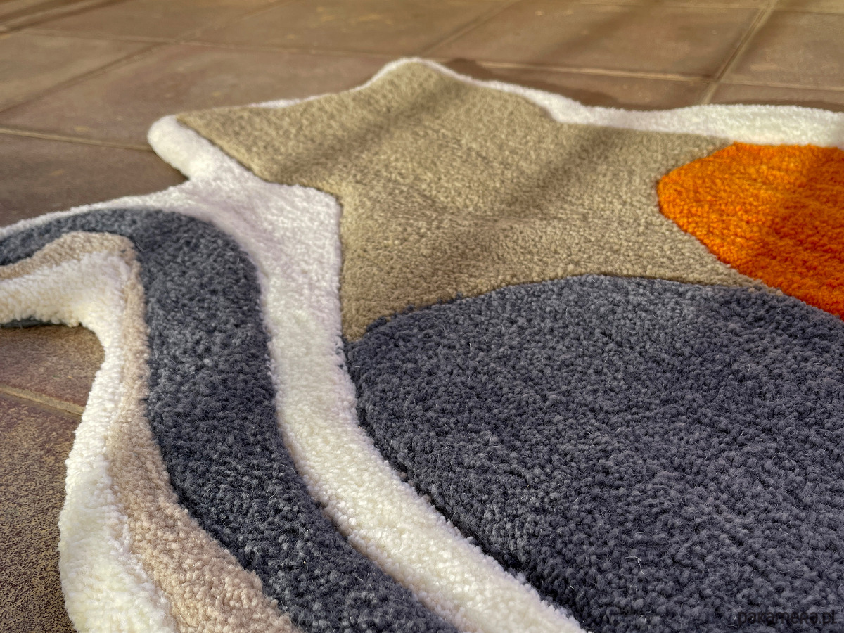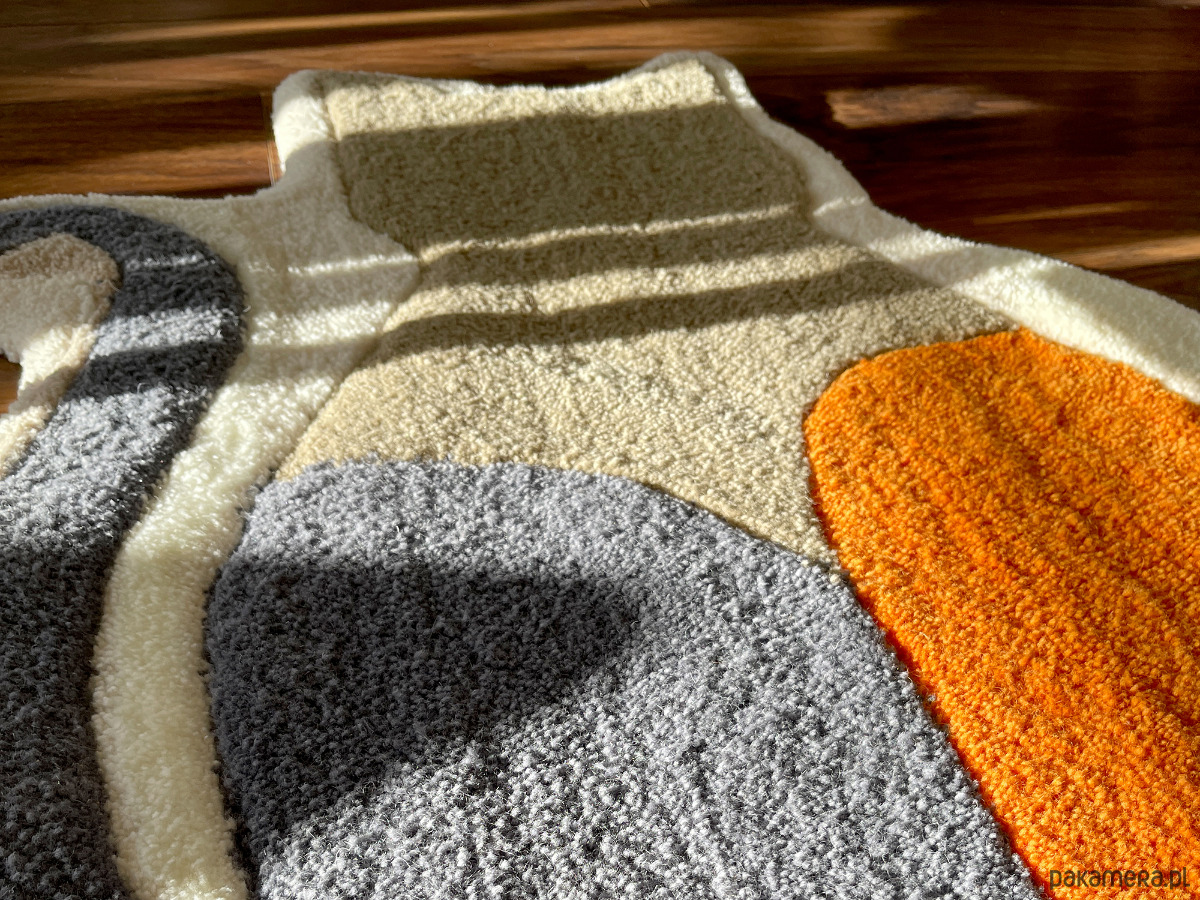 Dywan ma wymiary 70 × 60 cm i został wykończony od spodu warstwą antypoślizgową, dzięki czemu stabilnie leży na podłodze. To unikatowy egzemplarz, który sprawdzi się jako dekoracyjny akcent we wnętrzu – zarówno w salonie, sypialni, jak i biurze.