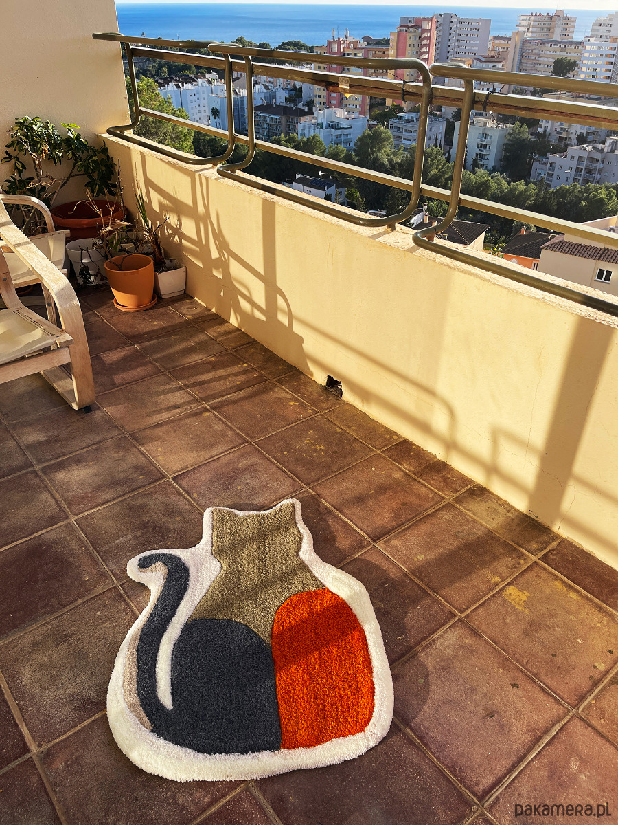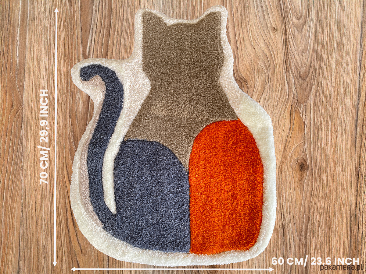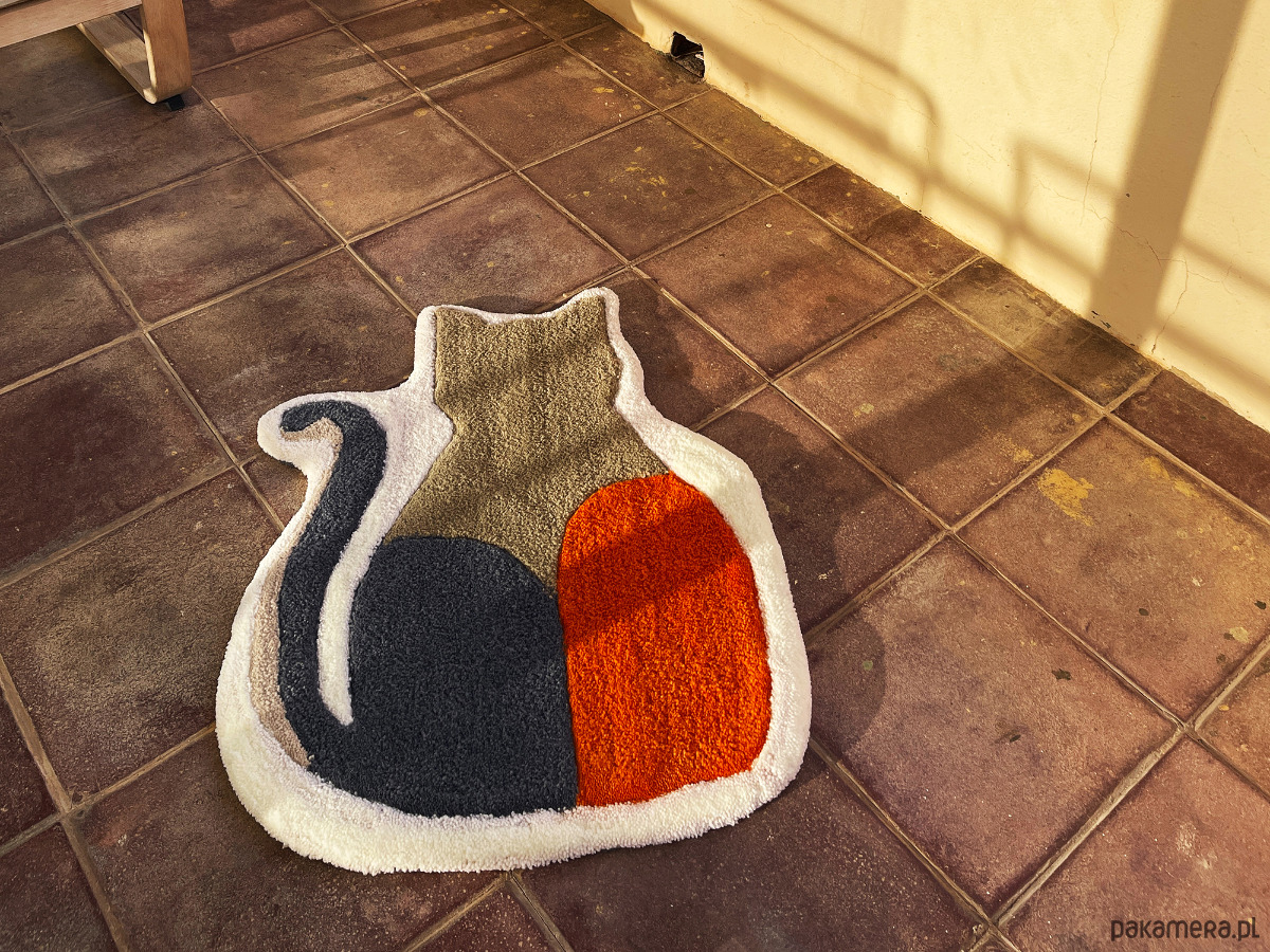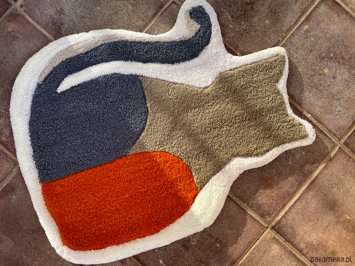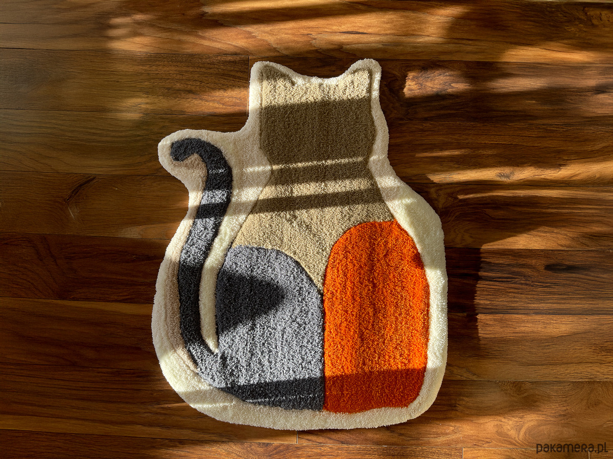 Ręcznie tuftowany dywan w kształcie kota, wykonany z dbałością o detal i jakość materiałów. Powstał głównie z wysokogatunkowej, 100% wełny nowozelandzkiej, cenionej za trwałość, miękkość i odporność na mechacenie. Jeden z elementów został wykonany z włóczki akrylowej, co nadaje całości subtelny kontrast faktur.