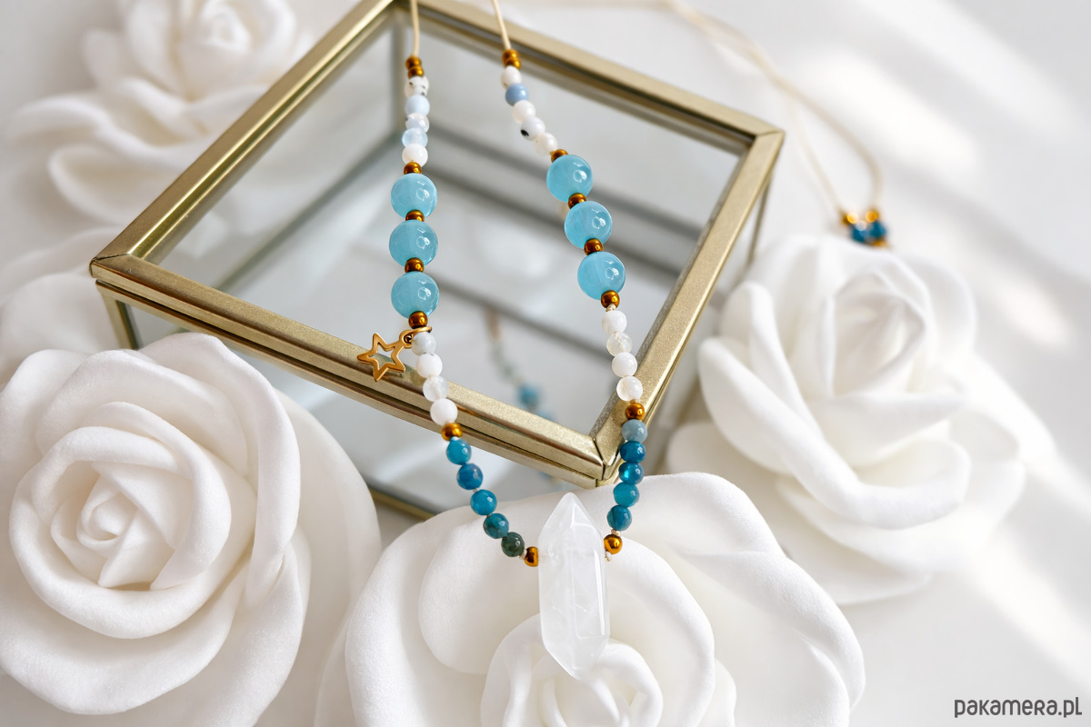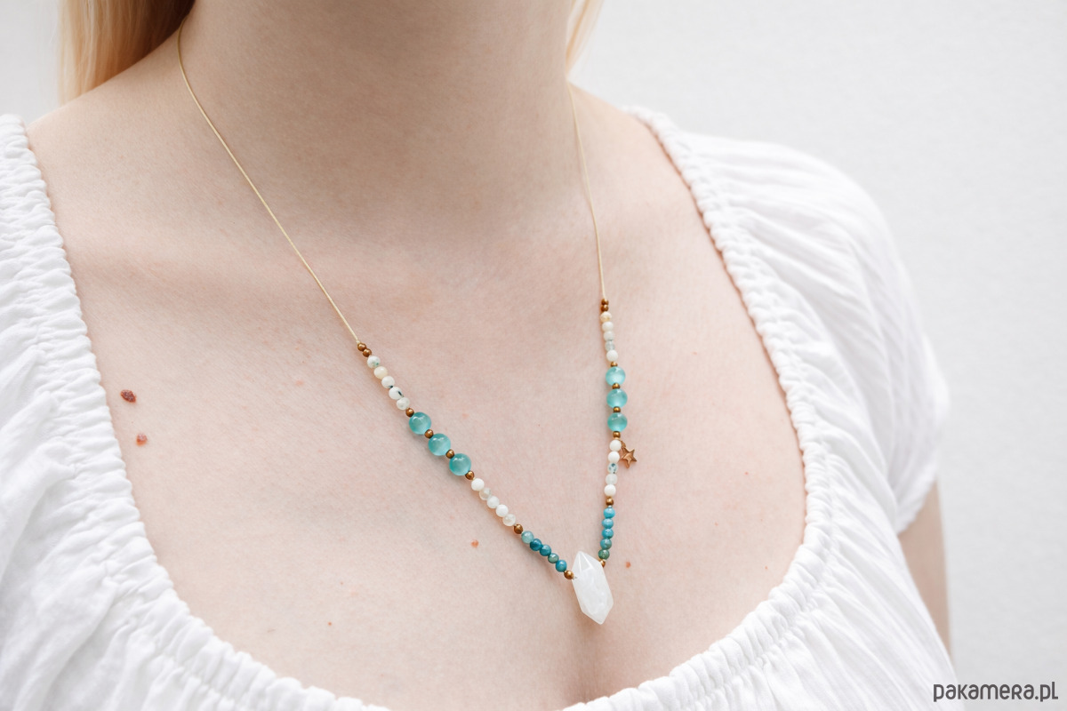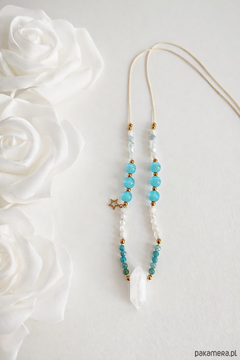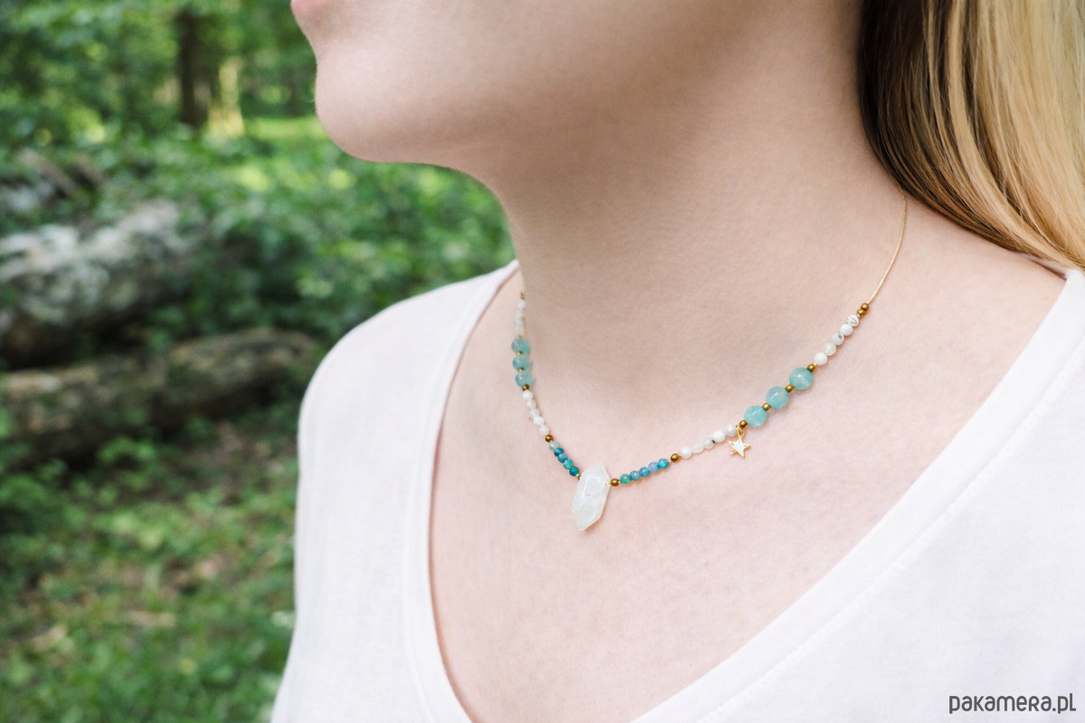 Ręcznie wykonany naszyjnik z kamieni naturalnych został skomponowany z turkusowego magnezytu, okrągłych kamieni uleksytu oraz złotych akcentów z hematytu. Centralnym punktem jest mleczny kryształ w jasnym odcieniu, który stanowi wyrazisty element całej kompozycji.