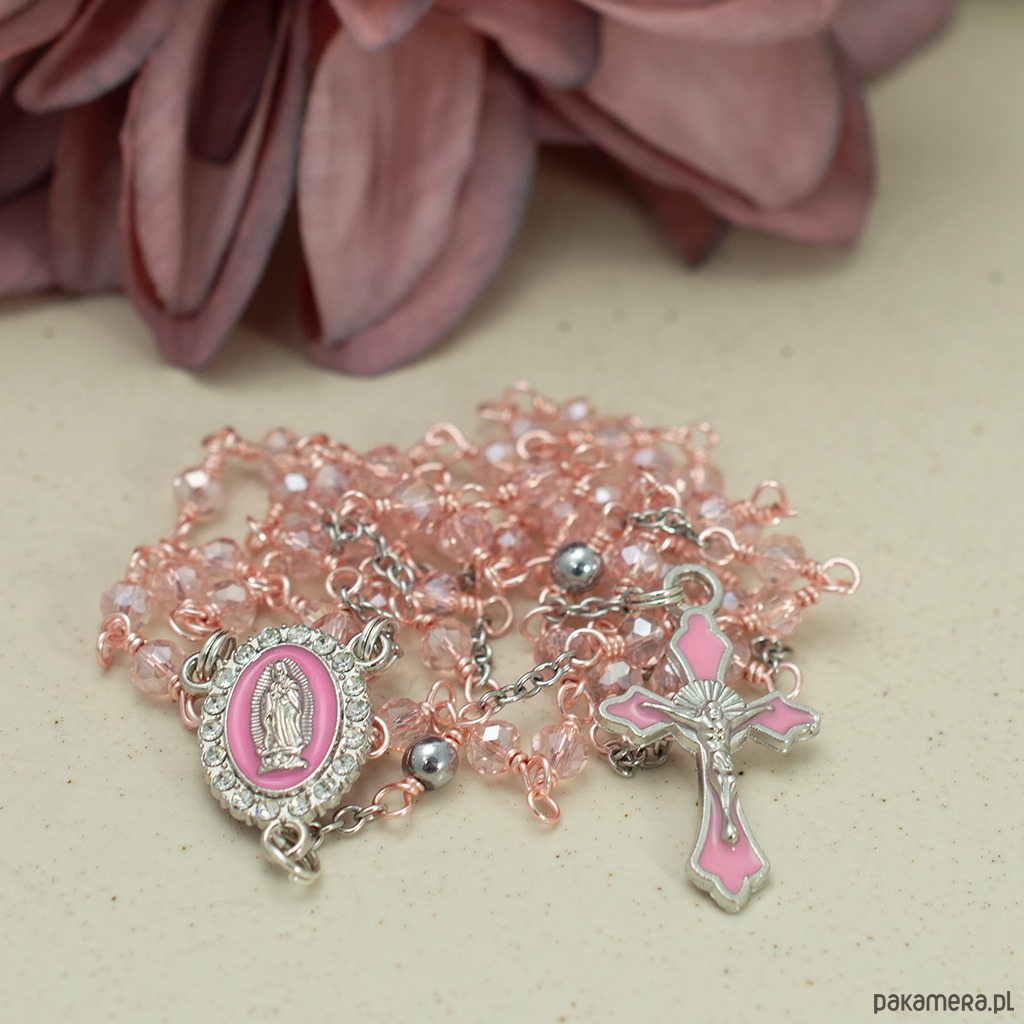 Powstał z drobnych koralików szklanych w kolorze różowym (4mm), elementów metalowych w kolorze różowym i srebrnym. Różaniec jest zapakowany ozdobnie w woreczek welurowy i stanowi pomysł na piękny prezent na chrzest, komunię, bierzmowanie, itd.