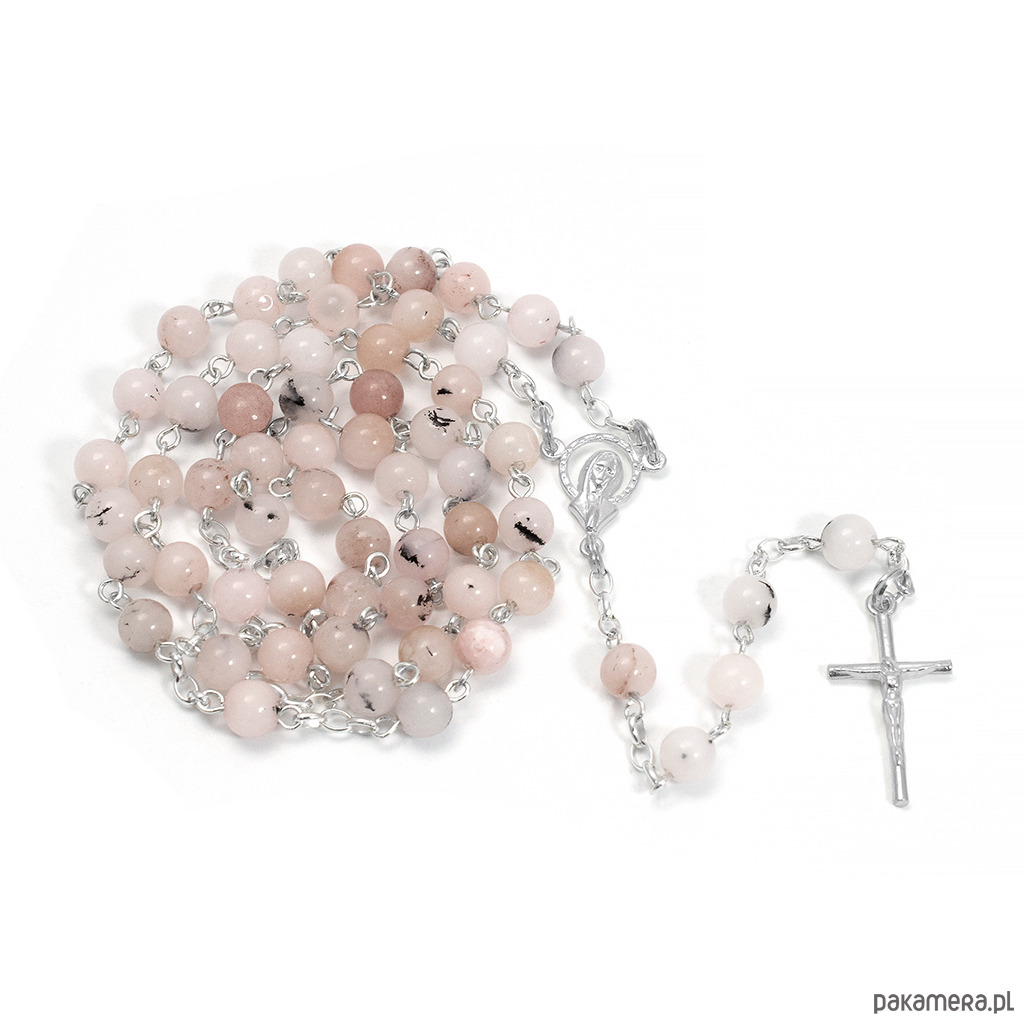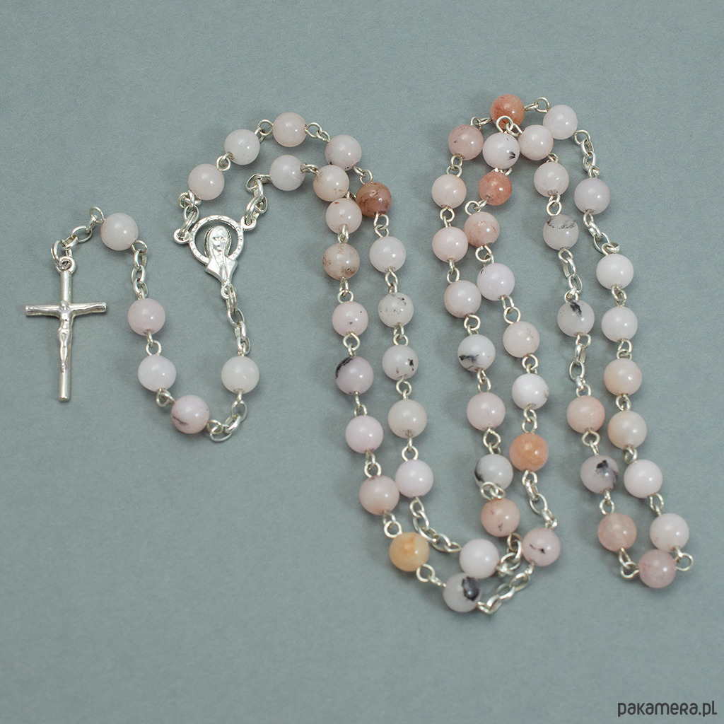 Kamienie: opal różowy – kulki (6mm) – każdy sznur kamieni ma nieco inny rysunek, jako, że są to kamienie naturalne, dlatego otrzymany różaniec może nieznacznie różnić się od prezentowanego na zdjęciach