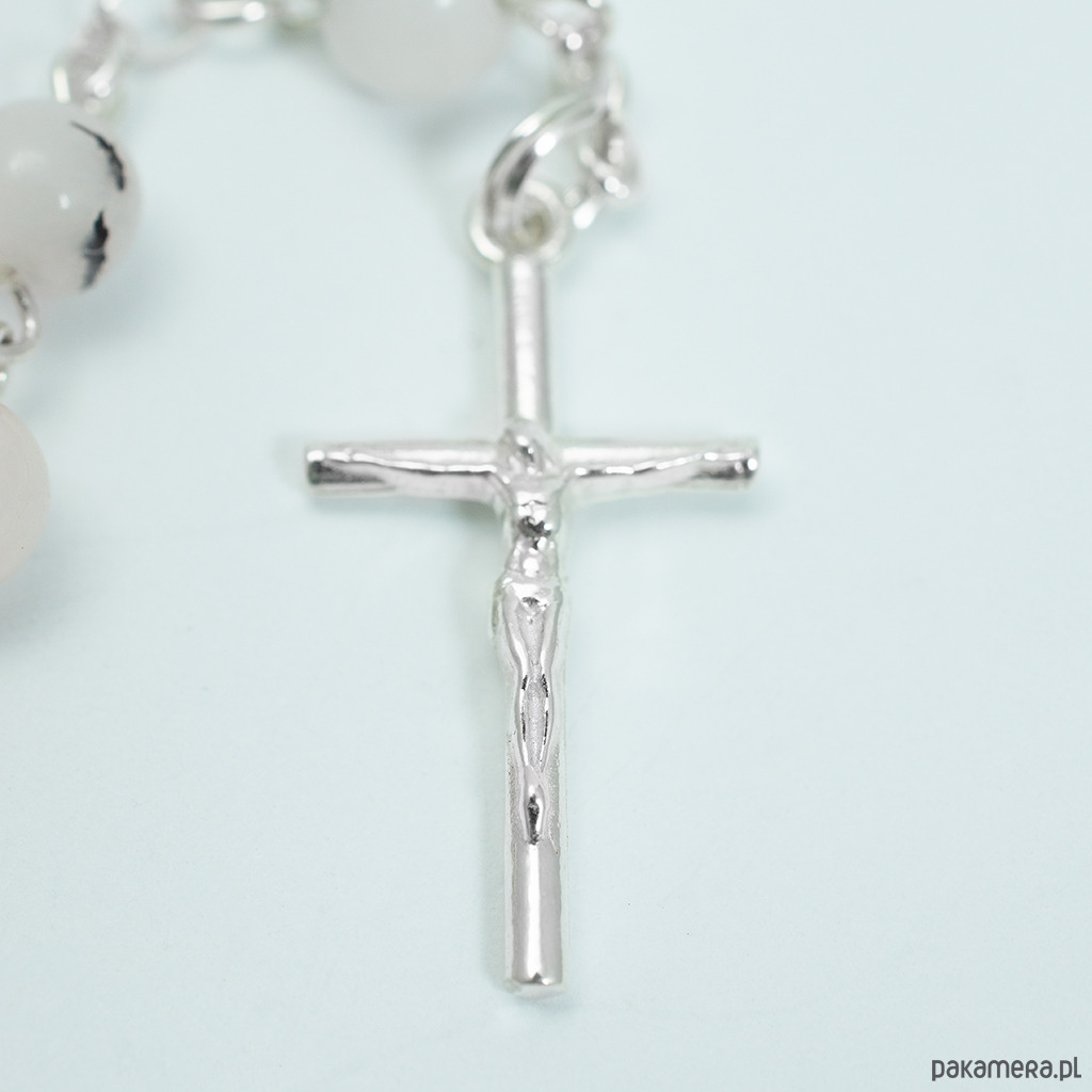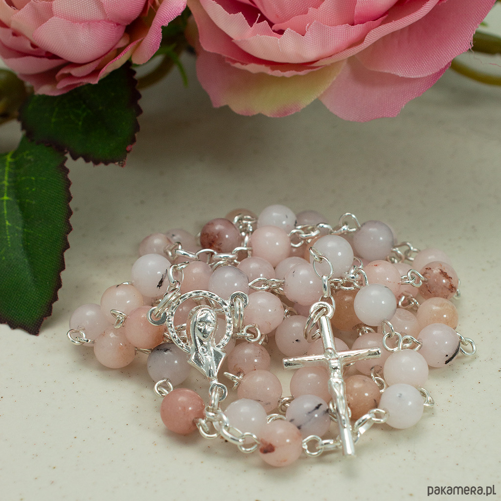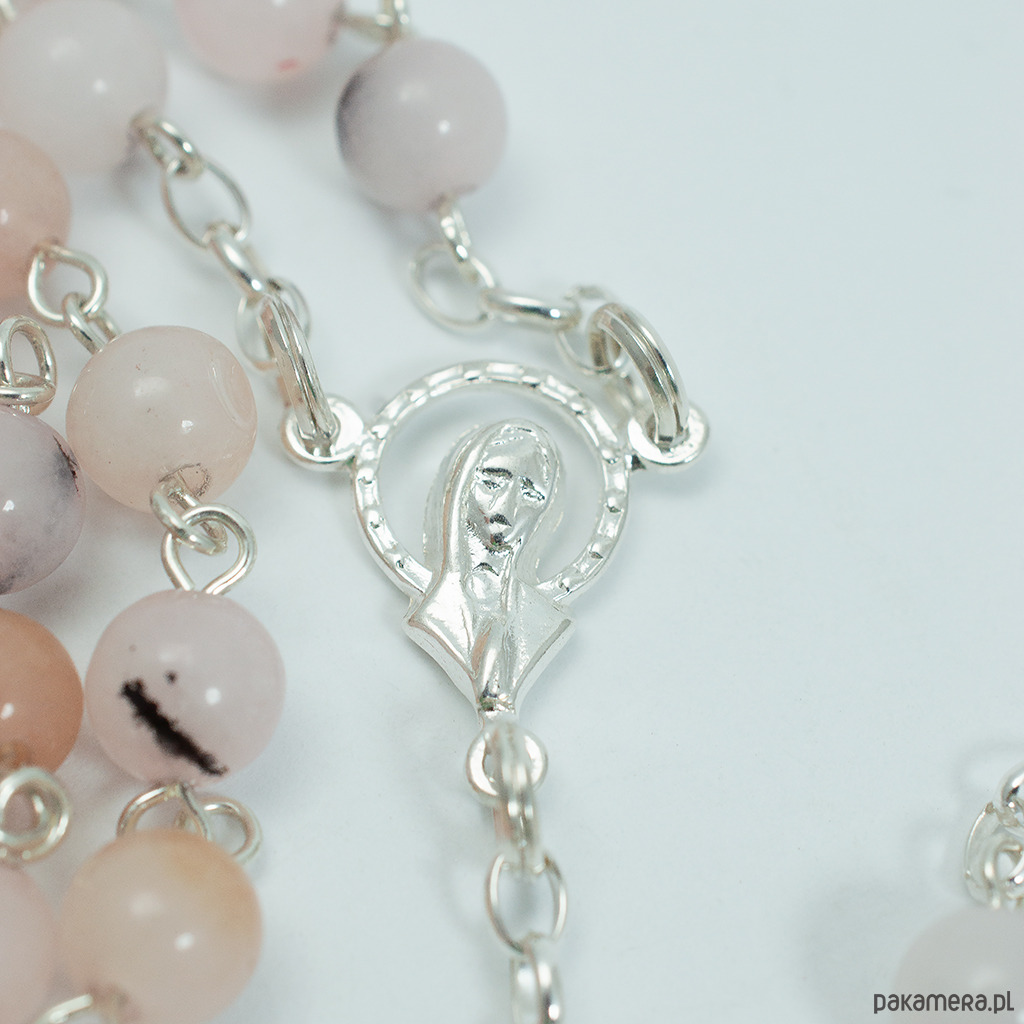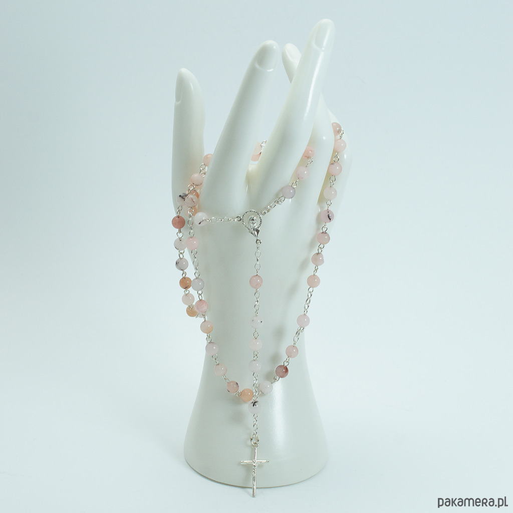 Powstał z naturalnego różowego opalu oraz ze srebra próby 925. Różaniec jest zapakowany ozdobnie w woreczek welurowy i stanowi pomysł na piękny prezent na chrzest, komunię, bierzmowanie, itd.