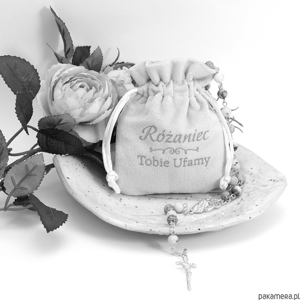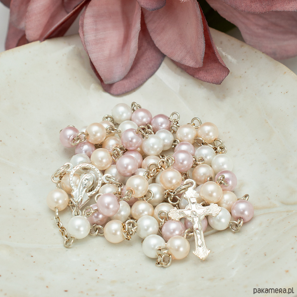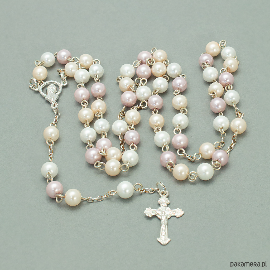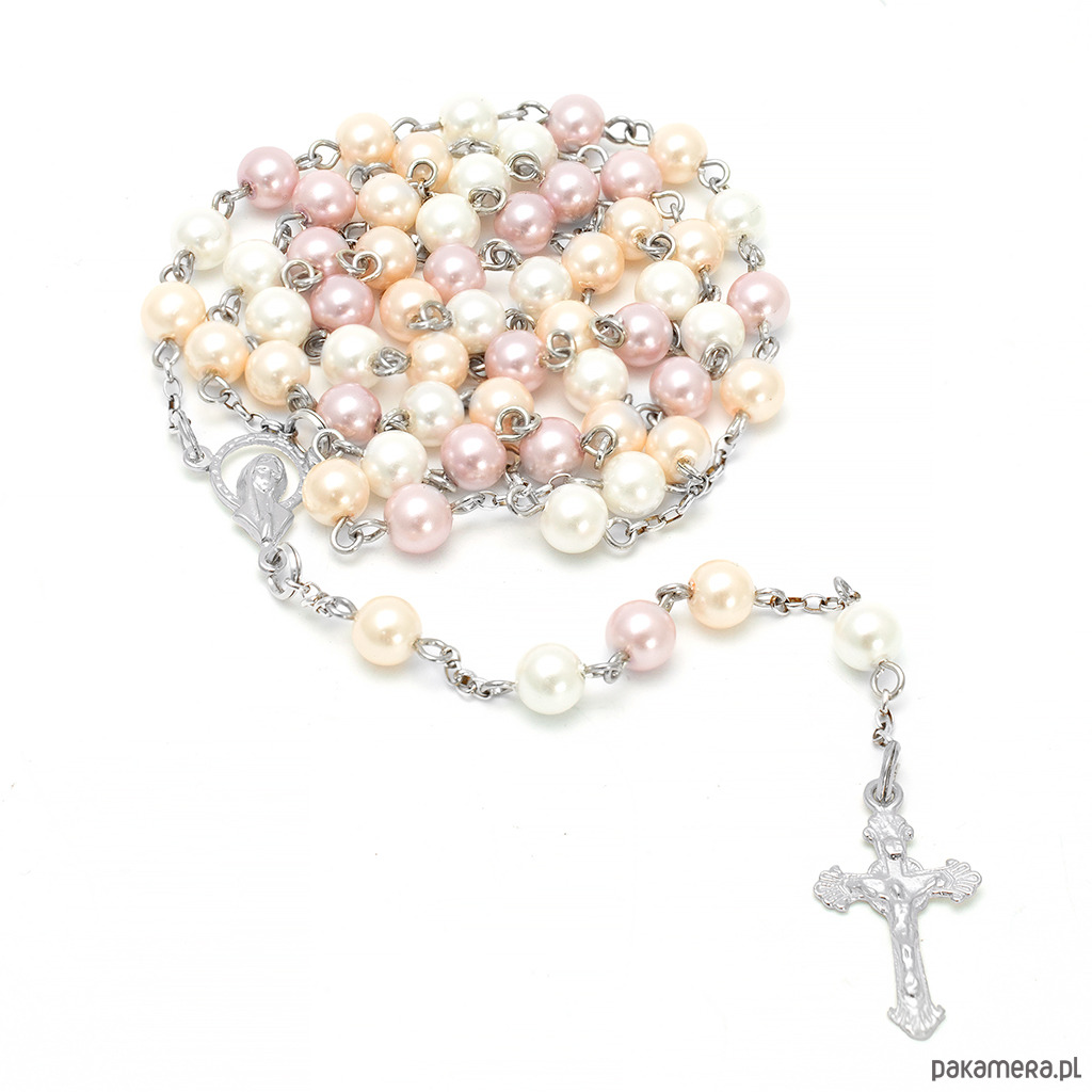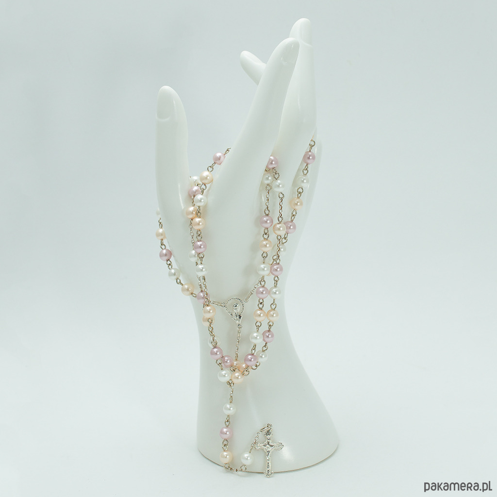 Powstał z pereł Seashell w kolorze białym, różowym i beżowym oraz ze srebra próby 925. Różaniec jest zapakowany ozdobnie w woreczek welurowy i stanowi pomysł na piękny prezent na chrzest, komunię, bierzmowanie, itd.