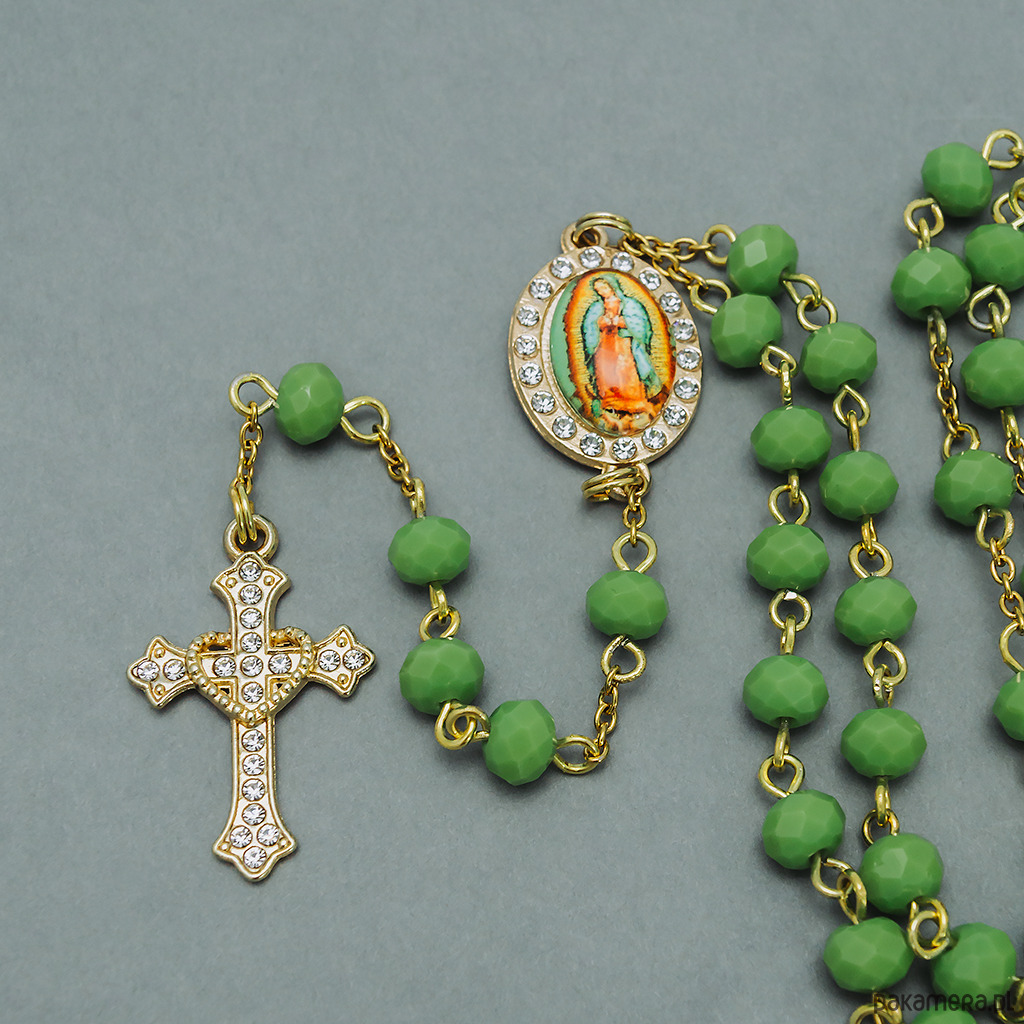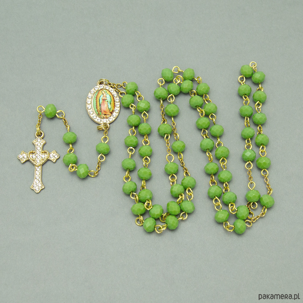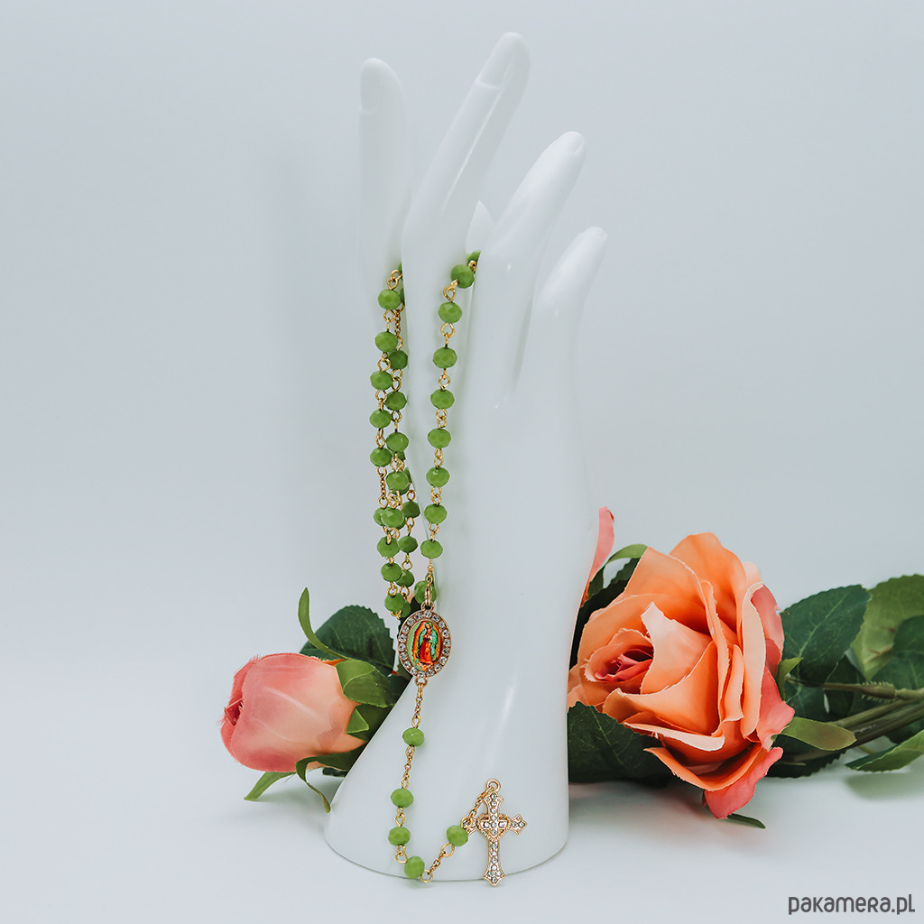 Różaniec z zielonych kryształków wykonany ręcznie w naszej pracowni w Polsce. Nasze różańce cechuje wysoka jakość i precyzja wykonania.