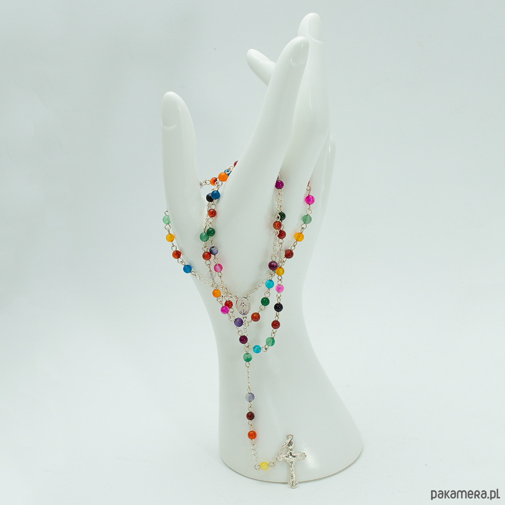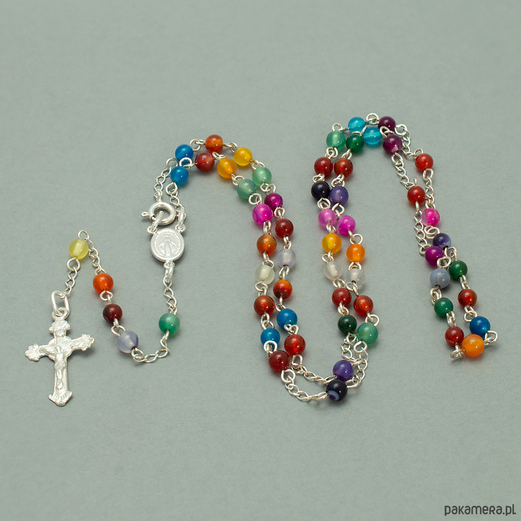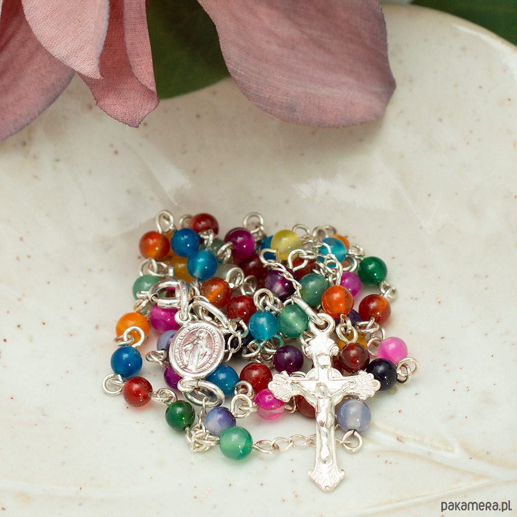 Różaniec wykonany ręcznie w naszej pracowni. Powstał z wielokolorowego agatu oraz ze srebra próby 925. Posiada zapięcie - karabińczyk i nadaje się do noszenia na szyi.