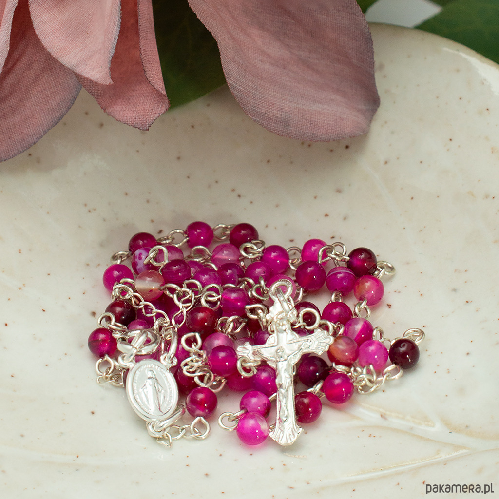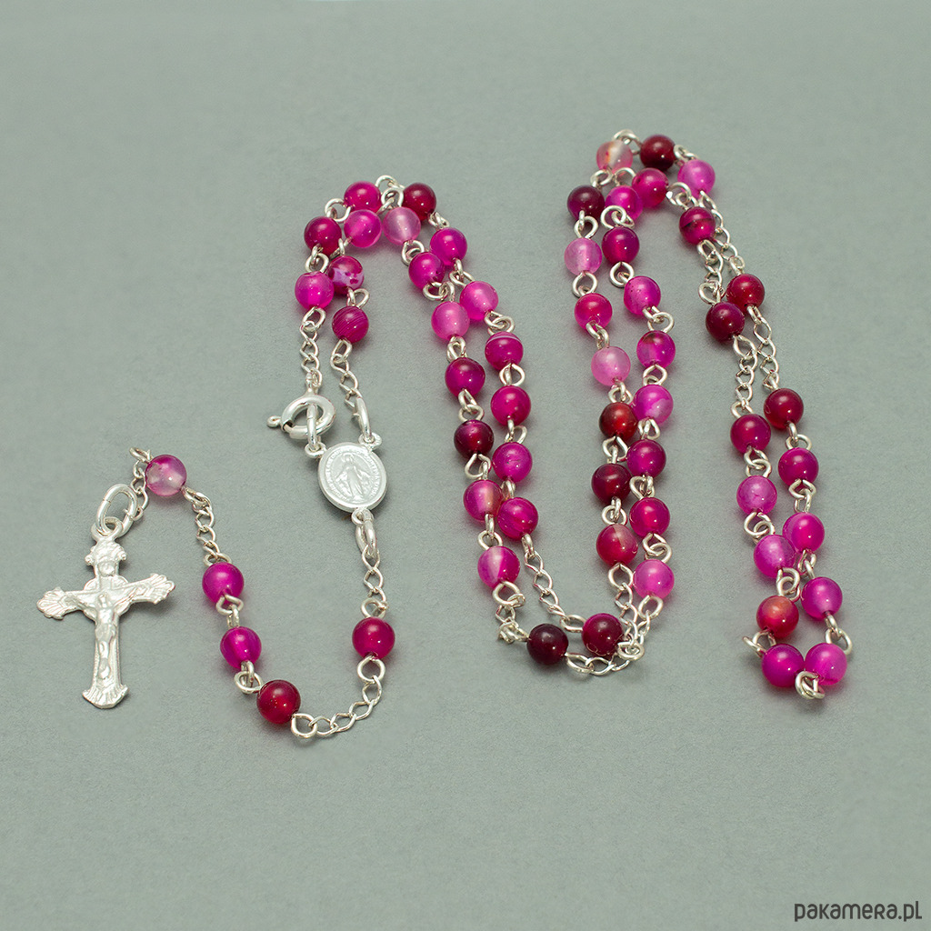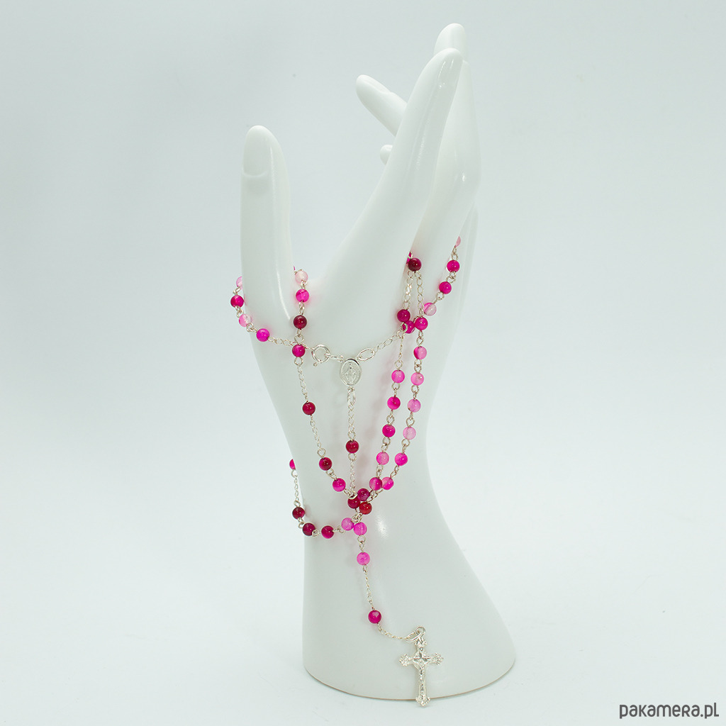 Ręcznie robiony różaniec, naszyjnik, różowy AGAT 4mm, I Komunia, SREBRO 925