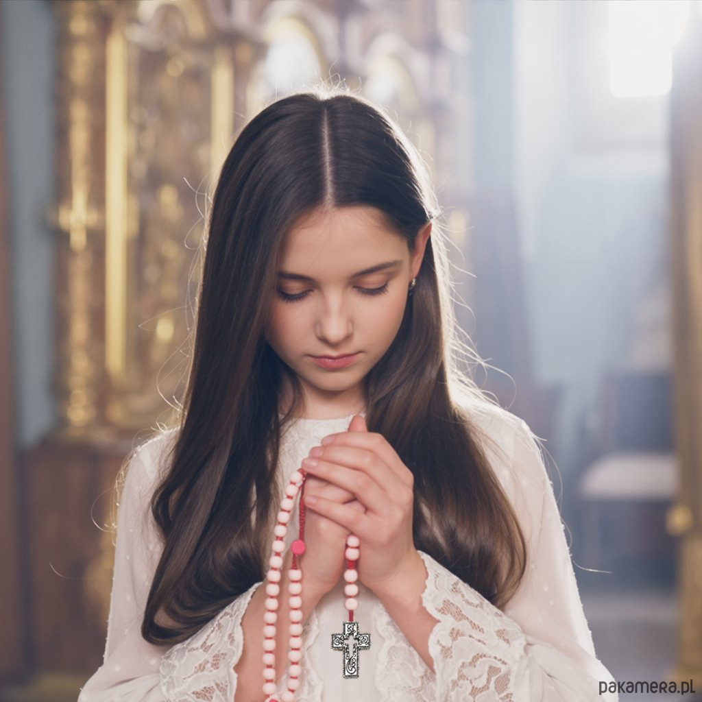 Ręcznie robiony różowy różaniec, I Komunia Święta, Serce Jezusa