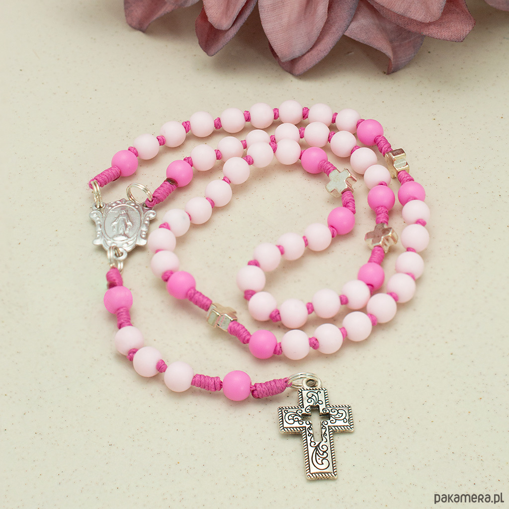 Ten piękny różaniec jest wykonany z koralików akrylowych w pastelowych odcieniach różu i hematytowych krzyżyków. Jest on zapakowany w ozdobne firmowe opakowanie. Idealny prezent dla dziewczynki na komunię, bierzmowanie, itd.