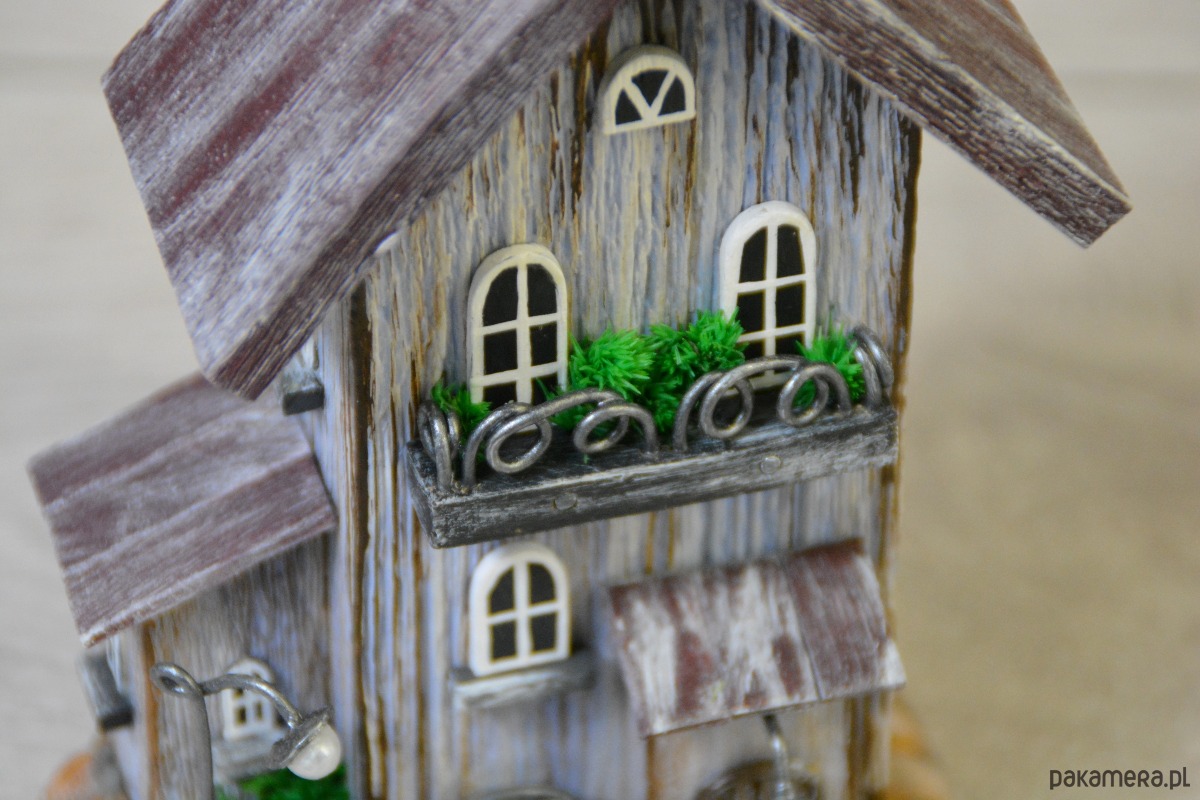 Dom wykonany jest z drewna, pomalowany farbami akrylowymi i polakierowany.