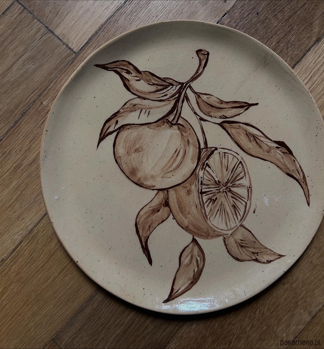 Piękny, ręcznie wykonany talerz ceramiczny ozdobiony ilustracją gałązki cytrusów. Ciepły, naturalny odcień gliny i malunek w brązowych tonach nadają mu rustykalny, artystyczny charakter.
