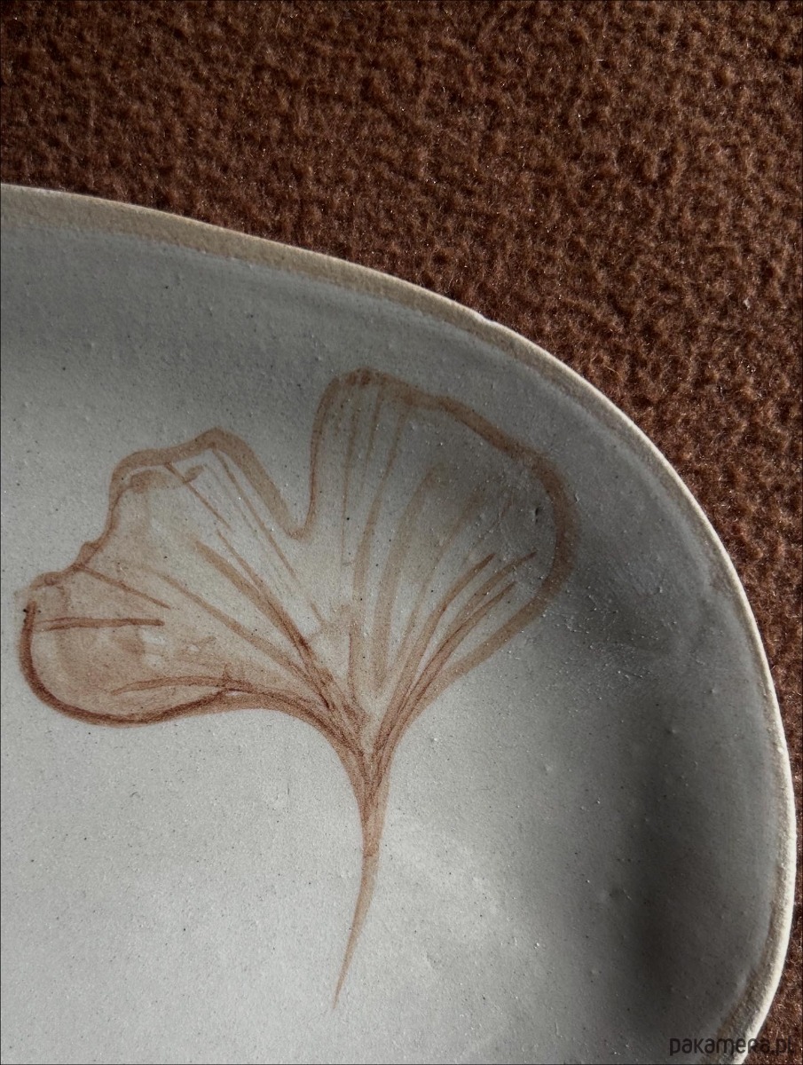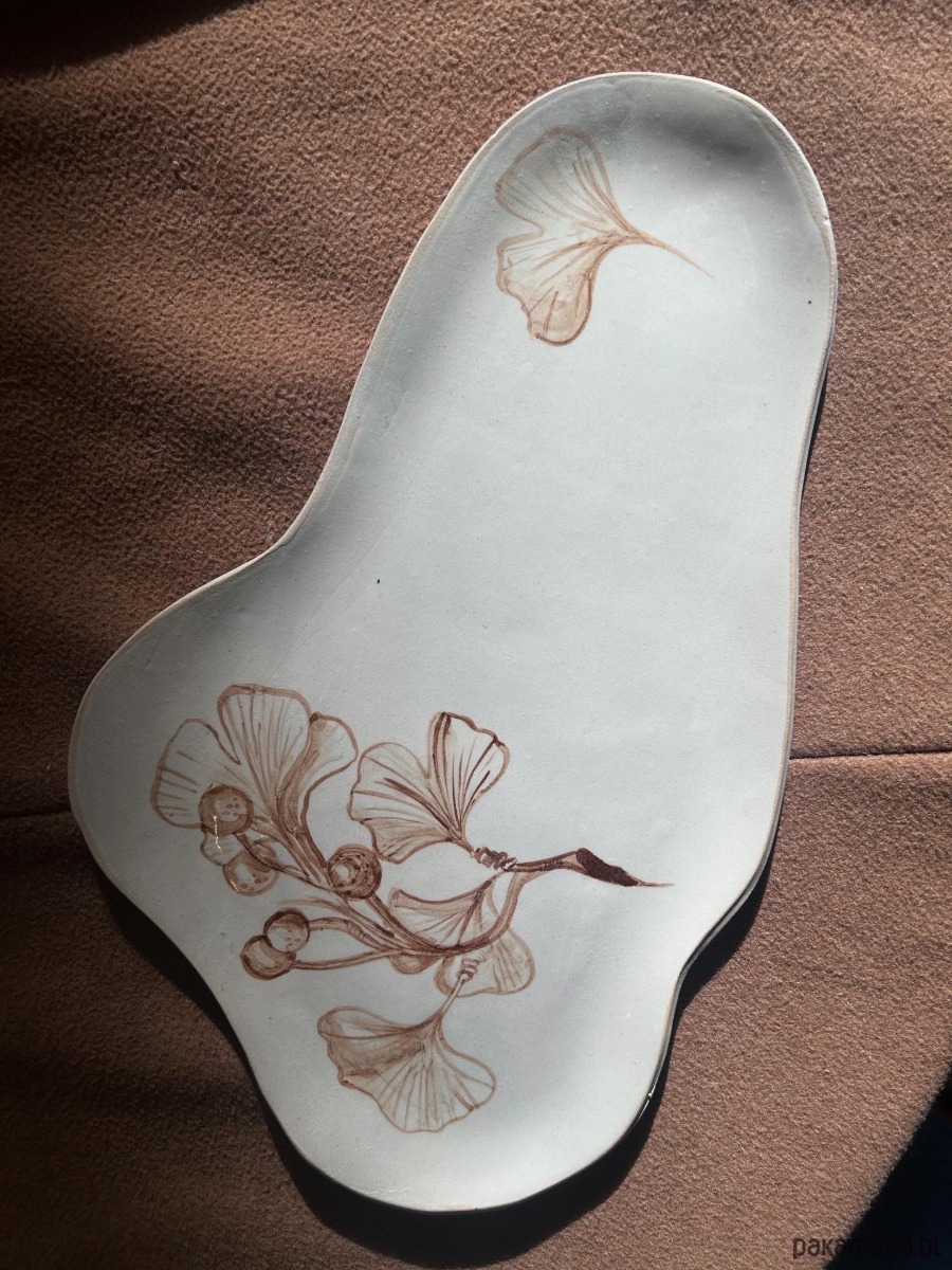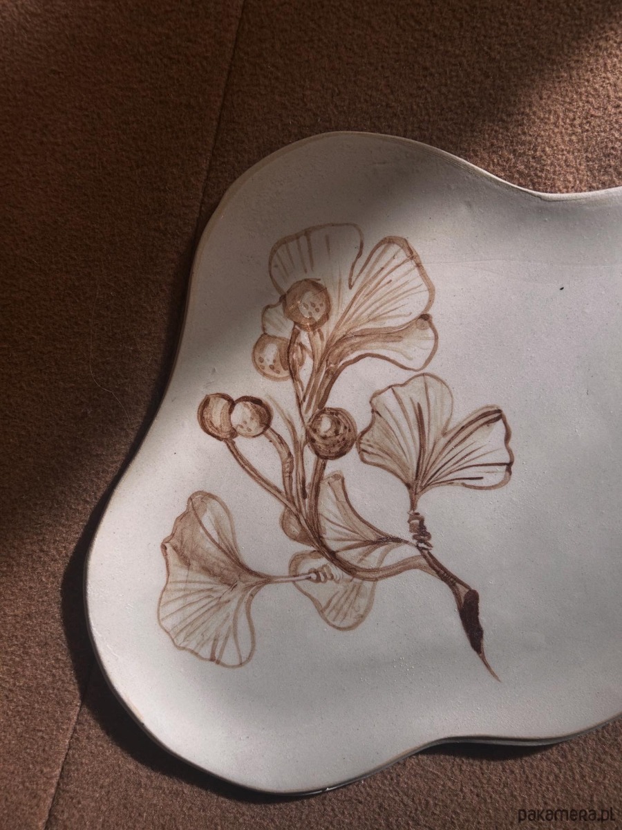 Wyjątkowy, organicznie uformowany talerz ceramiczny, wykonany i zdobiony ręcznie. Delikatny rysunek gałązki miłorzębu w ciepłych, brązowych tonach podkreśla naturalny charakter ceramiki. Nieregularny kształt naczynia sprawia, że ten egzemplarz jest unikatowy i niepowtarzalny.