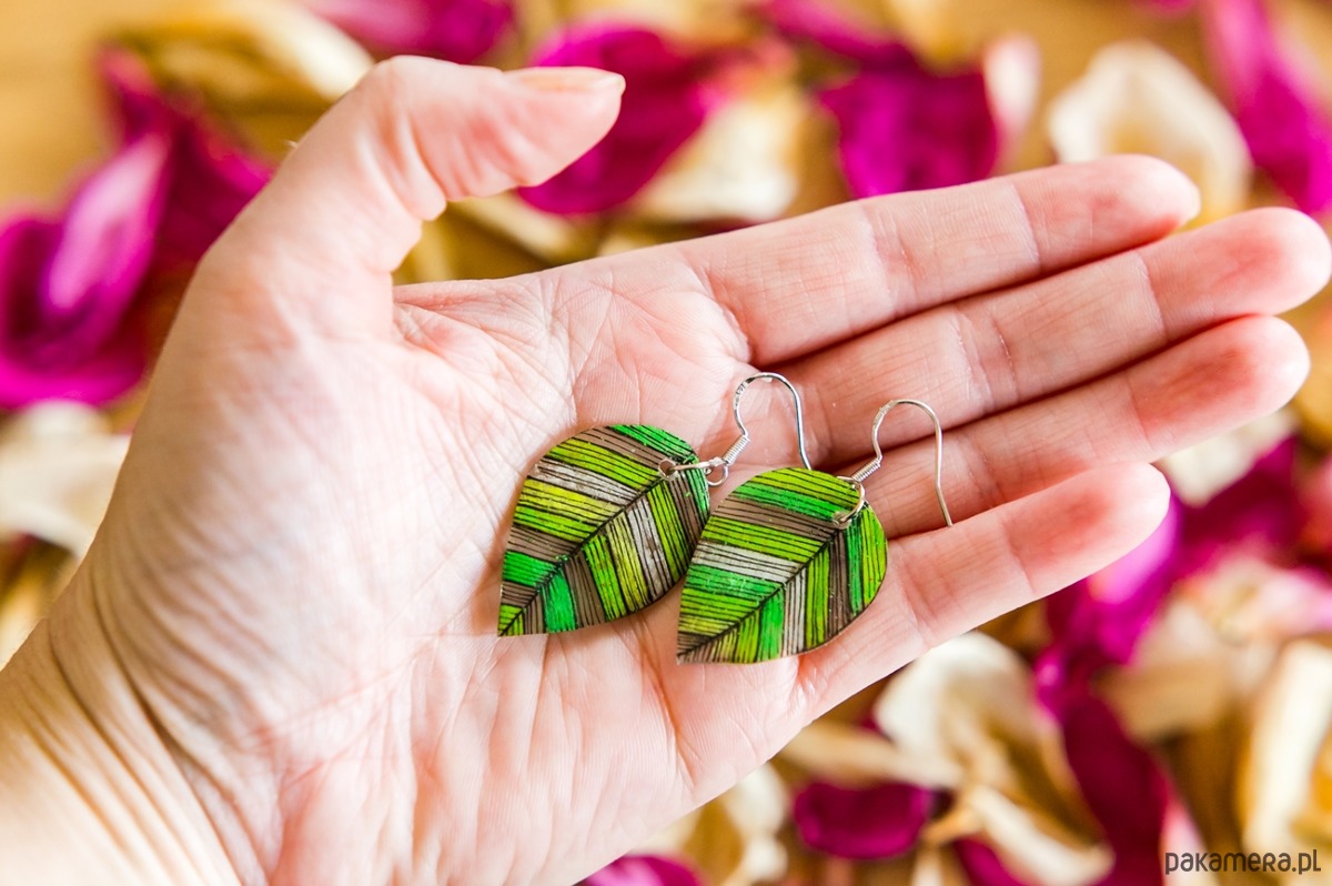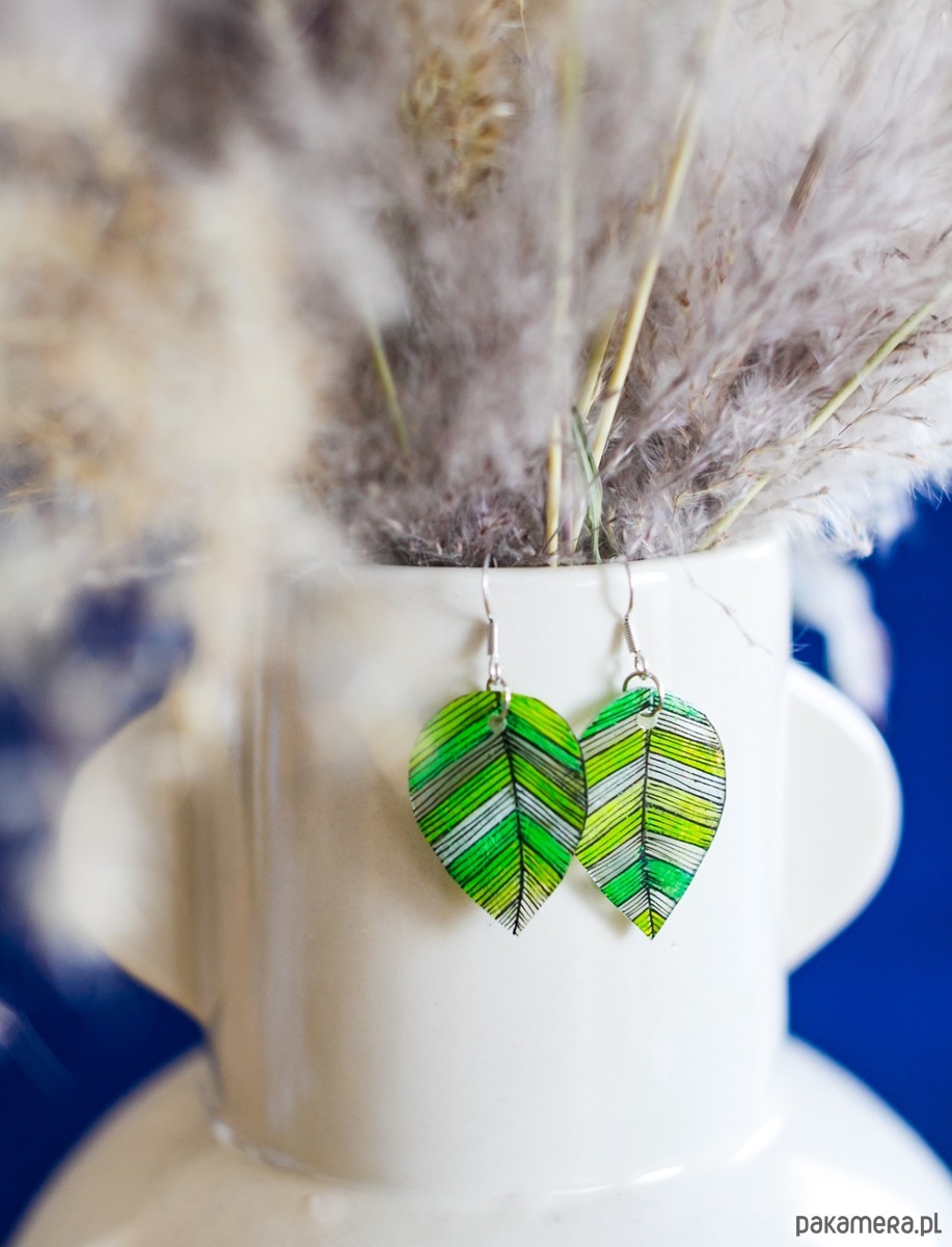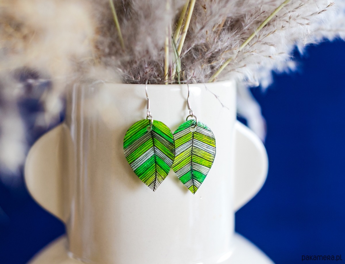 Ręcznie rysowane kolczyki srebrne Listki w odcieniu soczystej zieleni
