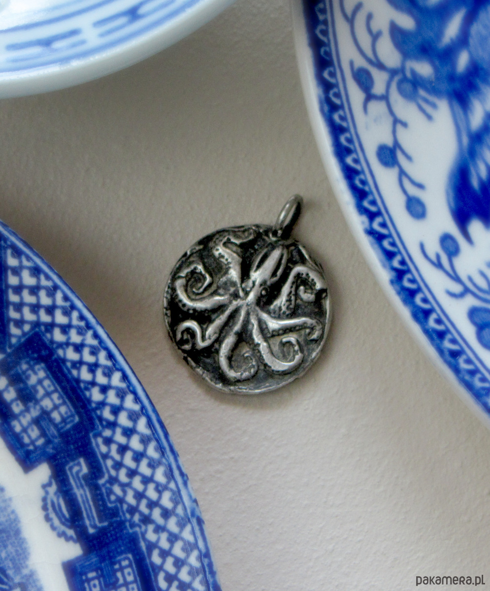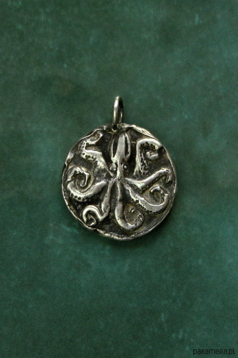 Ręcznie rzeźbiona zawieszka przedstawiająca monetę z ośmiornicą. Zawieszka została wykonana ze srebra w krakowskiej pracowni i pokryta specjalną patyną do srebra. Ośmiornica to symbol bogactwa, inteligencji, mądrości i adaptacji.