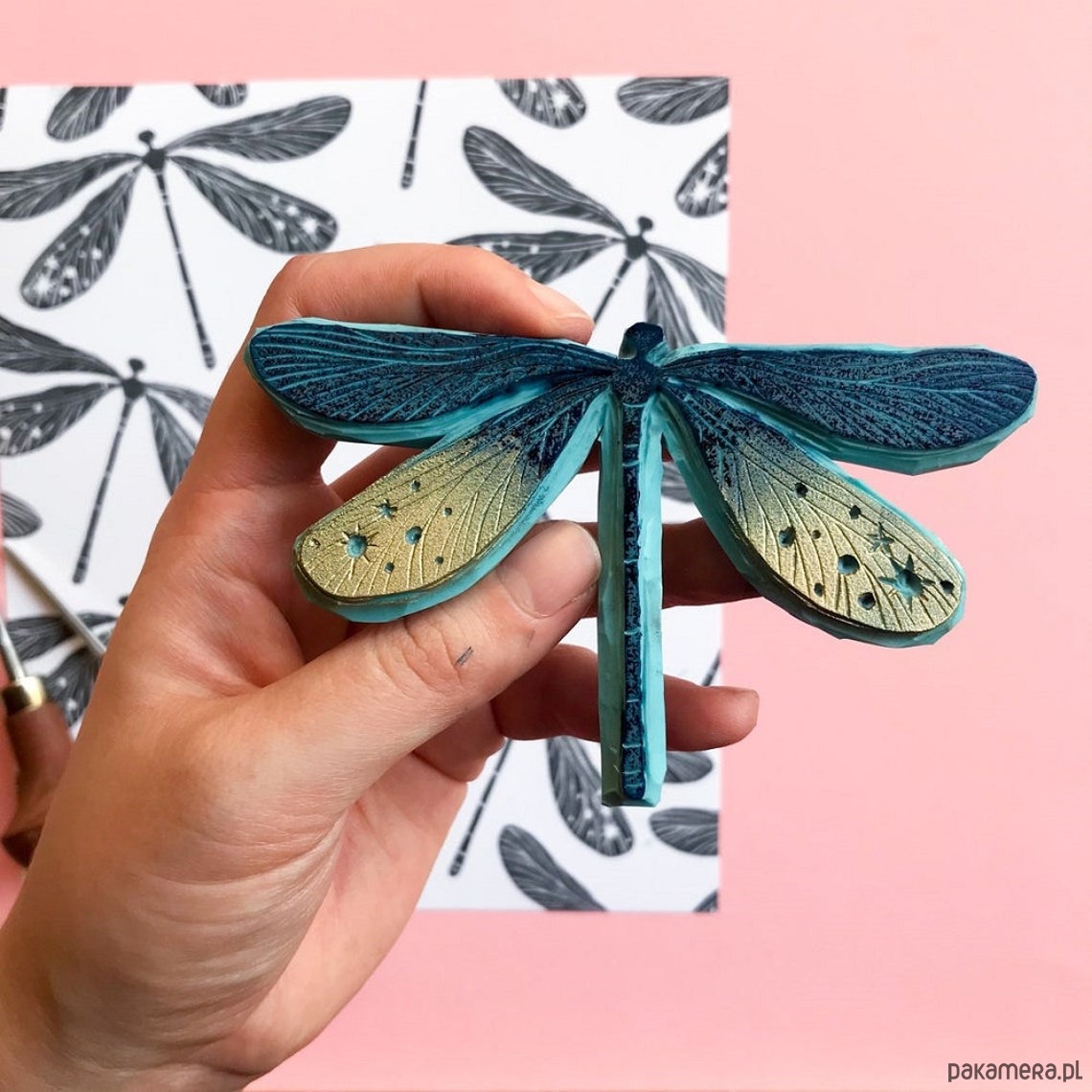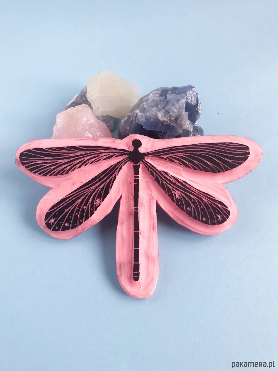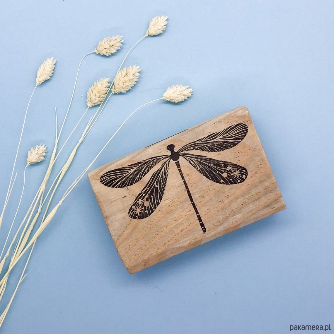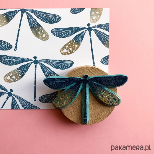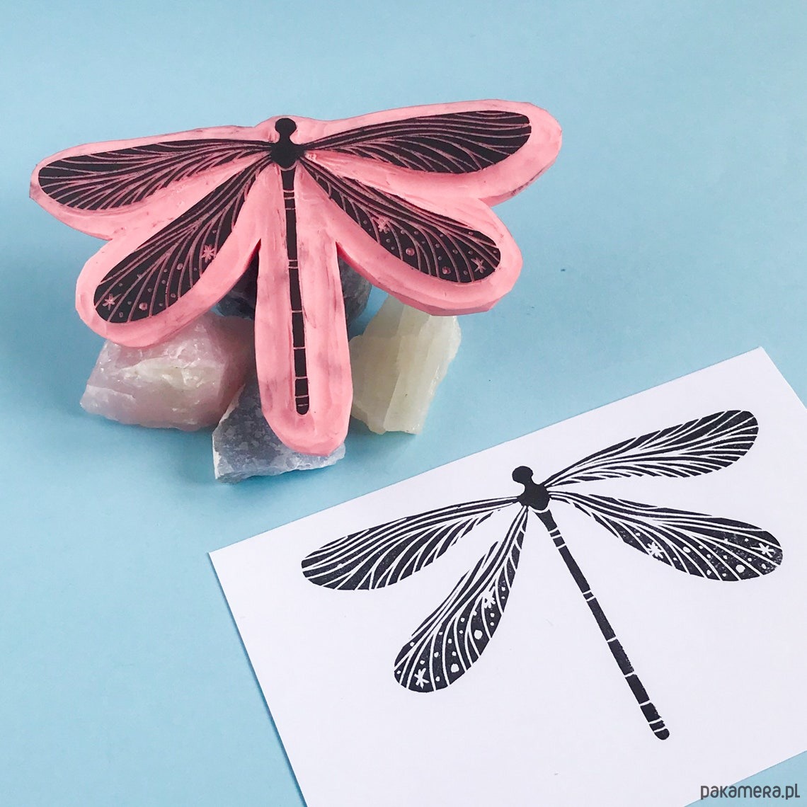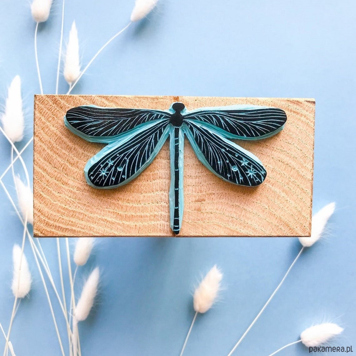 Ręcznie rzeźbiony autorski stempel - magiczna ważka, baśniowa papeteria