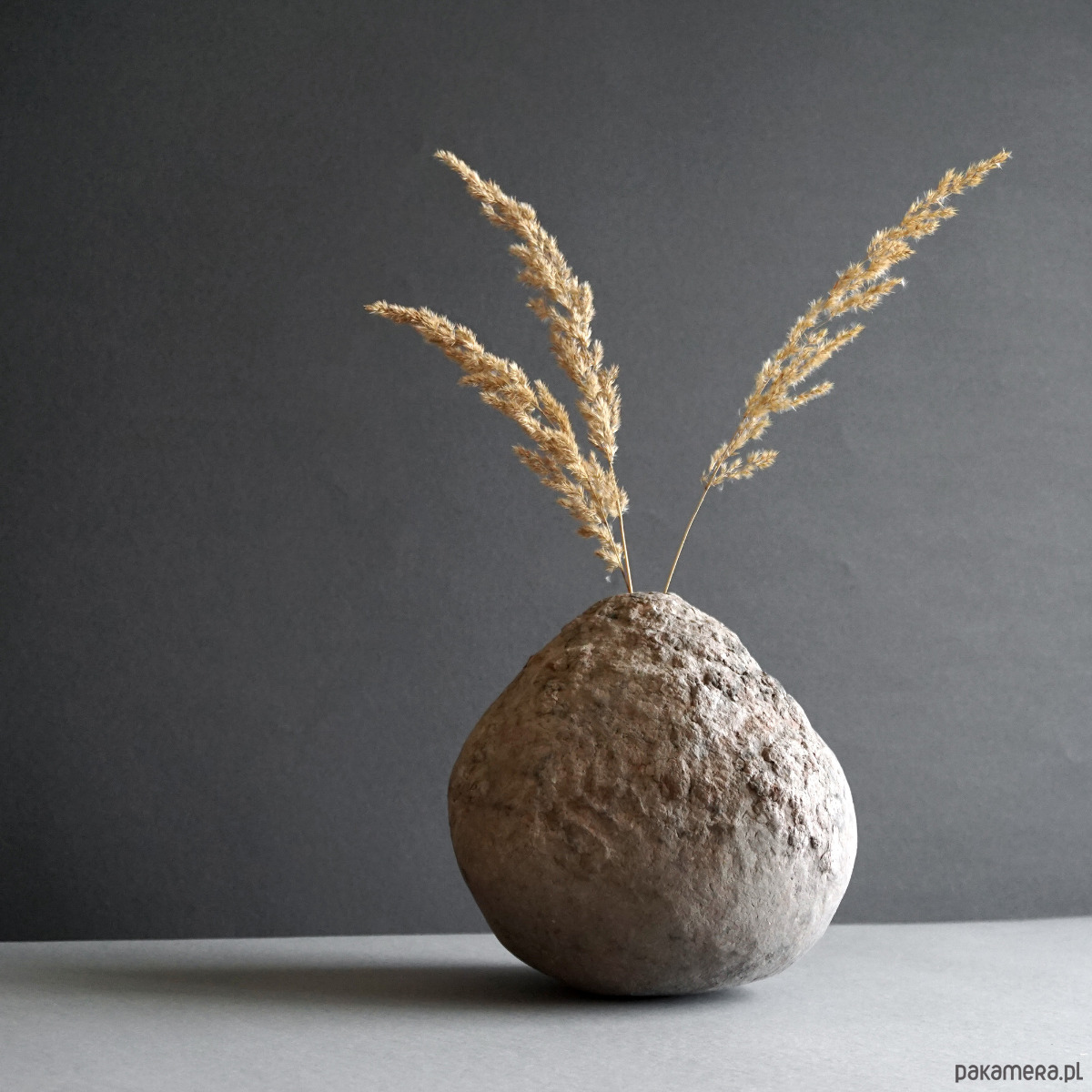 Ręcznie rzeźbiony wazon na suszone kwiaty o organicznym kształcie inspirowanym nieregularnymi formami kamiennymi.