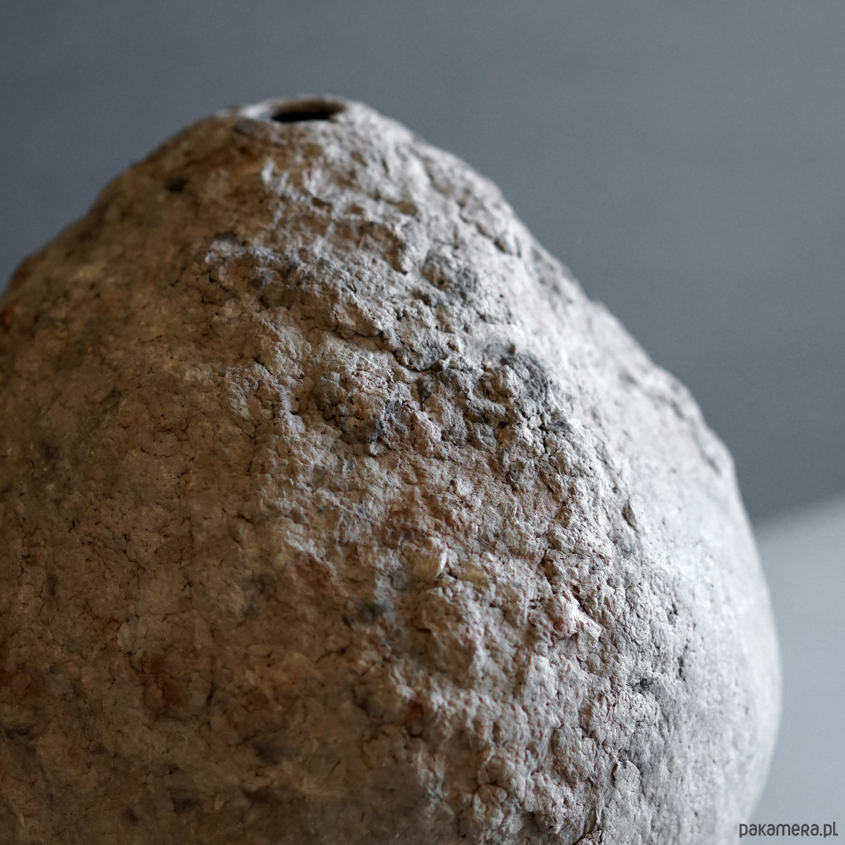 Powierzchnię wazonu tworzy kontrast między szorstką, surową fakturą, a delikatnie wygładzonymi, spokojnymi fragmentami.