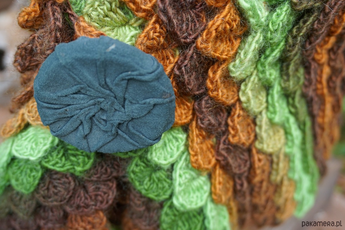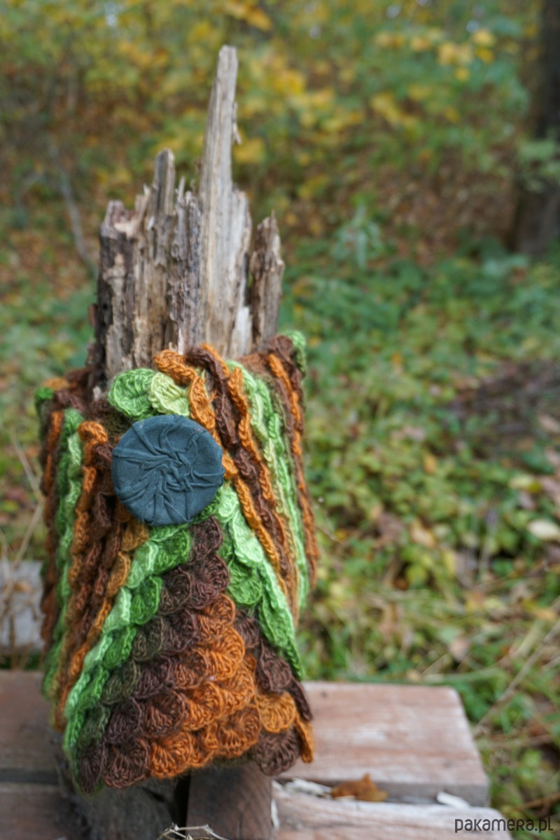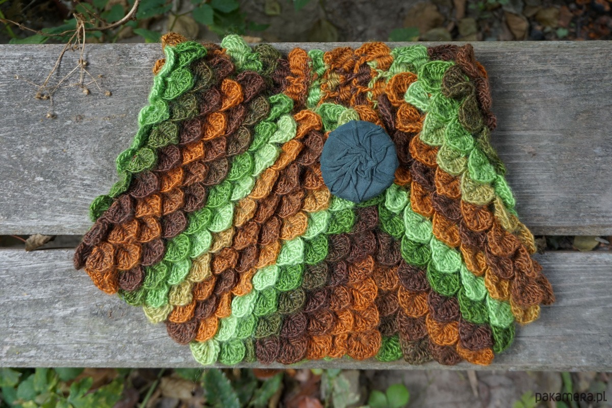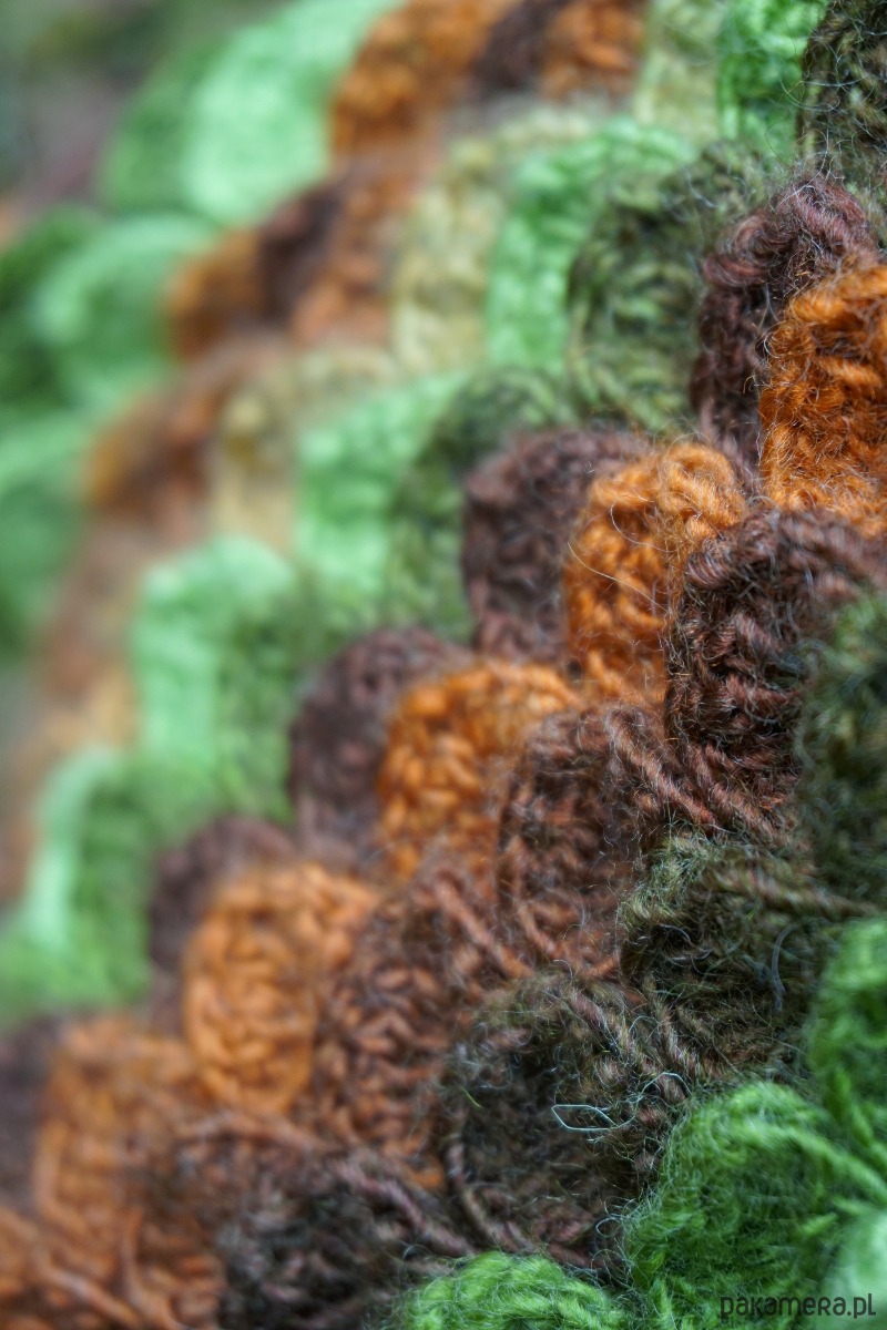 Ciepły, ręcznie robiony szal z wełny w jesiennych kolorach, o wzorze inspirowanym kształtem liścia. Ozdobiony skórzaną broszką, która pozwala na regulację i różne sposoby noszenia. Ciepły i wygodny, a zarazem jedyny w swoim rodzaju.