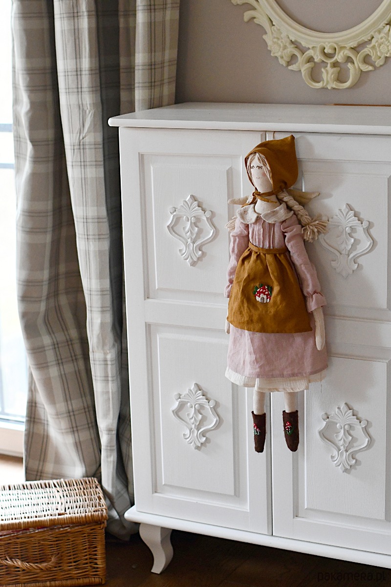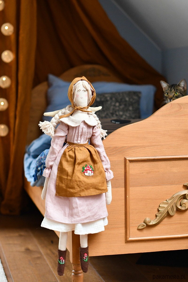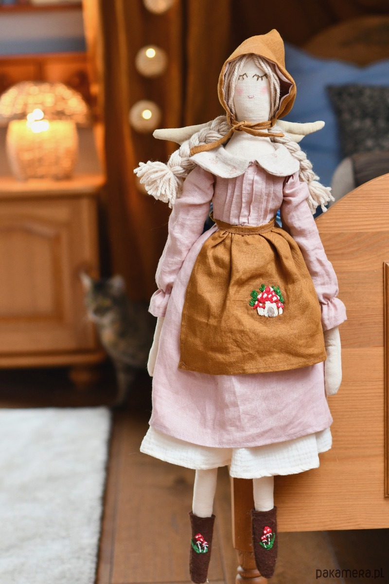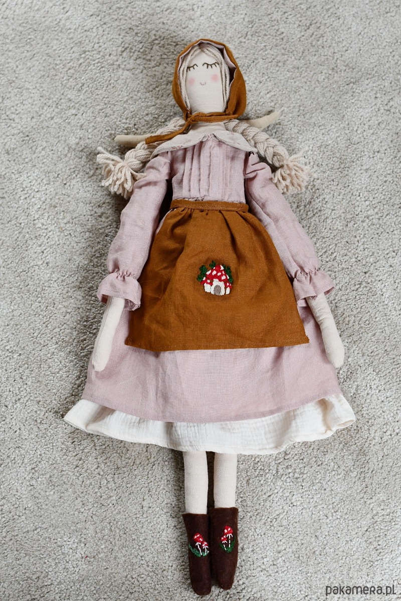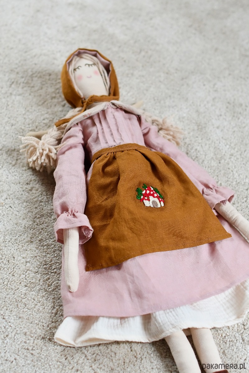 Laleczka ma też lniany fartuszek ozdobiony ręcznym haftem muchomorkowego domku.
