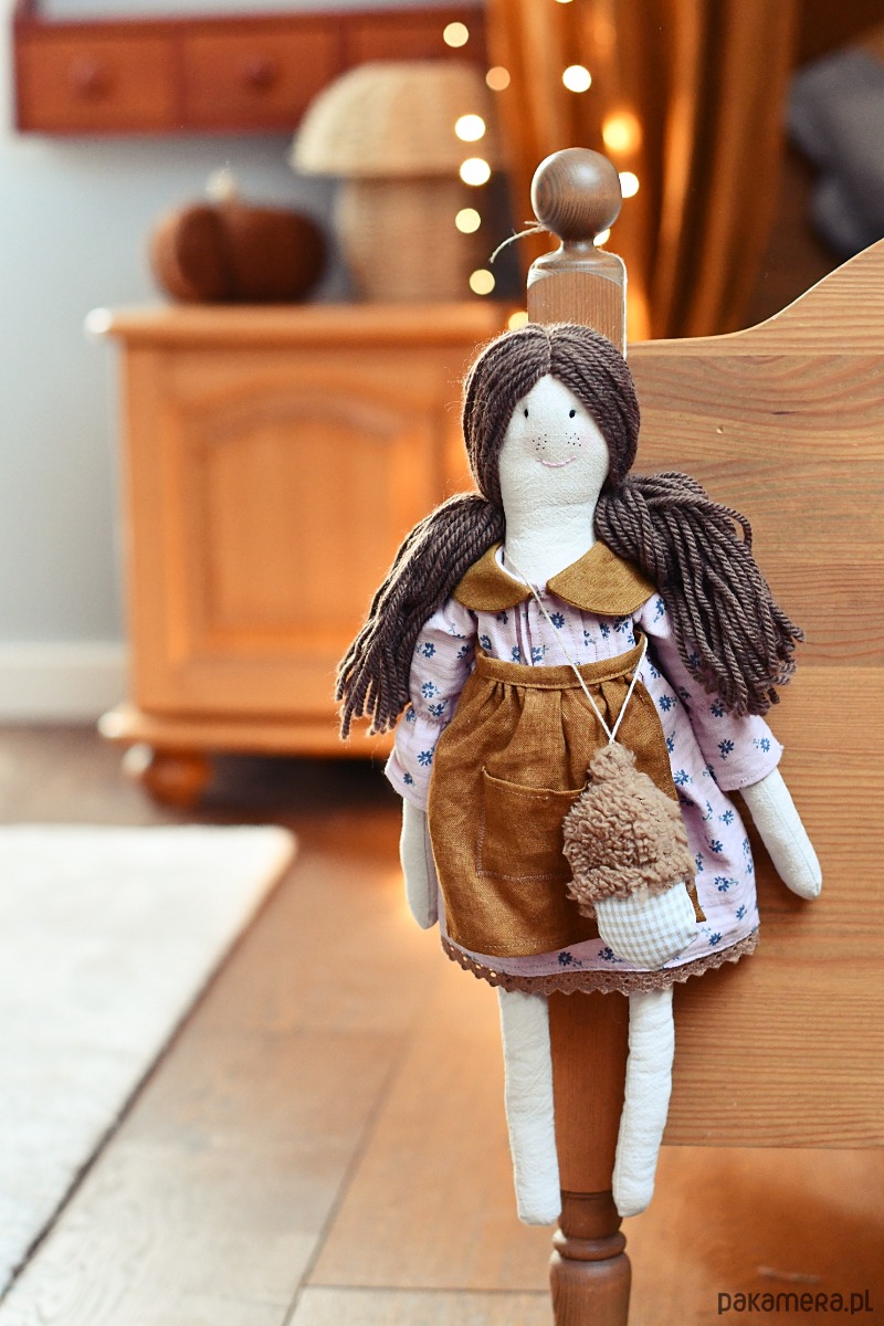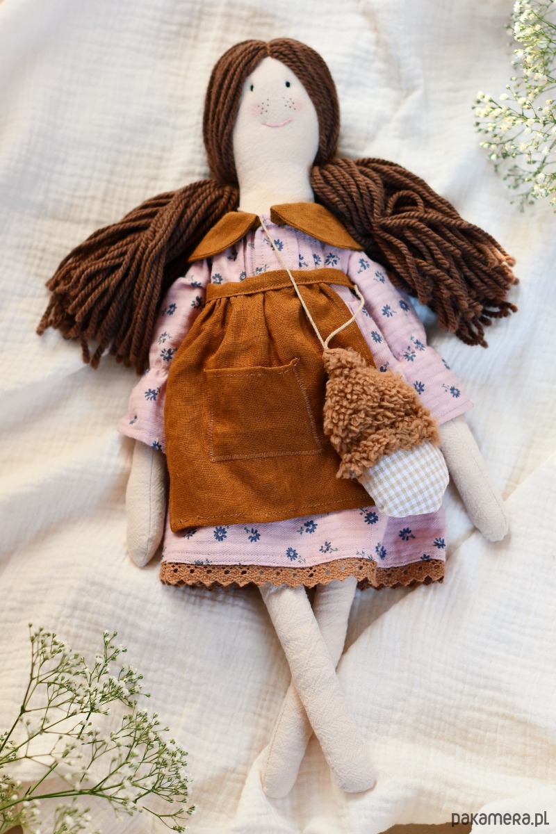Lalka ma różową sukienkę z muślinu, lniany fartuszek oraz zawieszkę w kształcie żołędzia.