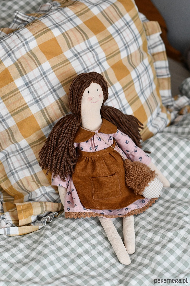 Miękka laleczka przytulanka uszyta w całości z przyjaznych, naturalnych materiałów.