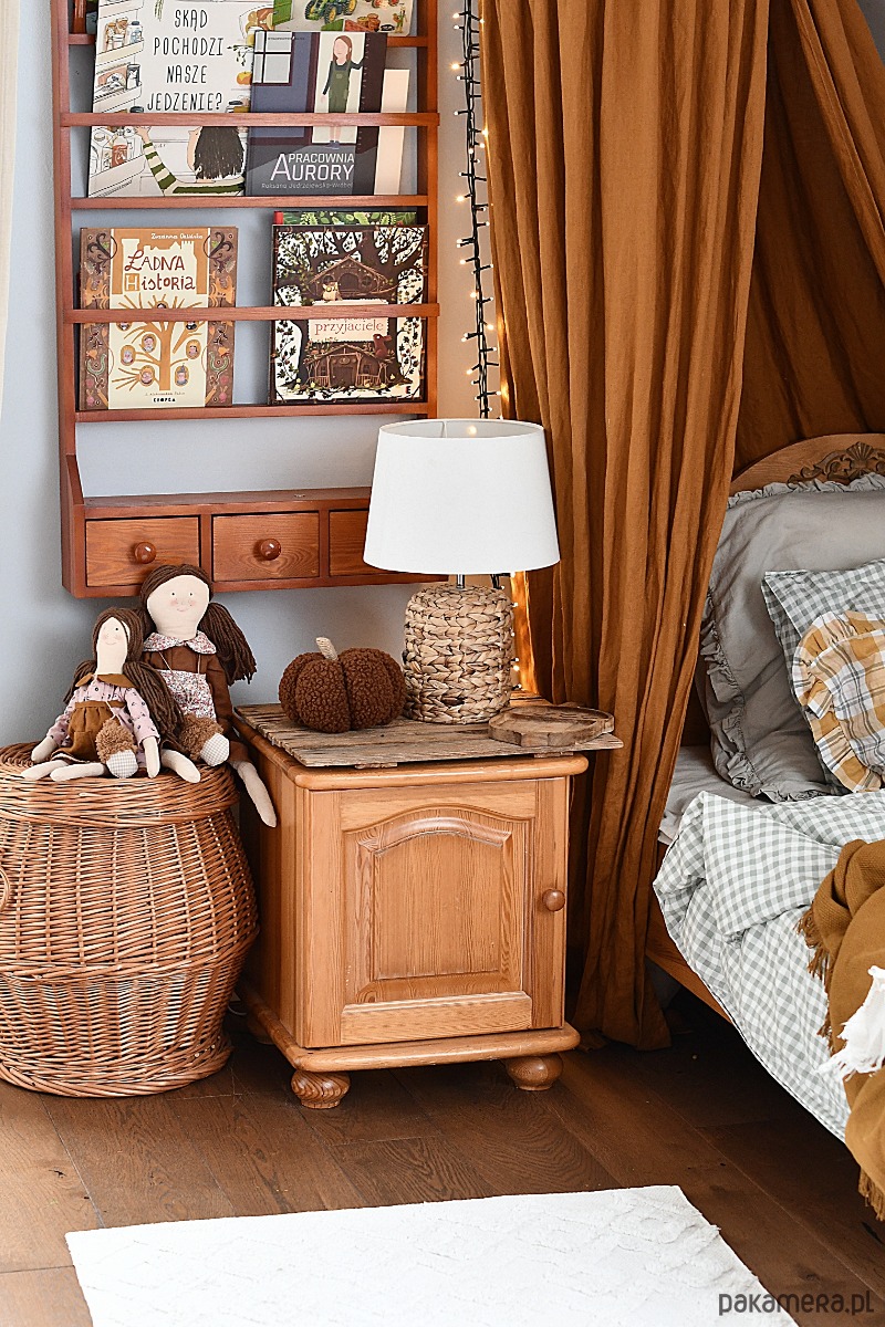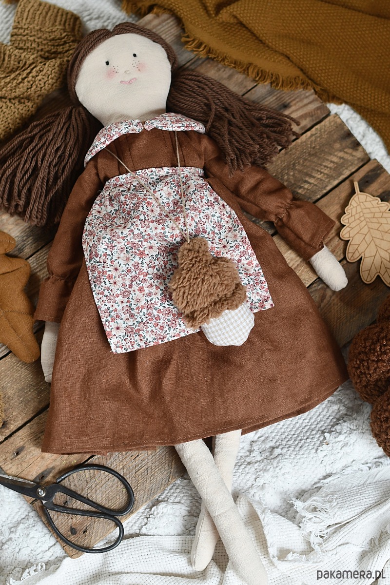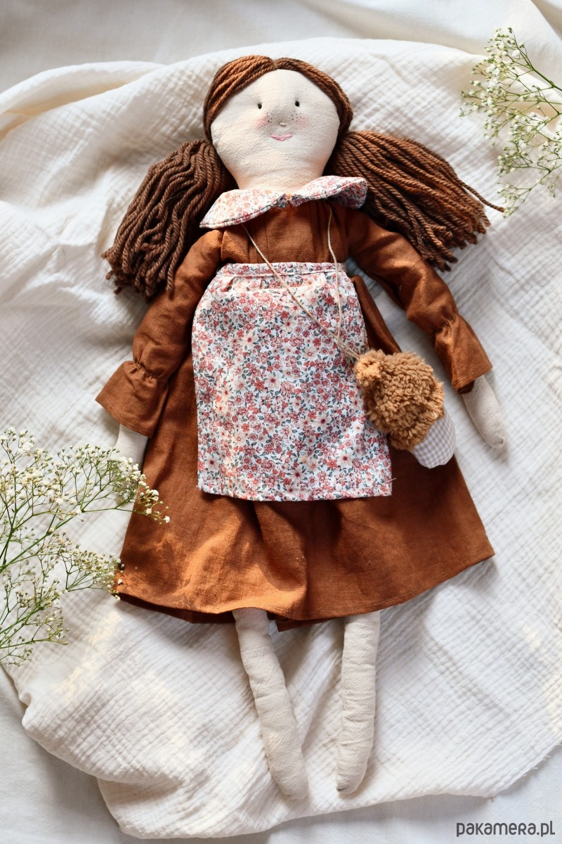 Lalka ma brązową sukienkę z lnu, bawełniany fartuszek w kwiaty oraz zawieszkę w kształcie żołędzia.