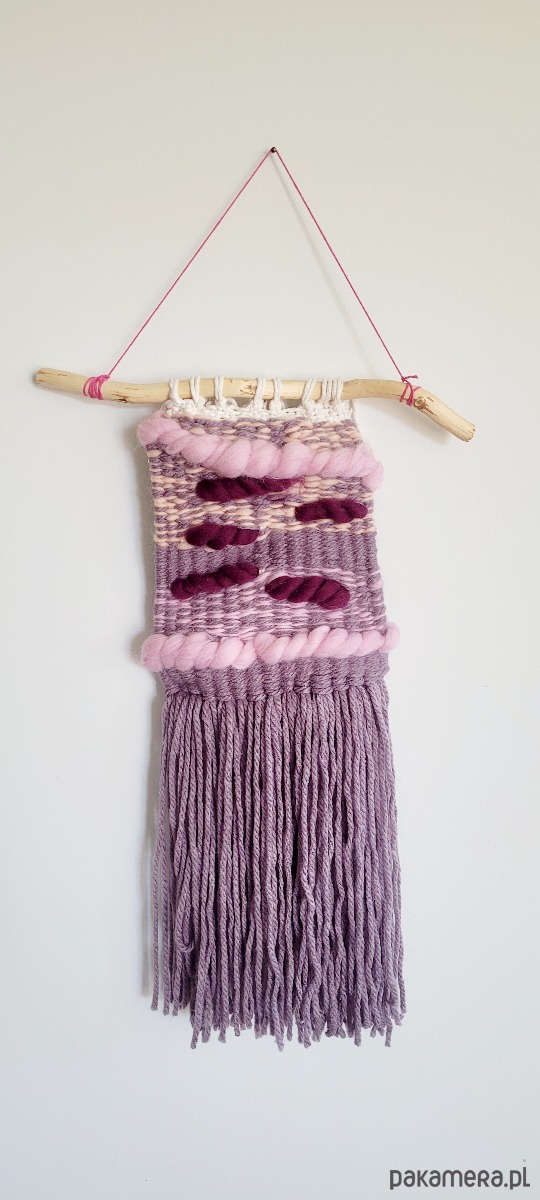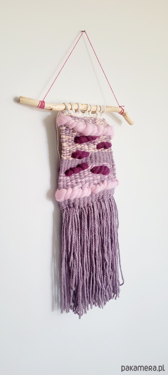 Każdy detal tej pracy został wykonany ręcznie – od gęstych splotów, przez miękkie przędze, po warkocze i fantazyjne włóczki. Dzięki temu tkanina nabiera unikatowego charakteru. Naturalna gałąź stanowi bazę kompozycji, podkreślając jej organiczny i artystyczny wymiar. Ta dekoracja wprowadzi do wnętrza wyjątkowy klimat. Idealna do salonu, sypialni, pracowni lub jako prezent dla miłośników sztuki i rękodzieła.