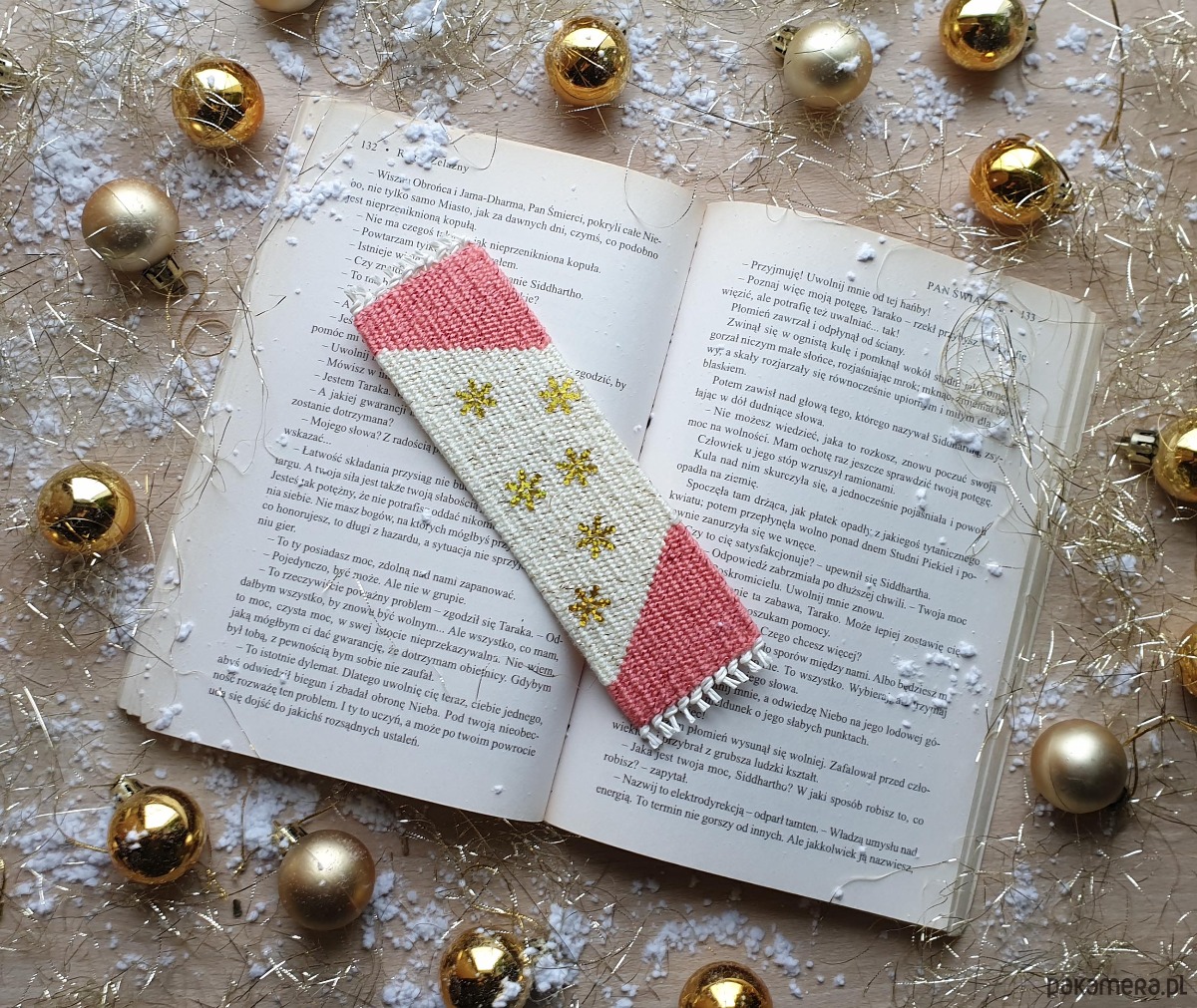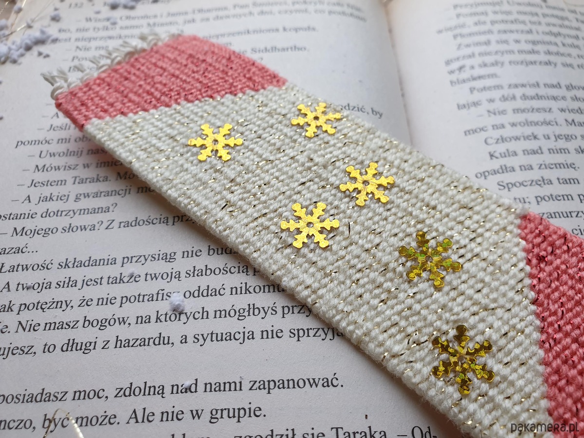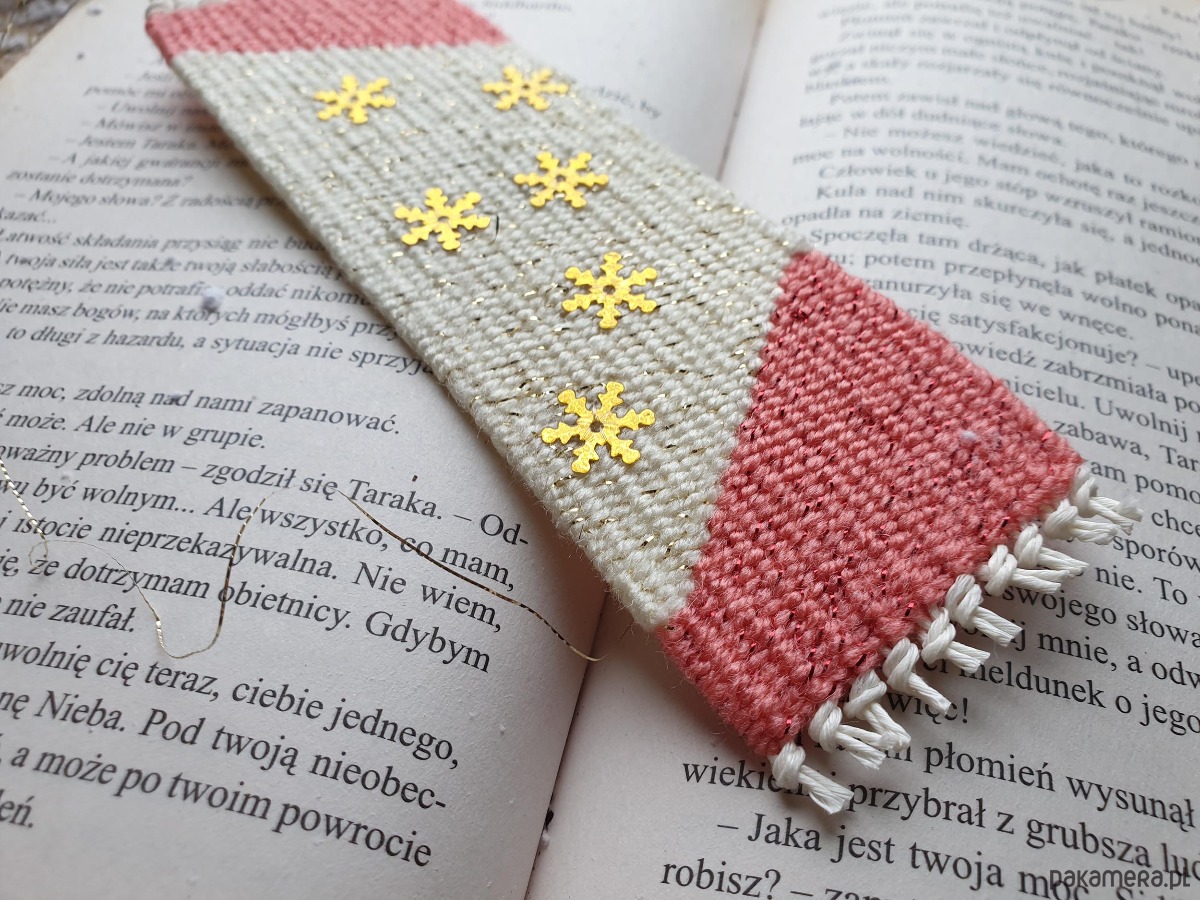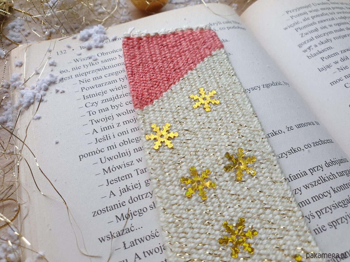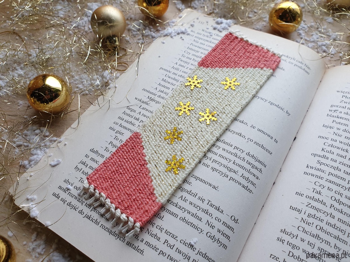 Ręcznie tkana zakładka do książki ozdobiona subtelnymi, błyszczącymi śnieżynkami.