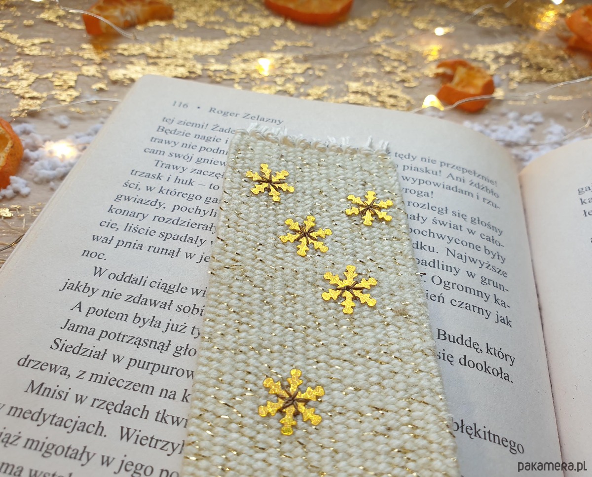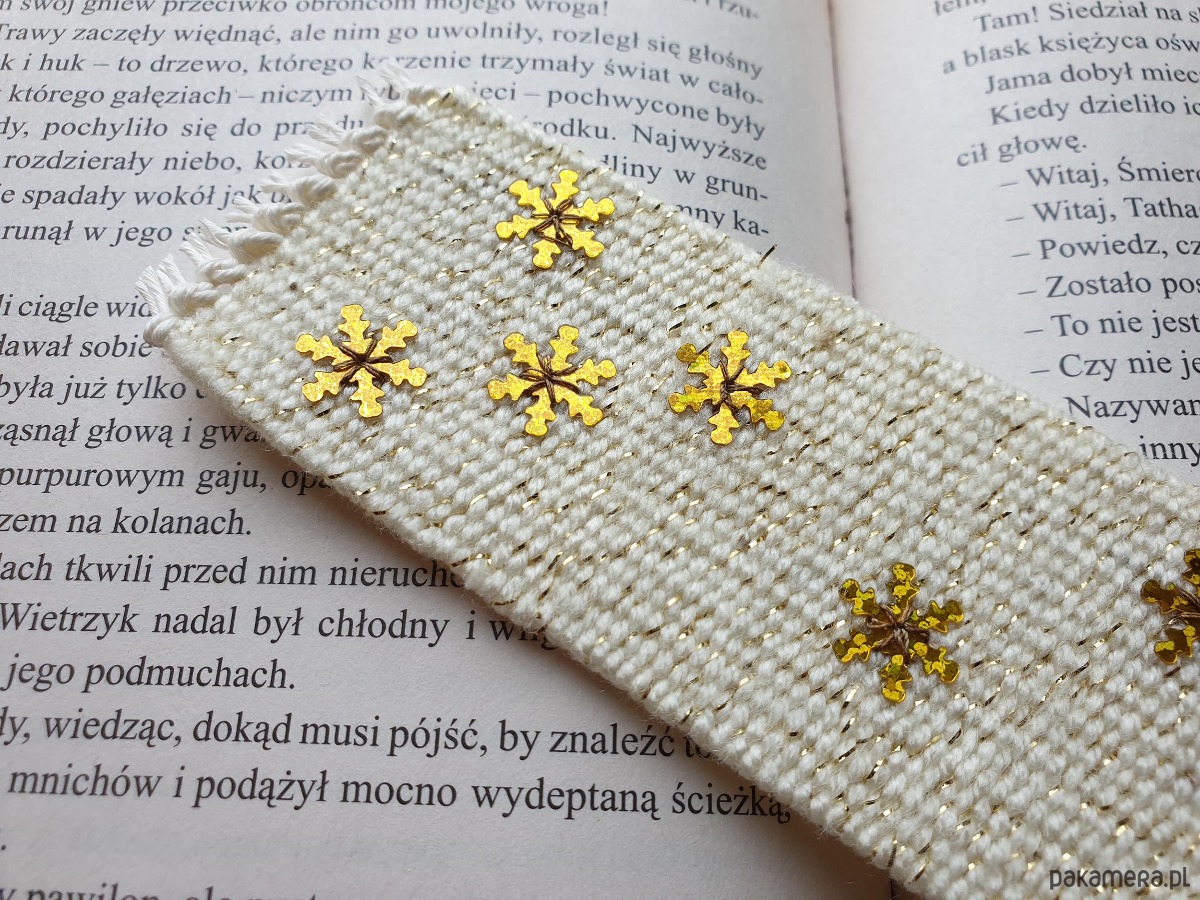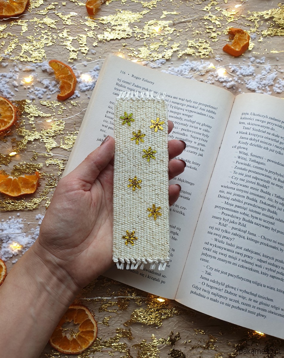 Ręcznie tkana zakładka ozdobiona błyszczącymi, subtelnymi śnieżynkami, które migoczą przy każdym ruchu.