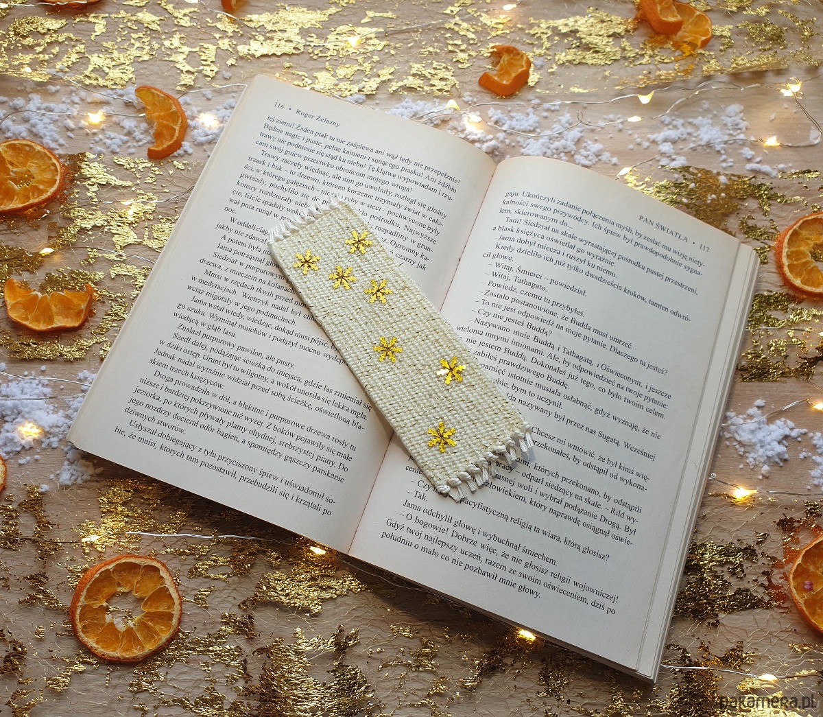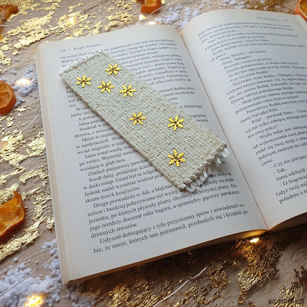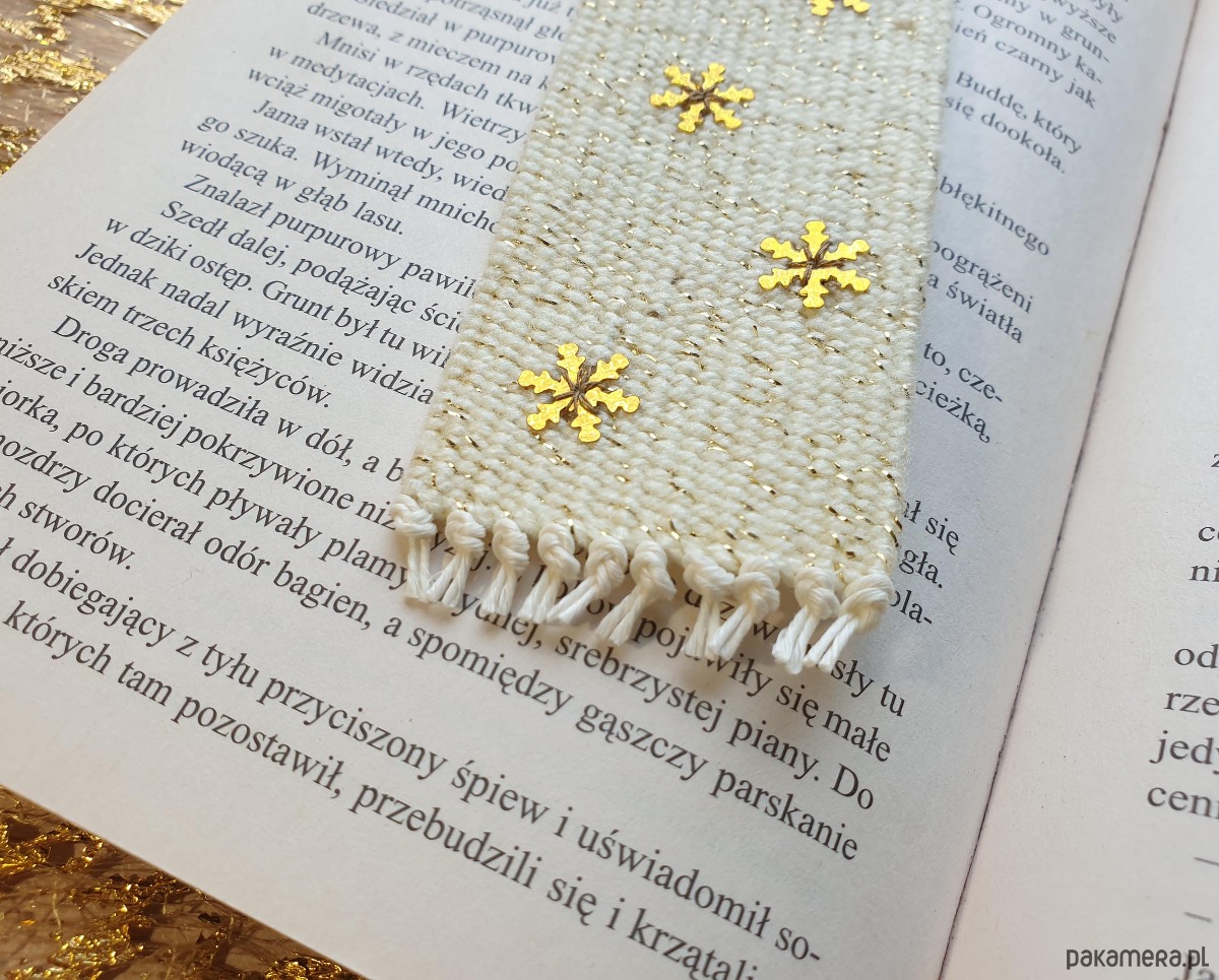 Ręcznie tkana zakładka ozdobiona błyszczącymi, subtelnymi śnieżynkami, które migoczą przy każdym ruchu.