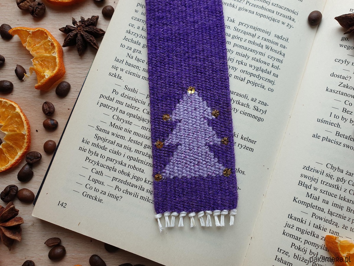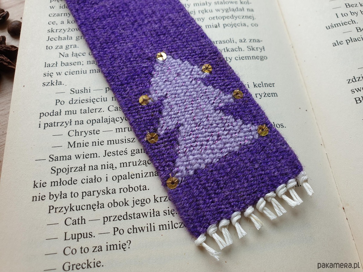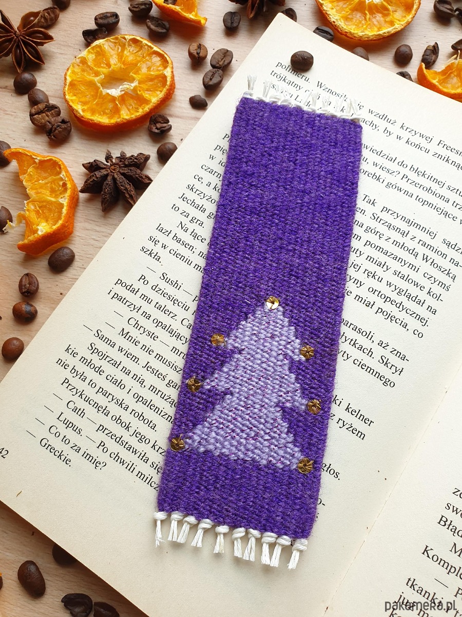 Delikatna, ręcznie tkana fioletowa zakładka z choinką, migoczącą jak zimowy wieczór w świetle księżyca.